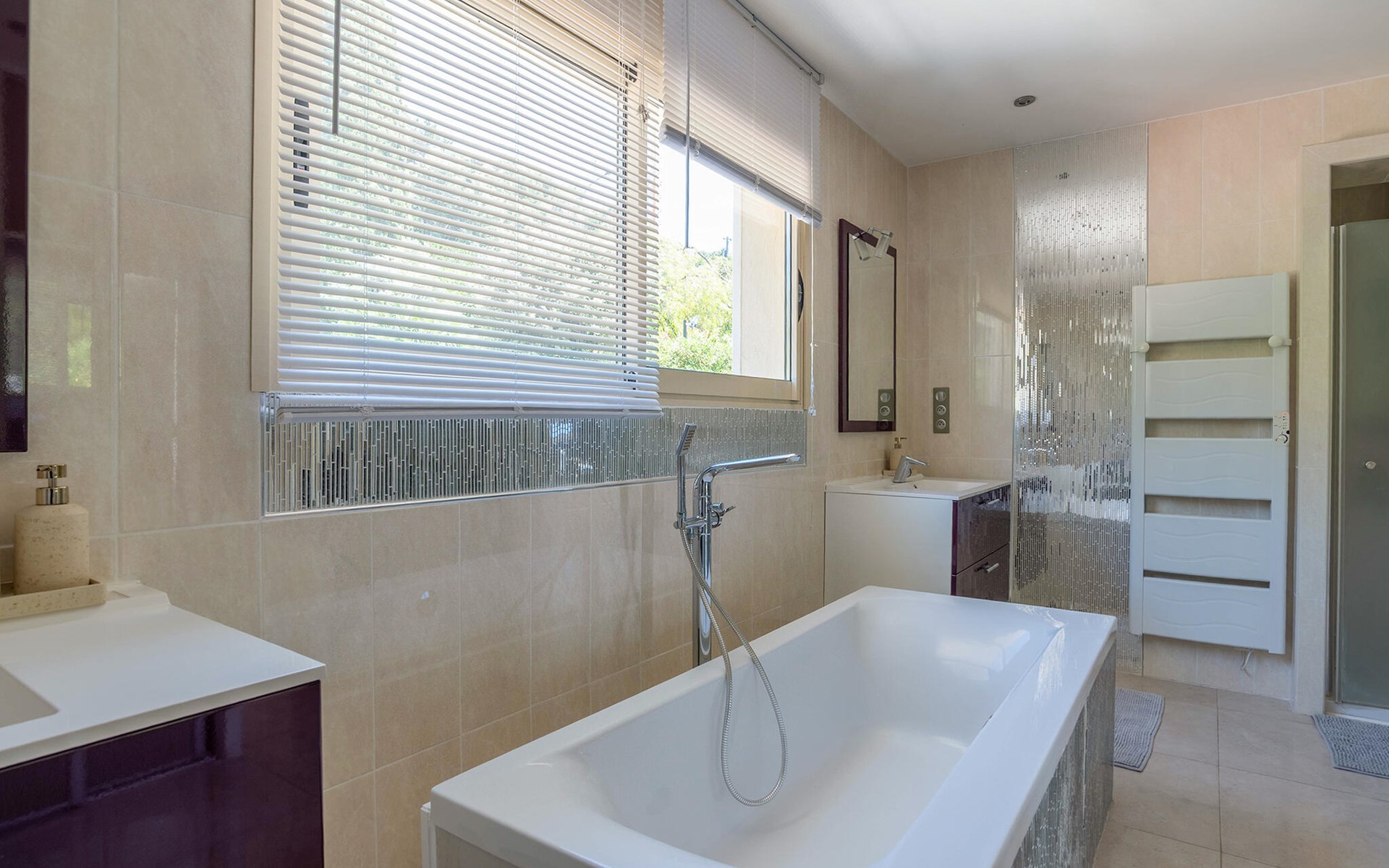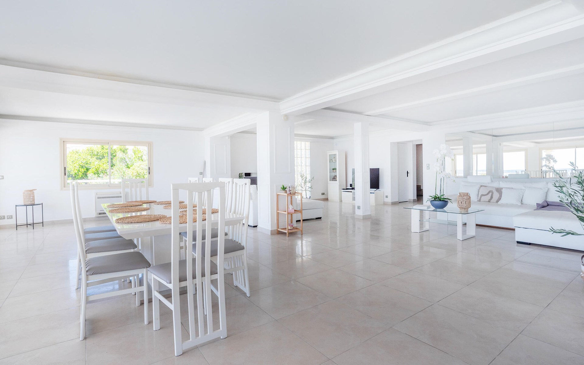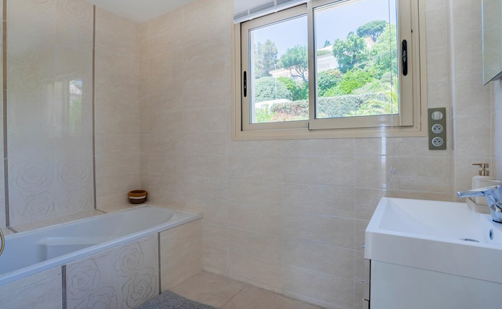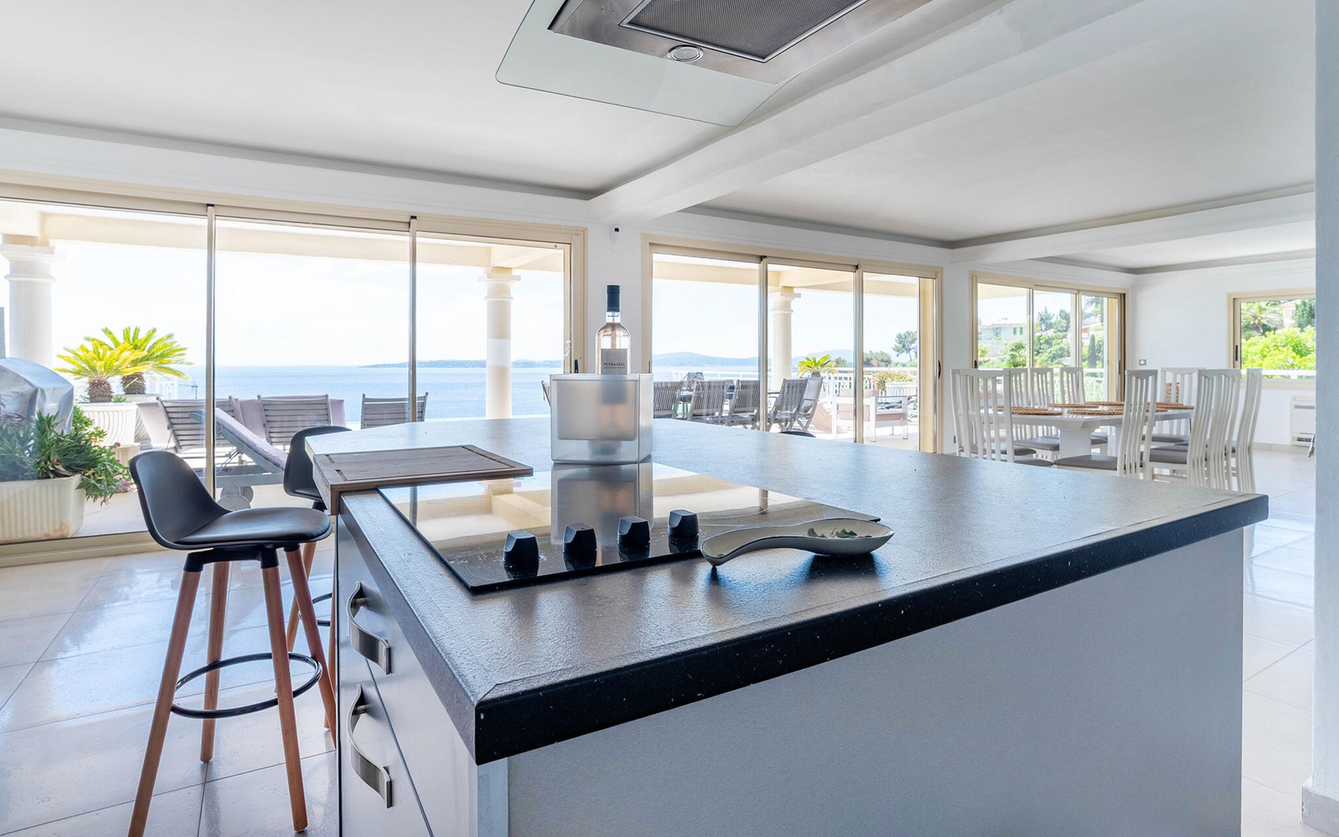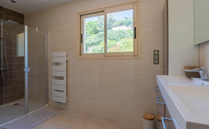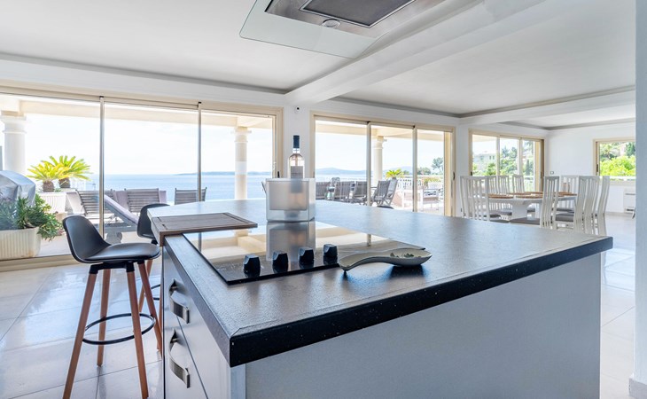 This exclusive villa with stunning sea views awaits you in the heights of Les Issambres. Enjoy peace, comfort and Mediterranean elegance in this stylish home. Be welcomed by the light-flooded living area, which is characterised by its spaciousness and clean lines. Relax on the elegant sofa area and enjoy your free holiday time together. Prepare culinary delights in the modern kitchen with cooking island. Large window fronts harmoniously connect indoor and outdoor areas.