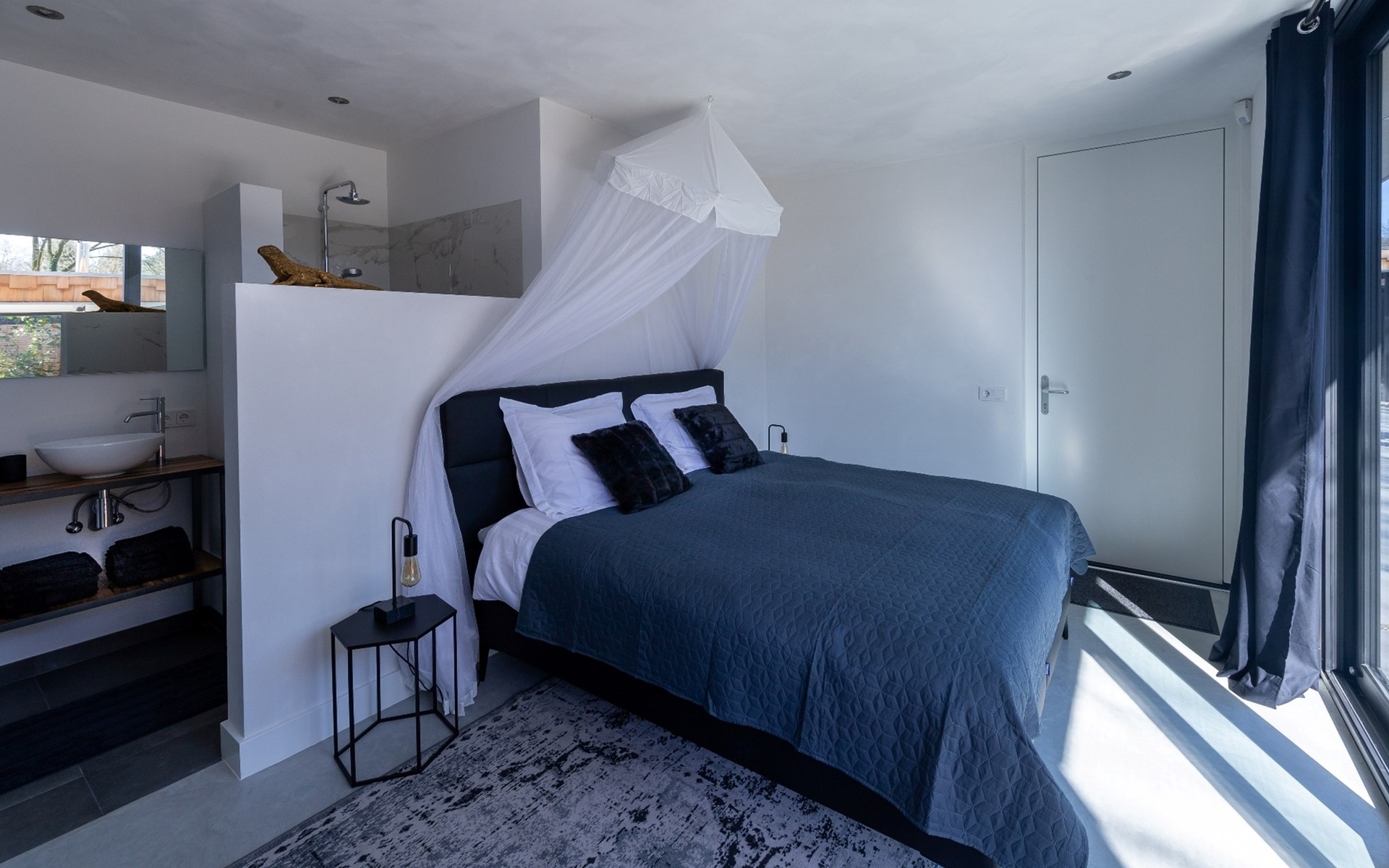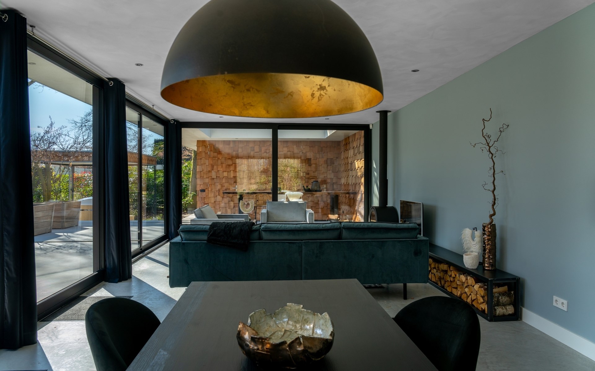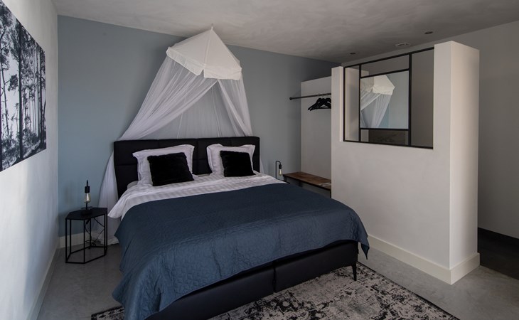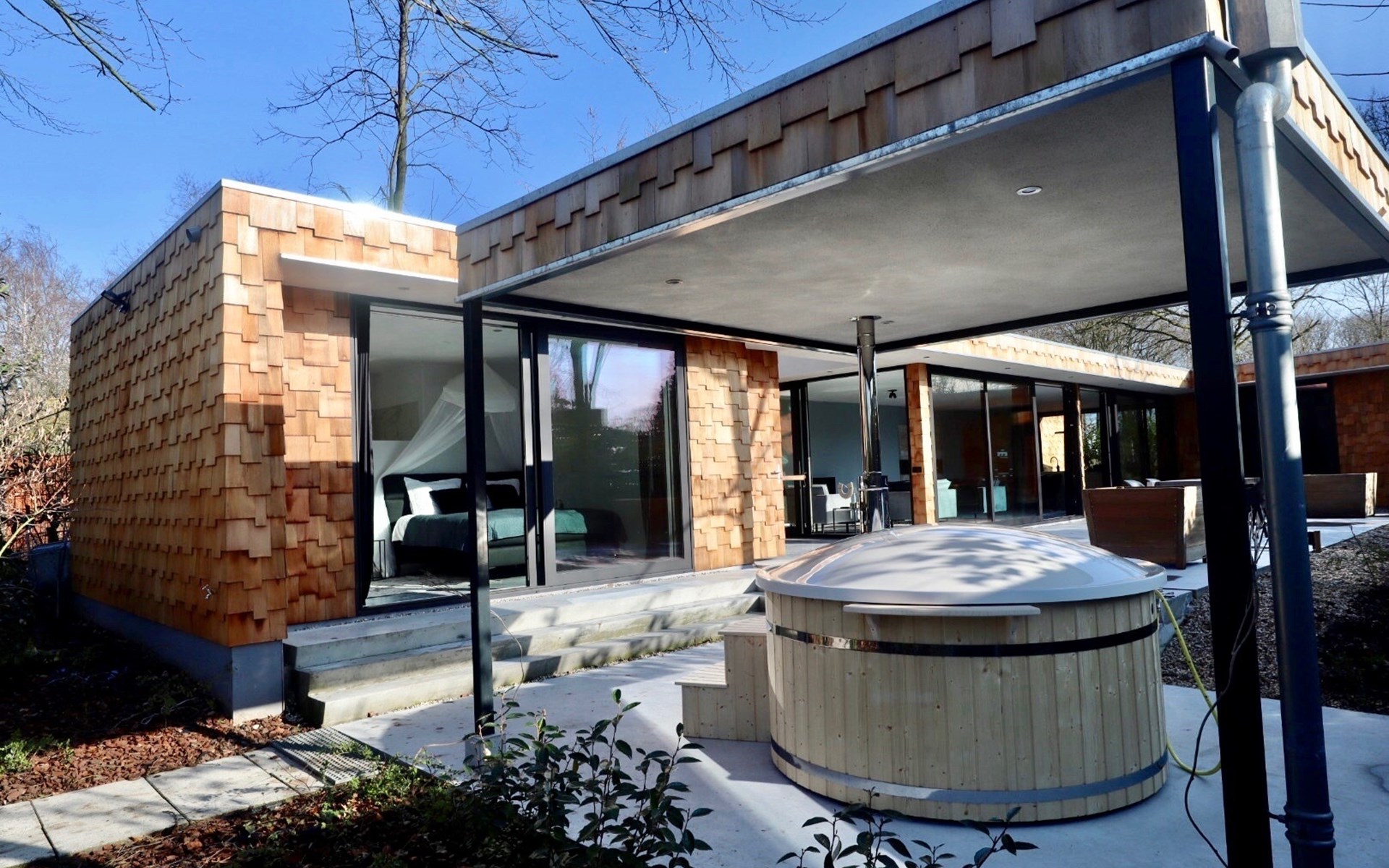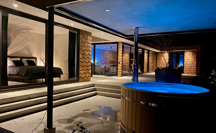 Are you looking for a special place to unwind, with luxury, a trendy interior, and wellness in a green setting? Then you have come to the right place. The 'Houten Boshuis' has recently been built and is made of cedar wood. It is the sister of the 'Betonnen Boshuis' and 'Stalen Boshuis' and is located in a wooded area near Breda. From home, you can enjoy lovely walks and bike rides. The owners have a passion for spatial design and art. The architecture and interior design make use of wood, concrete, and glass, combined with modern comfort. The result is surprising and unique, harmonizing with the rural surroundings.