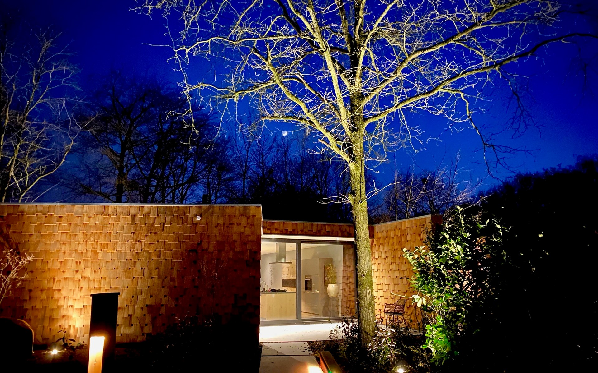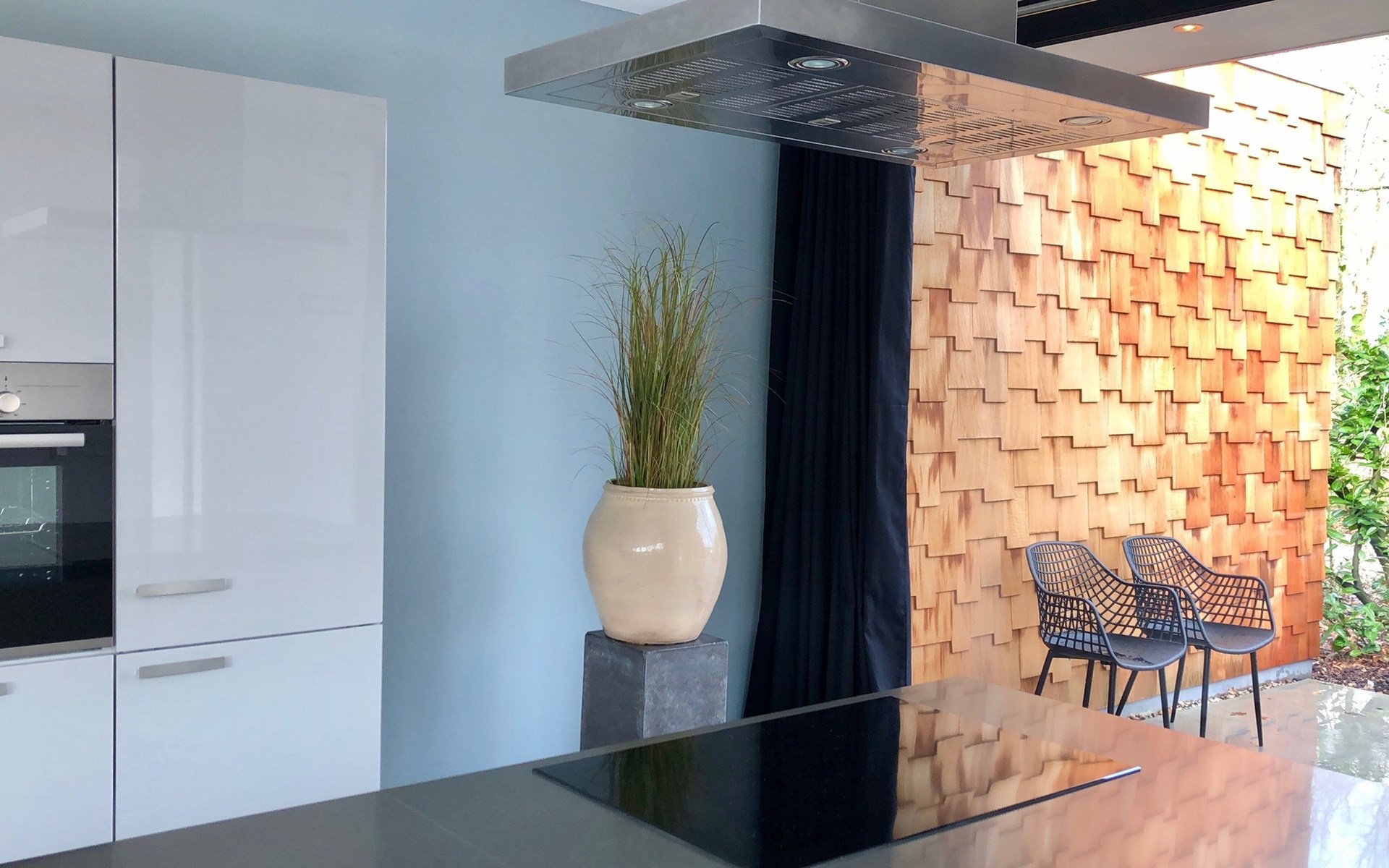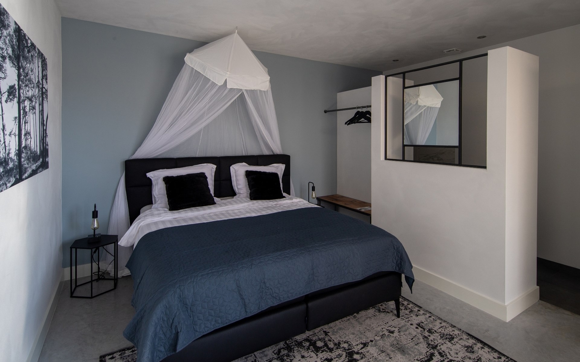 Are you looking for a special place to unwind, with luxury, a trendy interior, and wellness in a green setting? Then you have come to the right place. The 'Houten Boshuis' has recently been built and is made of cedar wood. It is the sister of the 'Betonnen Boshuis' and 'Stalen Boshuis' and is located in a wooded area near Breda. From home, you can enjoy lovely walks and bike rides. The owners have a passion for spatial design and art. The architecture and interior design make use of wood, concrete, and glass, combined with modern comfort. The result is surprising and unique, harmonizing with the rural surroundings.