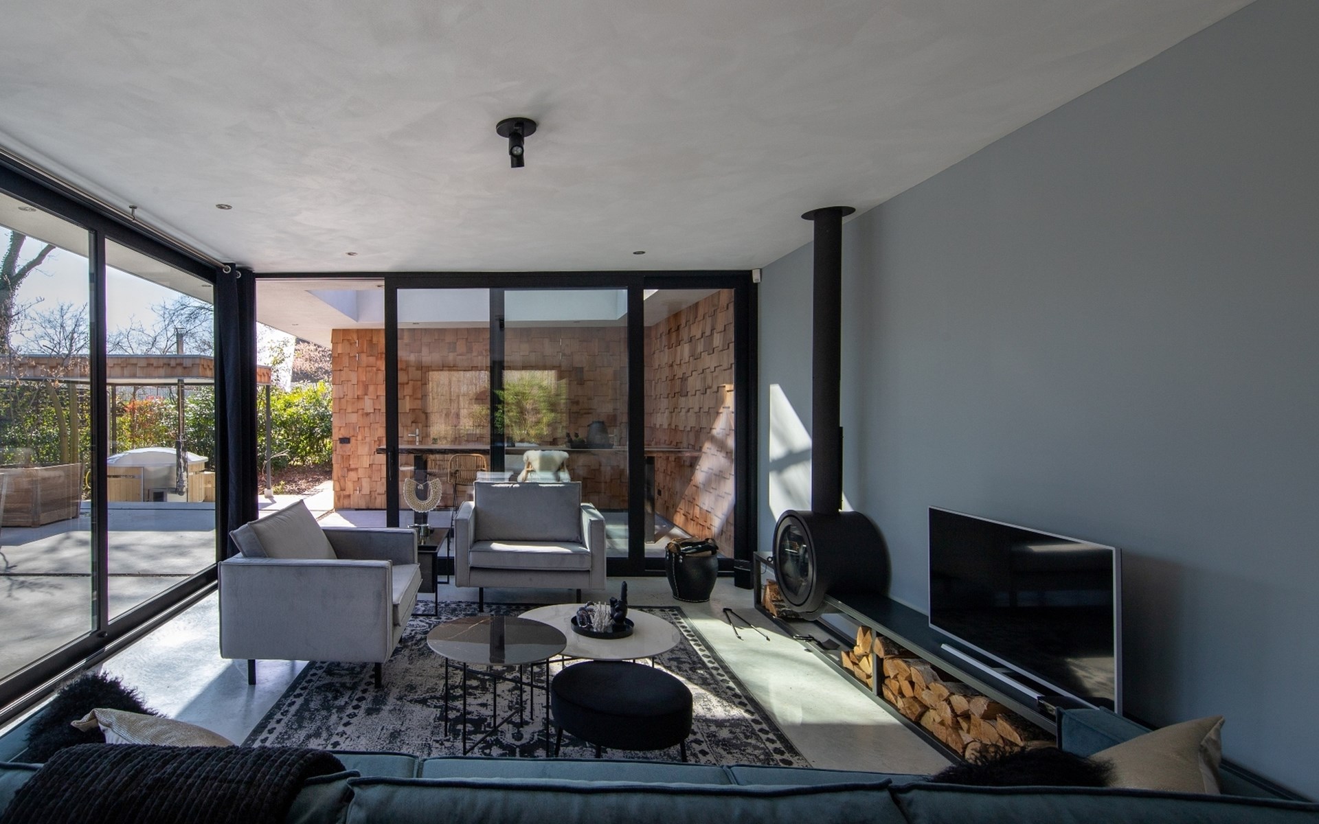The spacious house is completely on one level, without thresholds, and is equipped with a poured floor with underfloor heating. Entrance with wardrobe and toilet. The living room has a modern decor with contemporary furniture such as a lounge sofa, fireplace (firewood available for a fee), flat-screen TV, and sound system (music channels and playback via smartphone). Along the entire length is a glass facade making the living area wonderfully bright. In nice weather, the doors can be opened to the terrace. On the terrace, there is a concrete dining table with chairs and 2 lounge chairs.