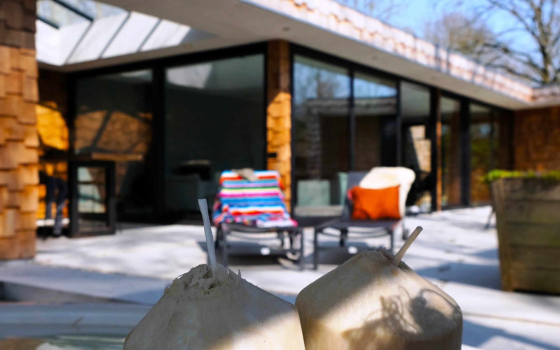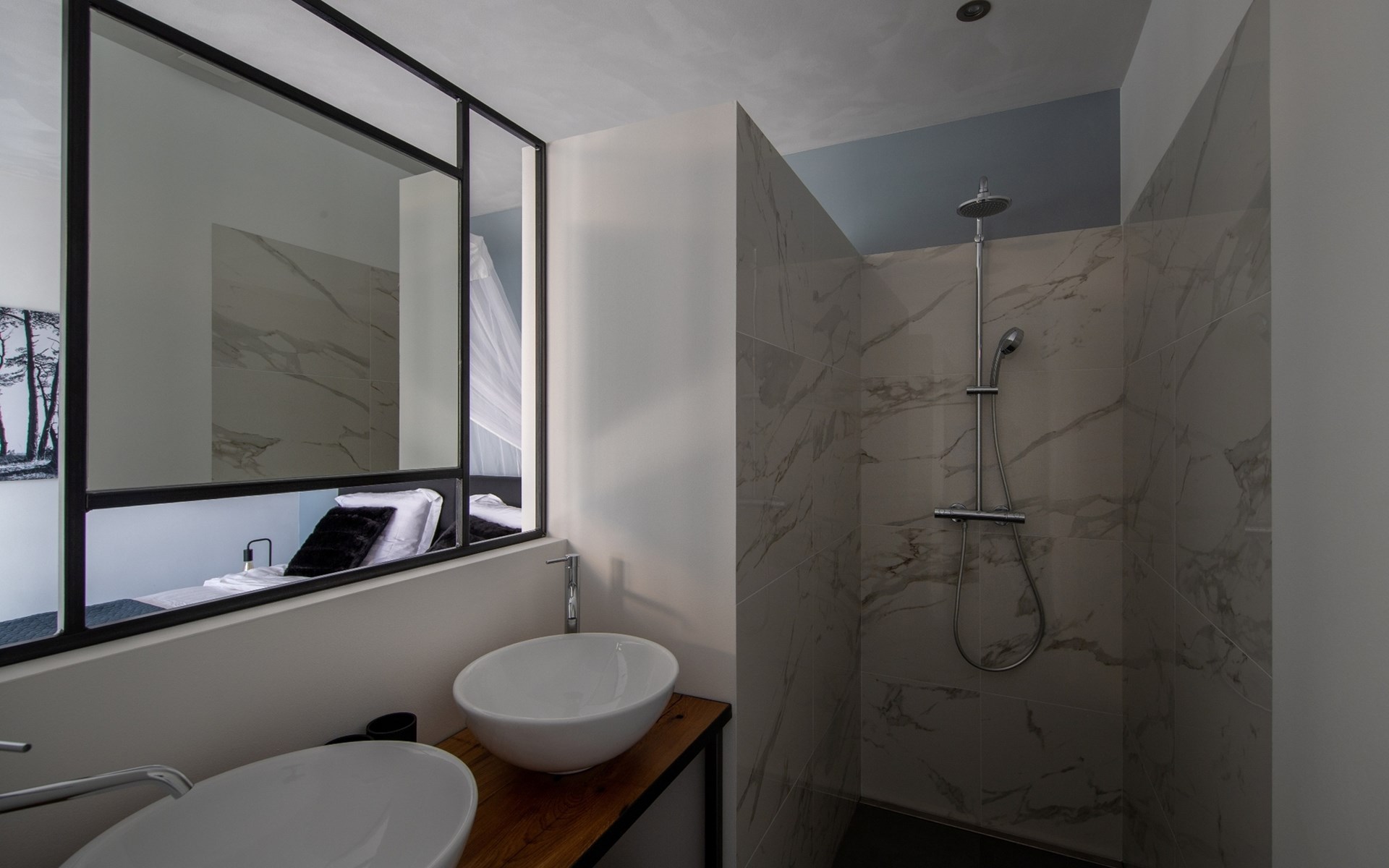 Open kitchen with a large work surface, ceramic cooktop, dishwasher, large refrigerator, small freezer, oven, Nespresso machine (bring your own pods) and Quooker. Wooden dining table with 4 chairs. The terrace at the front borders the kitchen, where the sliding door can also be opened, making it a lovely spot to enjoy the morning sun, with 2 chairs available. The first bedroom has a double bed and a safe. It also has an en-suite bathroom with a walk-in (rain) shower, double sink, and toilet. The second bedroom is accessible via the terrace and is located in a separate space. It features twin beds (single mattresses and duvets) and hanging/storage space for your clothing. The en-suite bathroom has a walk-in (rain) shower, double sink, and toilet. Between the living room and the second bedroom, there is a covered area with a high table and chairs, a nice spot to enjoy a drink.