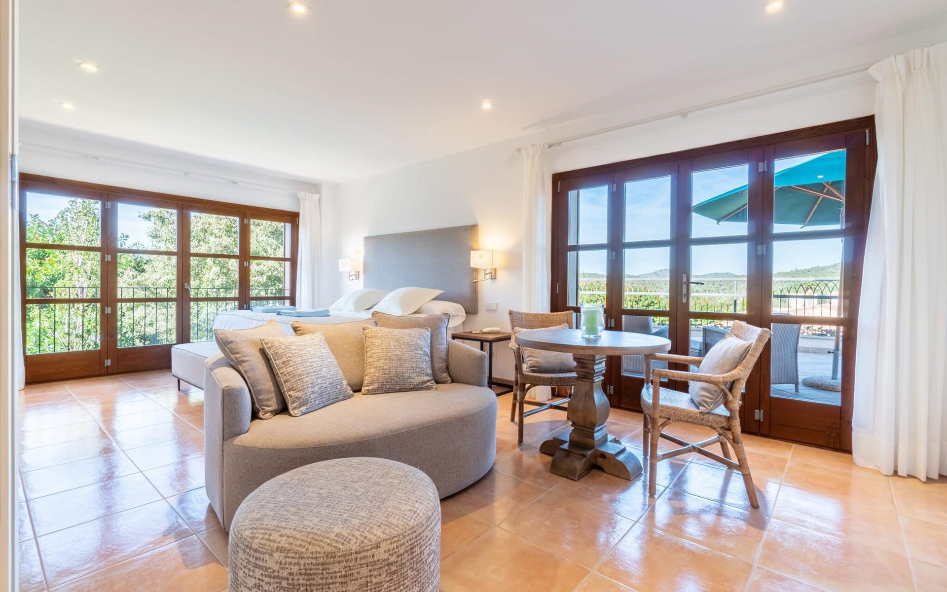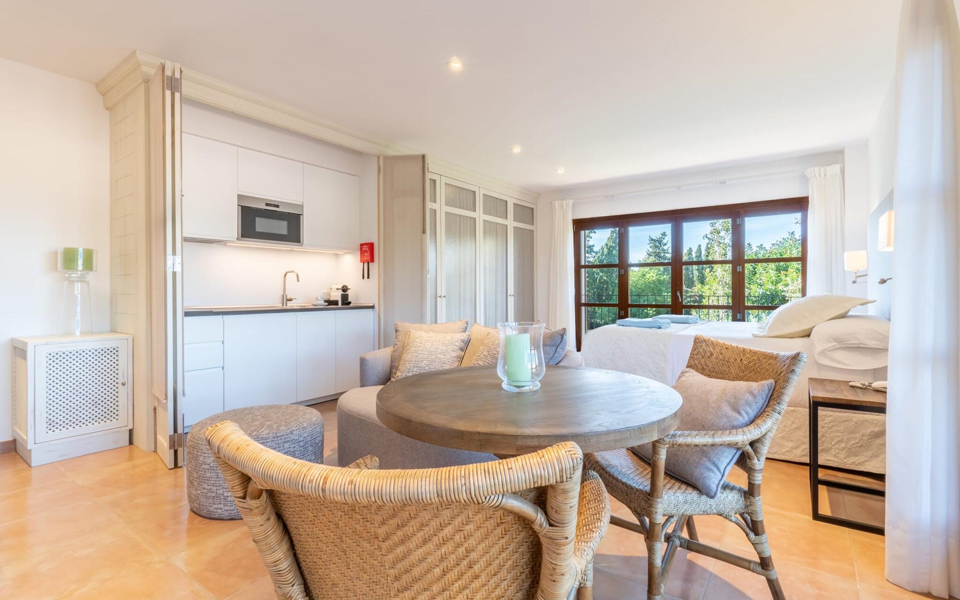 The spacious apartment with a large panoramic terrace impresses with its classic elegance. A cosy living area with comfortable seating, TV and dining table as well as a modern kitchenette and, of course, a large bed and a bathroom with bathtub and shower. This apartment in the south of Mallorca is ideal for a quiet wellness holiday for two.