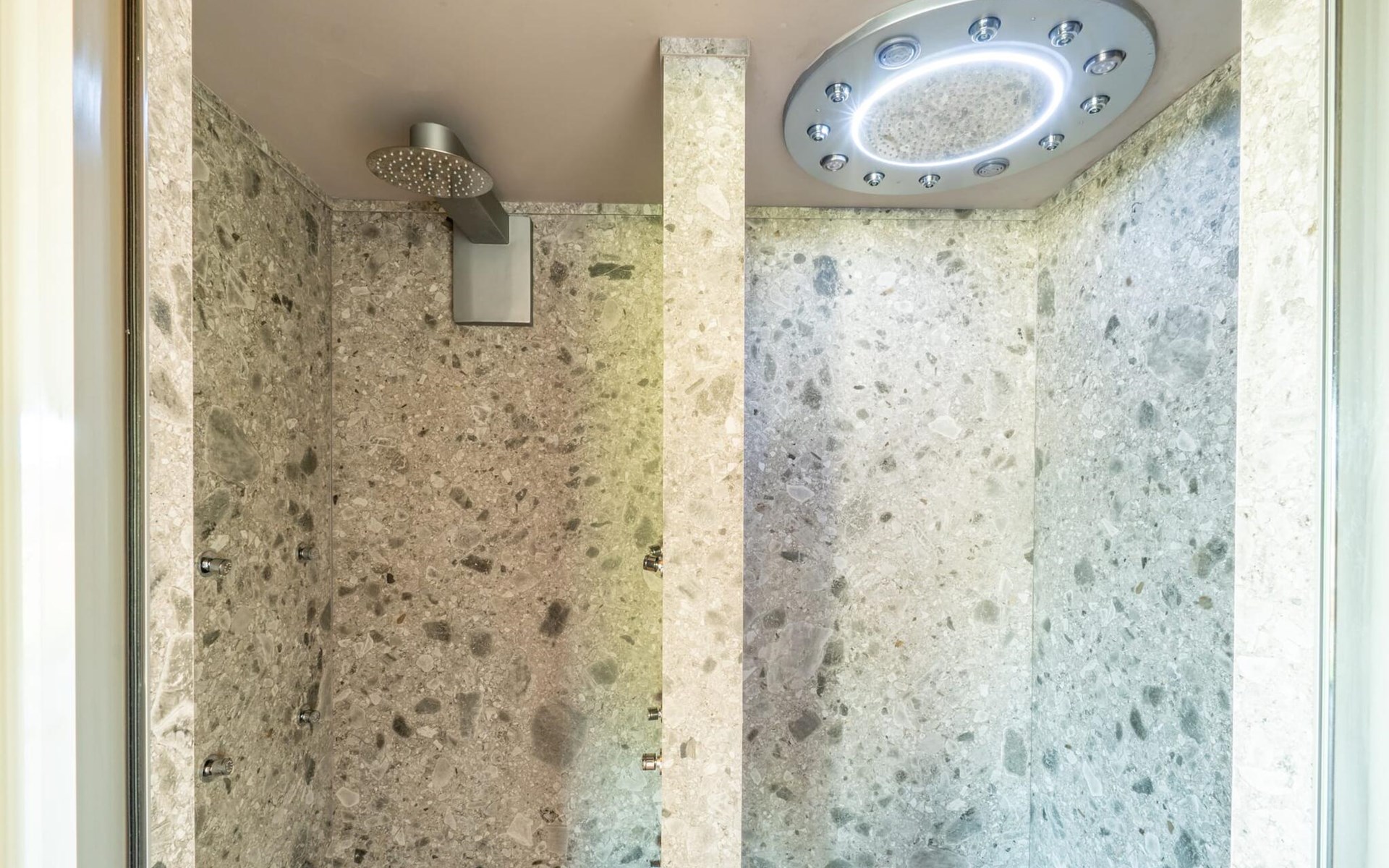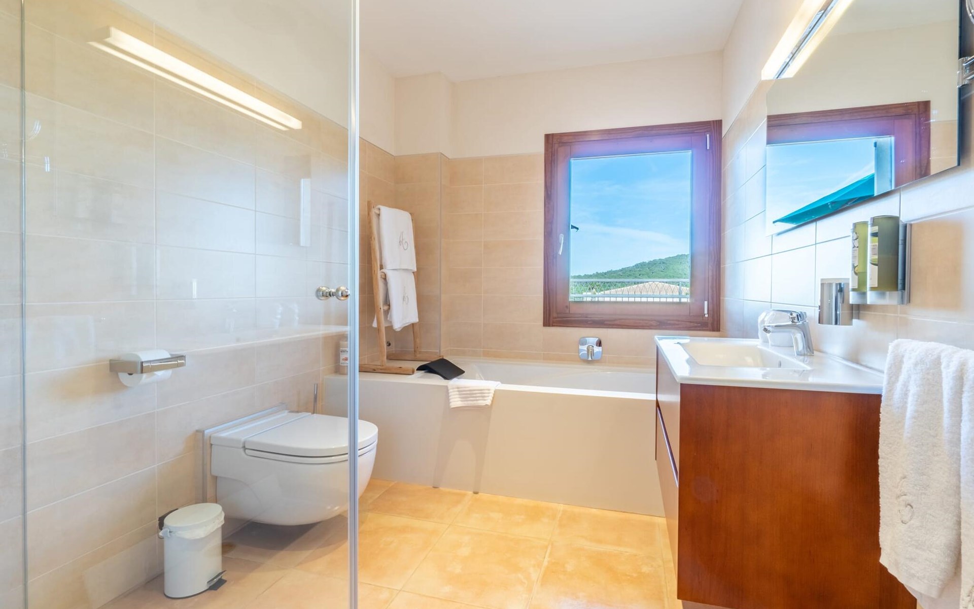 Various areas invite you to spend relaxing hours outdoors: comfortable sun loungers, lounge, dining table and cosy seating areas. From everywhere you can enjoy a marvellous view over the landscape. The 18 metre long pool, surrounded by ornamental plants and sunbathing areas, promises pleasant refreshment. If you like sports, you can use the tennis court or the fitness centre. For wellness moments, there is an extensive spa with sauna and Turkish bath. You can also make use of a versatile meeting room by appointment.