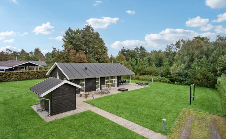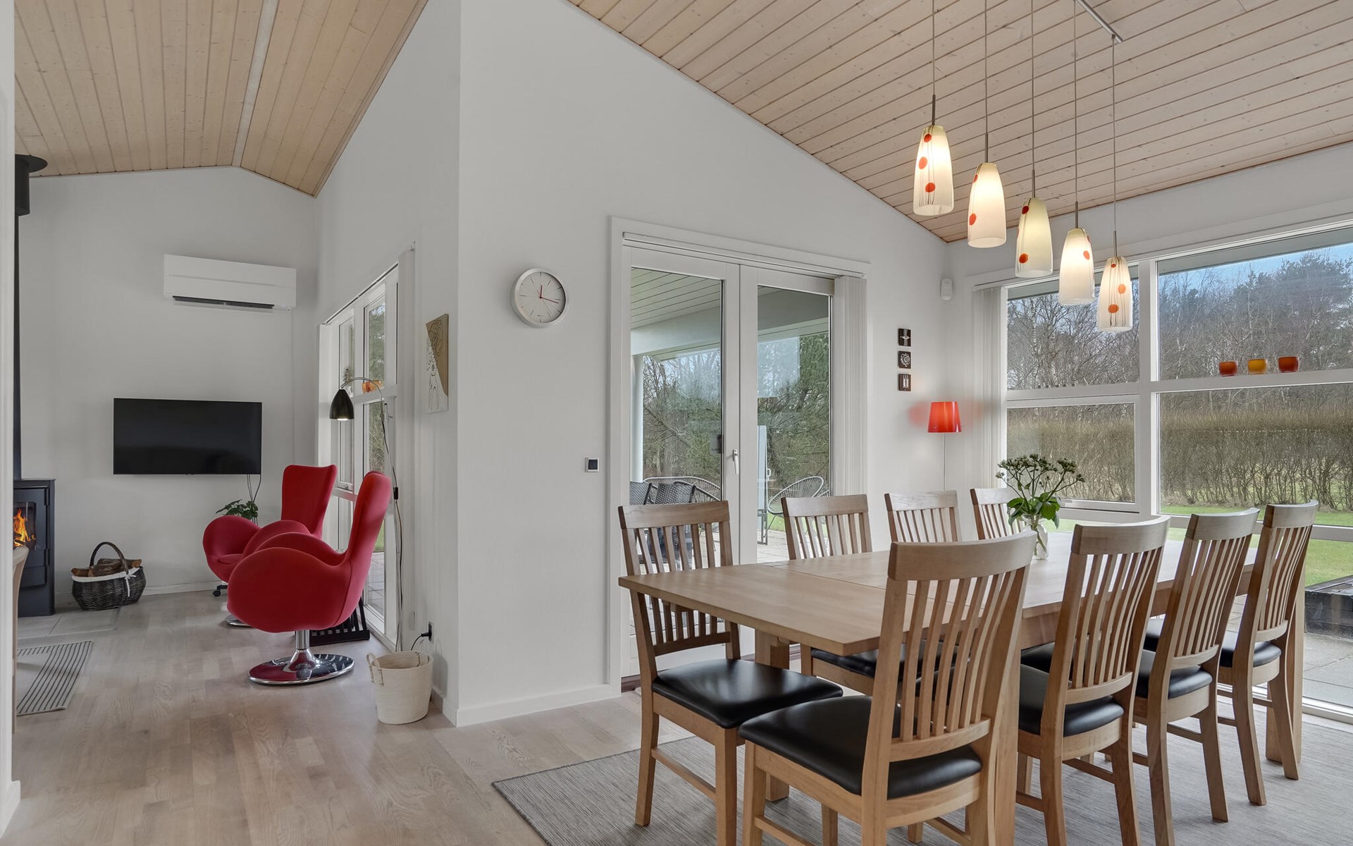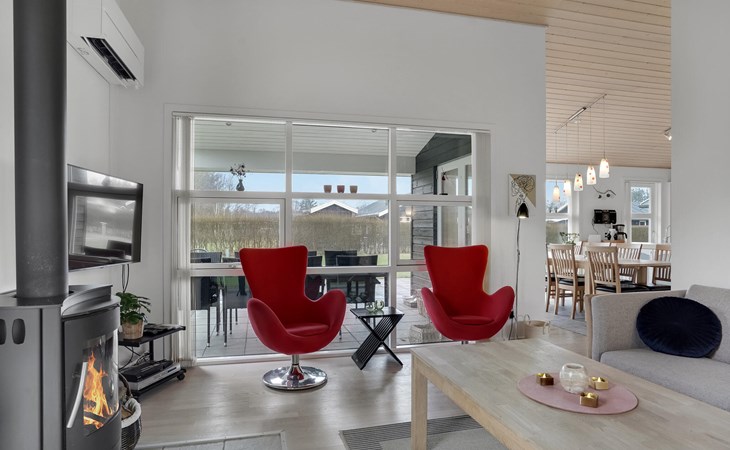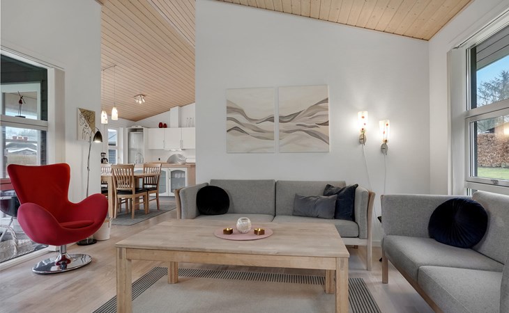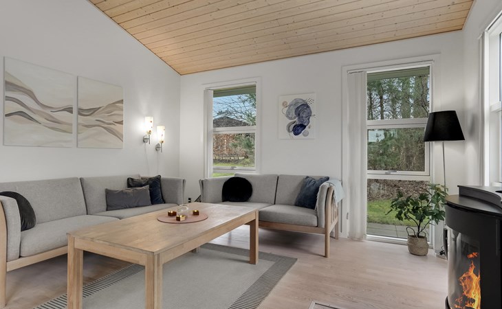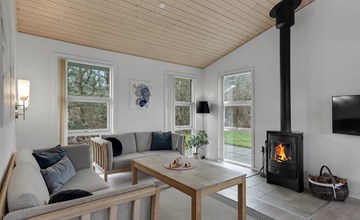 The modern furnishings and plenty of space for shared activities create a cosy feel-good atmosphere in the bright rooms of this house, which welcomes you surrounded by trees. Enjoy meals together with a view outside and relax with your family. Swim in the communal pool in a neighbouring building and then relax in the communal sauna. You can also relax in your own hot tub in the house. In the evening, make yourself comfortable on the inviting sofas, watch a film or chat late into the evening by the crackling wood-burning stove.