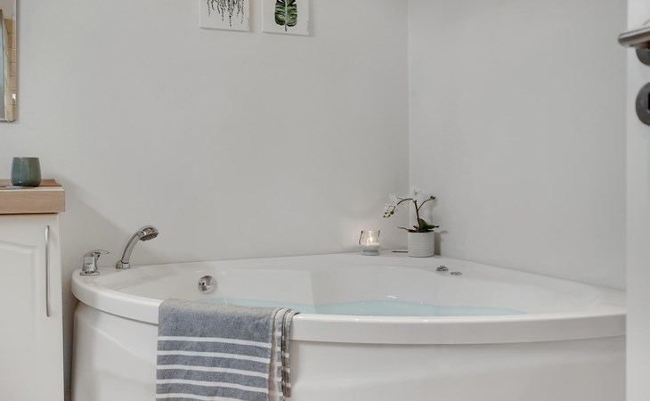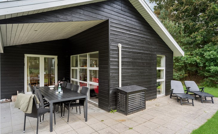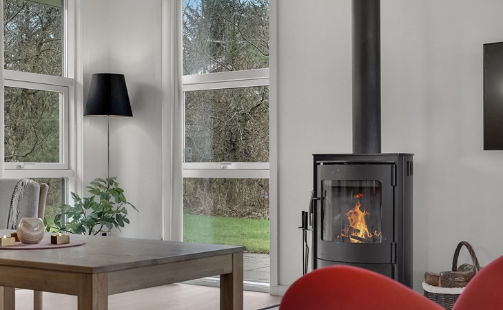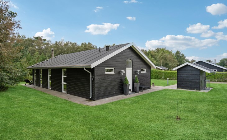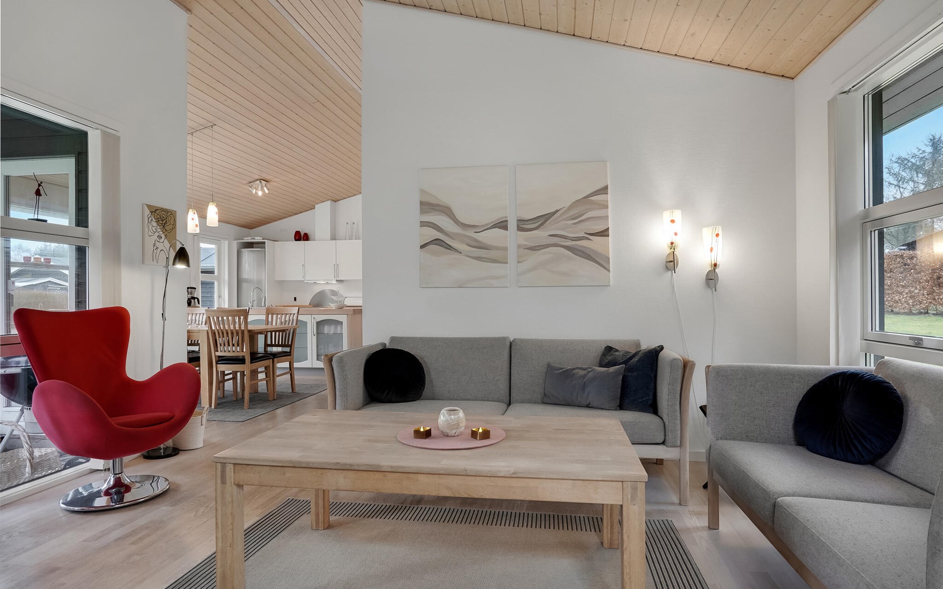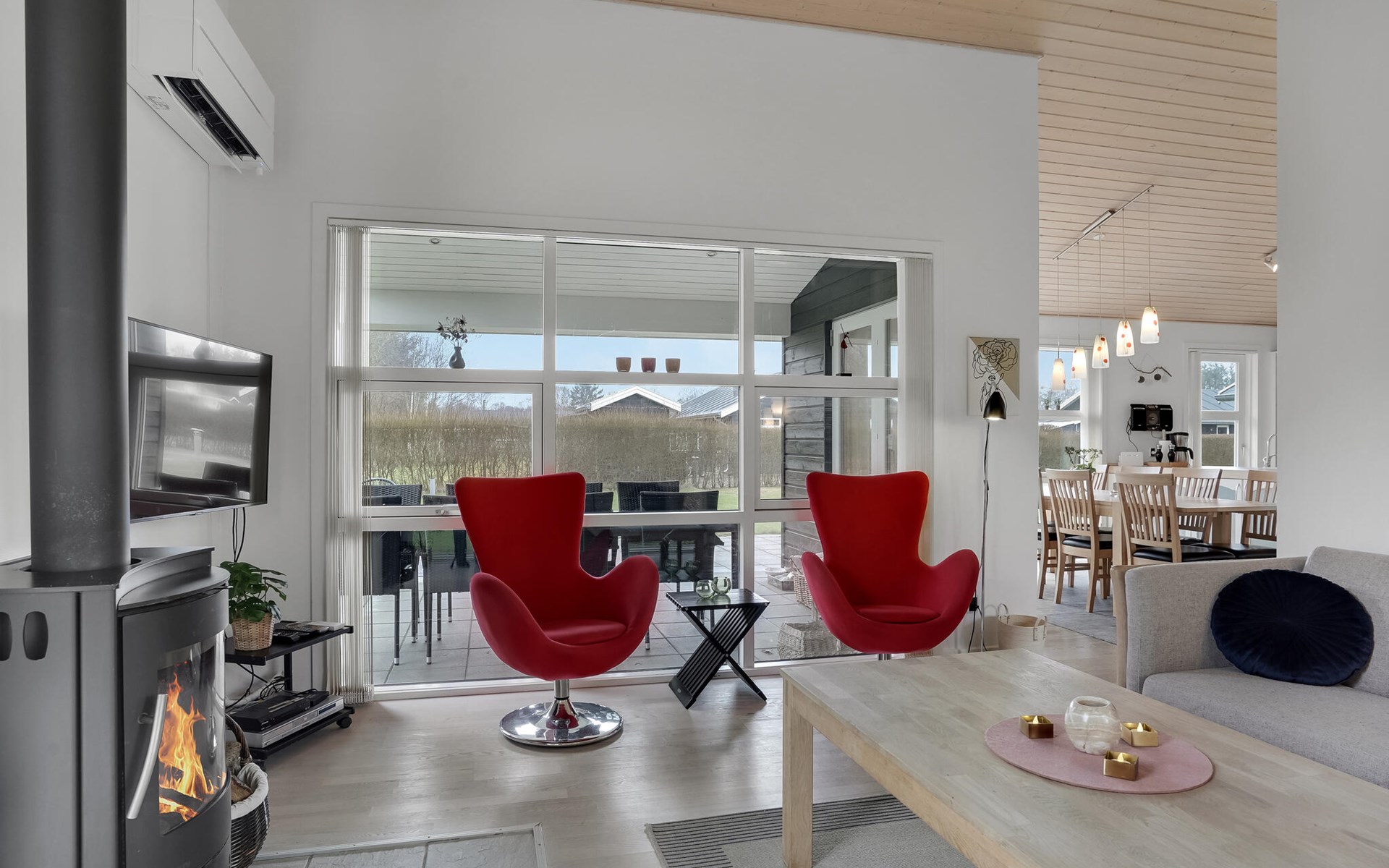 The modern furnishings and plenty of space for shared activities create a cosy feel-good atmosphere in the bright rooms of this house, which welcomes you surrounded by trees. Enjoy meals together with a view outside and relax with your family. Swim in the communal pool in a neighbouring building and then relax in the communal sauna. You can also relax in your own hot tub in the house. In the evening, make yourself comfortable on the inviting sofas, watch a film or chat late into the evening by the crackling wood-burning stove.