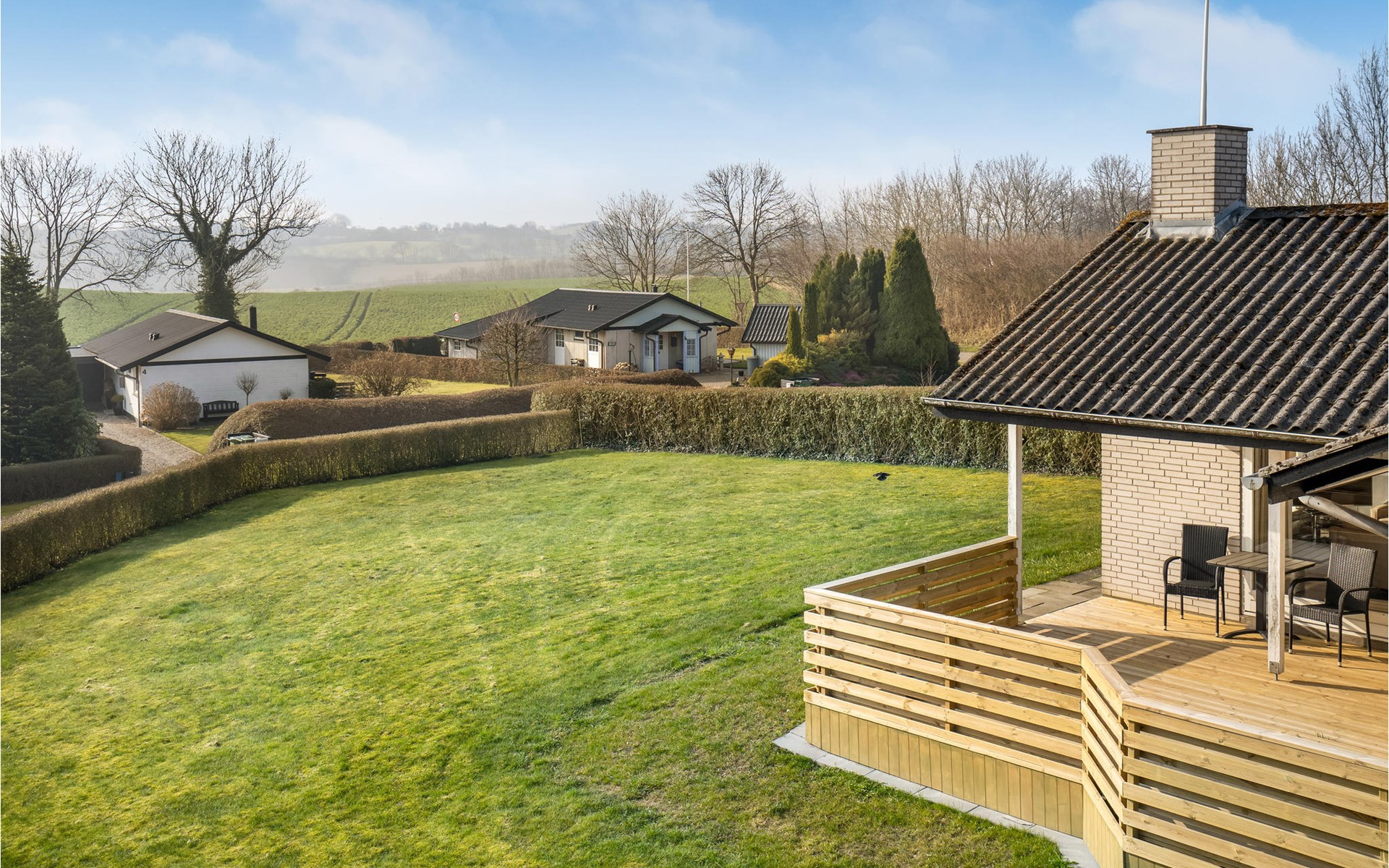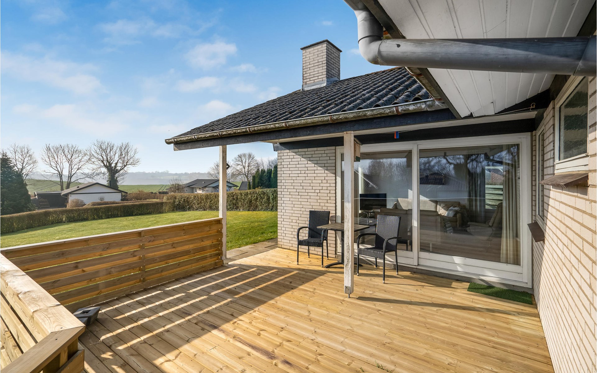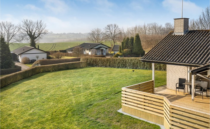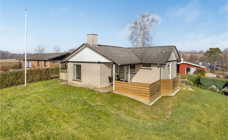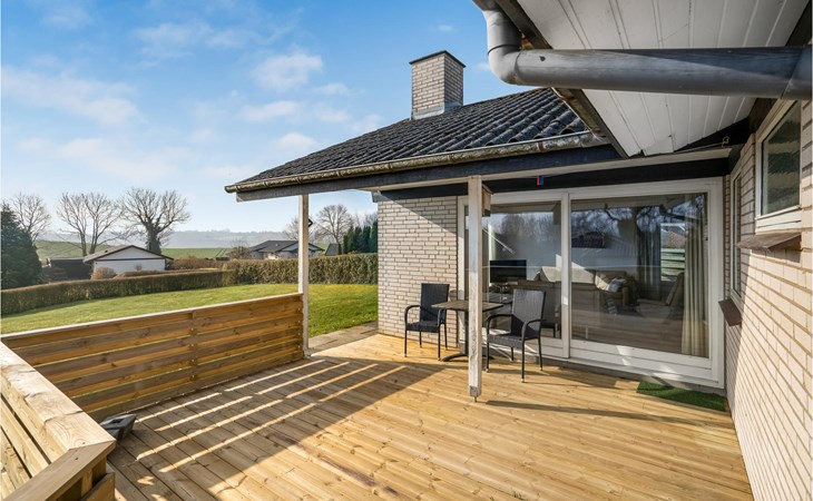 This vacation home invites you to a relaxing and pleasant vacation close to the Danish Baltic Sea beaches. Open the door in sunny weather, step out onto the large and partially covered terrace and enjoy the beautiful view of the countryside. The small table offers an ideal place for your morning coffee.