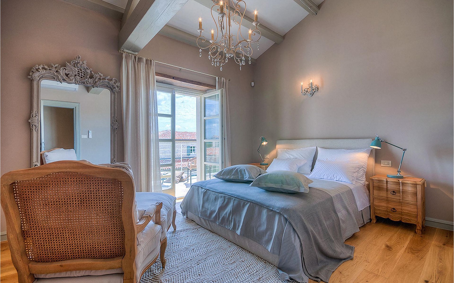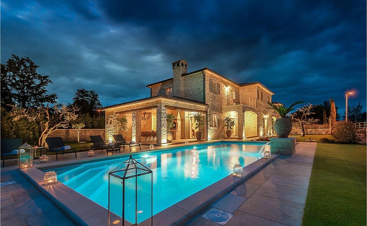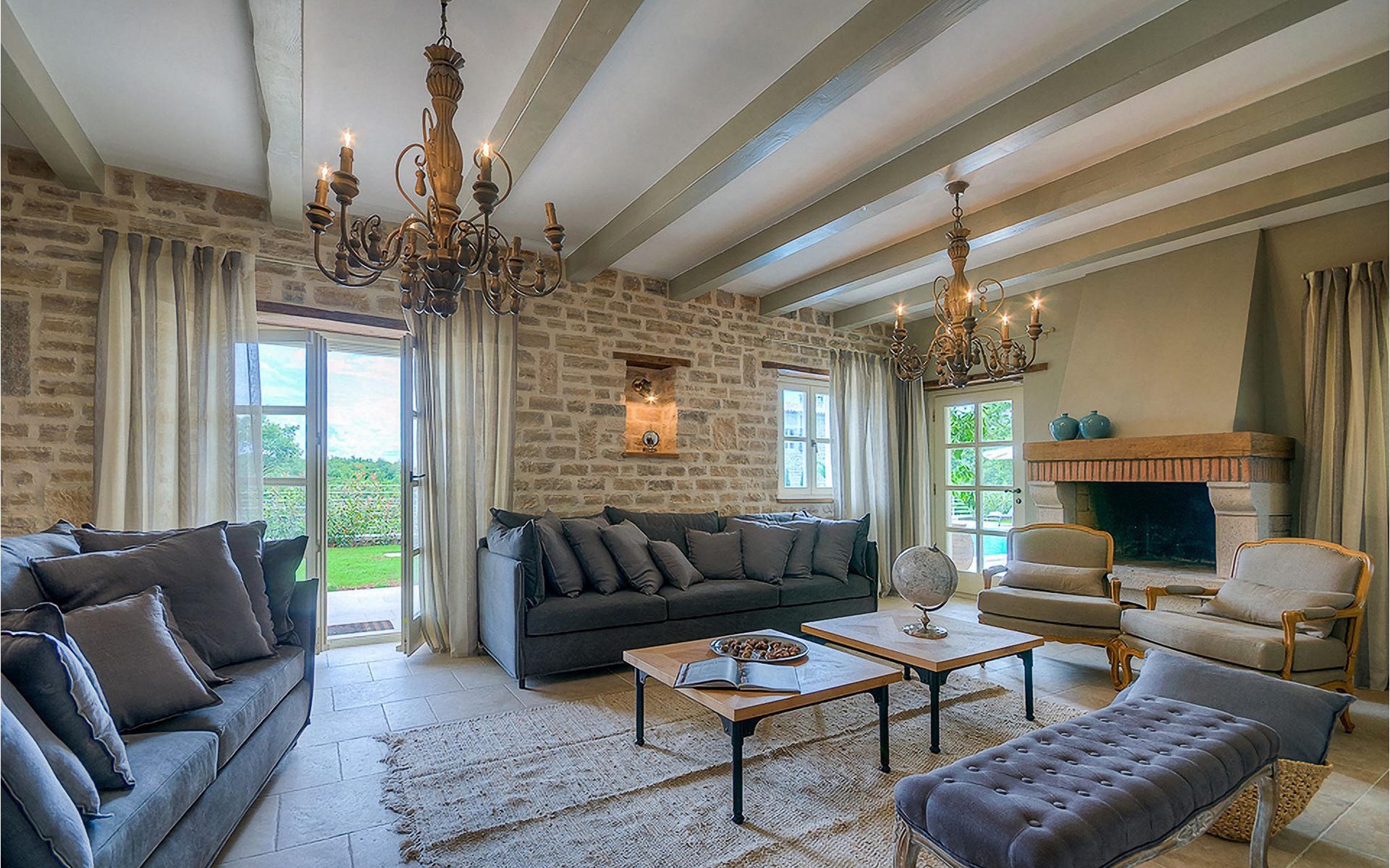 Elegant, stylish and superbly located amidst the picturesque Istrian countryside, yet still close to sunny beaches and lively coastal towns, Villa Elena offers luxurious accommodation where you can relax and enjoy every minute of your vacation. The first floor is entirely dedicated to lavish entertaining. The wonderfully spacious room is divided by a stone archway into living, dining and cooking areas, with huge French windows bringing in an abundance of warm Istrian light. Natural stone walls, wooden beamed ceilings and the magnificent open fireplace create a warm, cozy atmosphere, while the mix of modern and vintage furnishings and exquisite décor provide you with first-class comfort. Three bedrooms are spread across the upper floor, while the fourth on the first floor opens directly onto the enticing private pool, the wonderful place to relax and unwind. The pretty, covered veranda with its authentic built-in barbecue and large dining table is an attractive refuge from the summer heat, as well as the perfect spot for enjoyable al fresco dining.