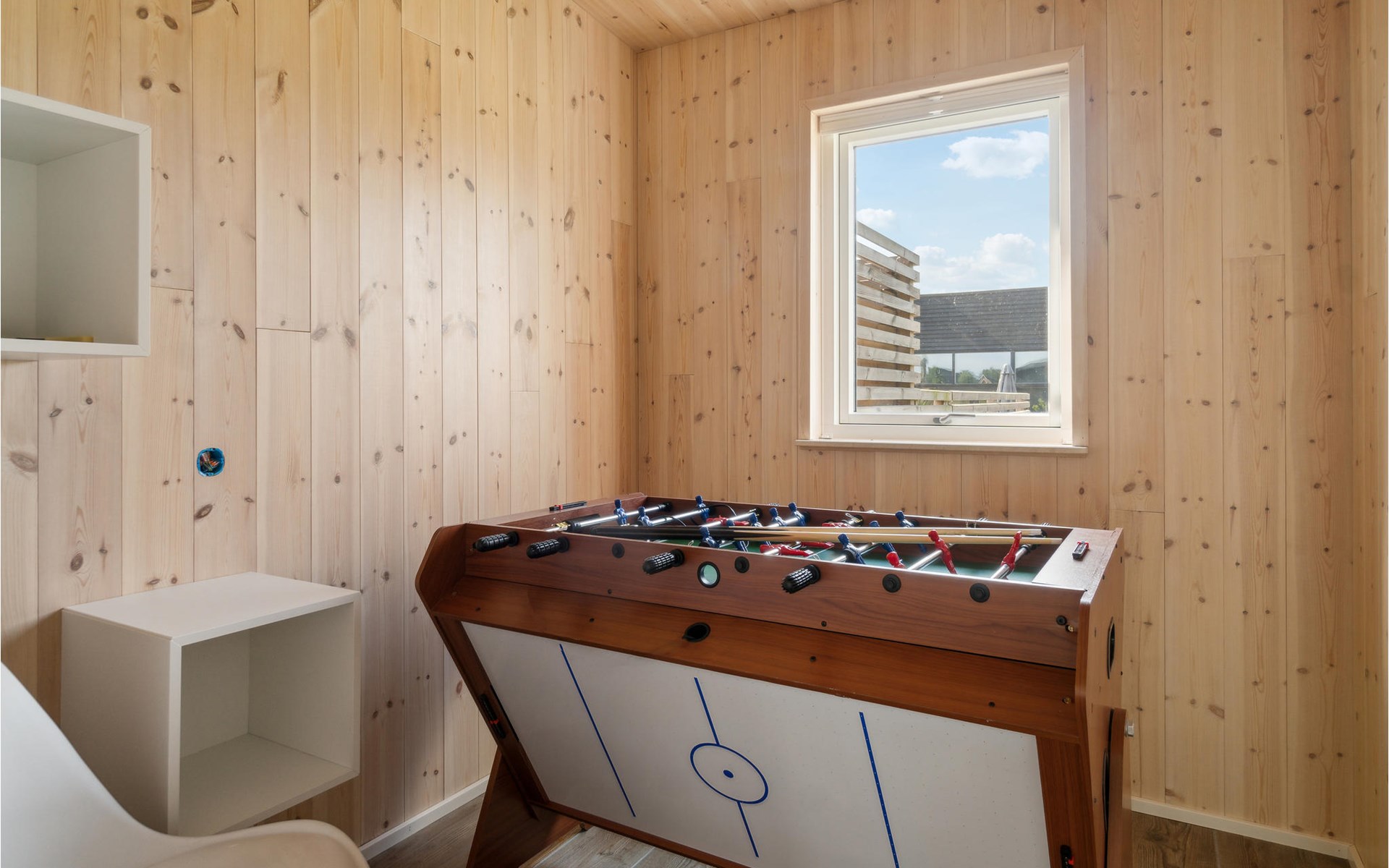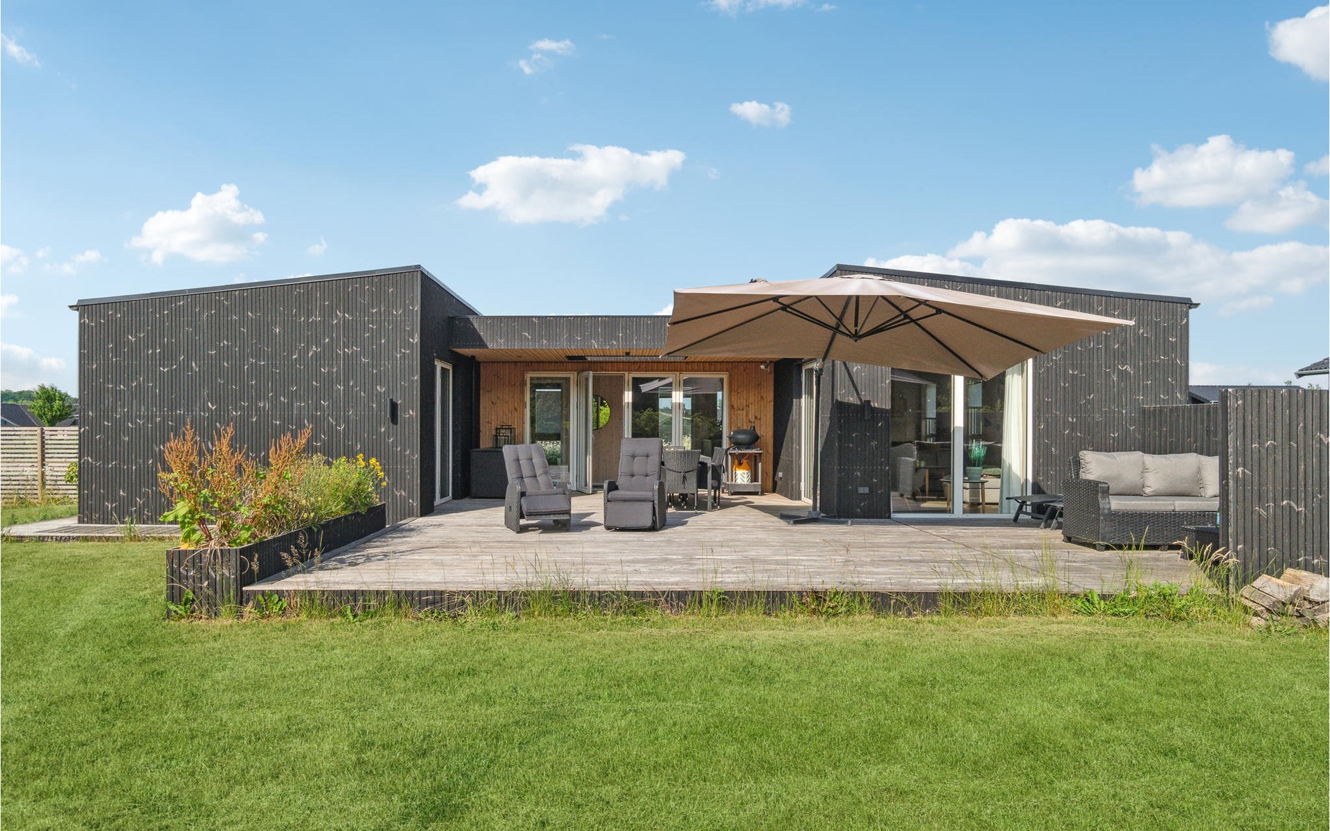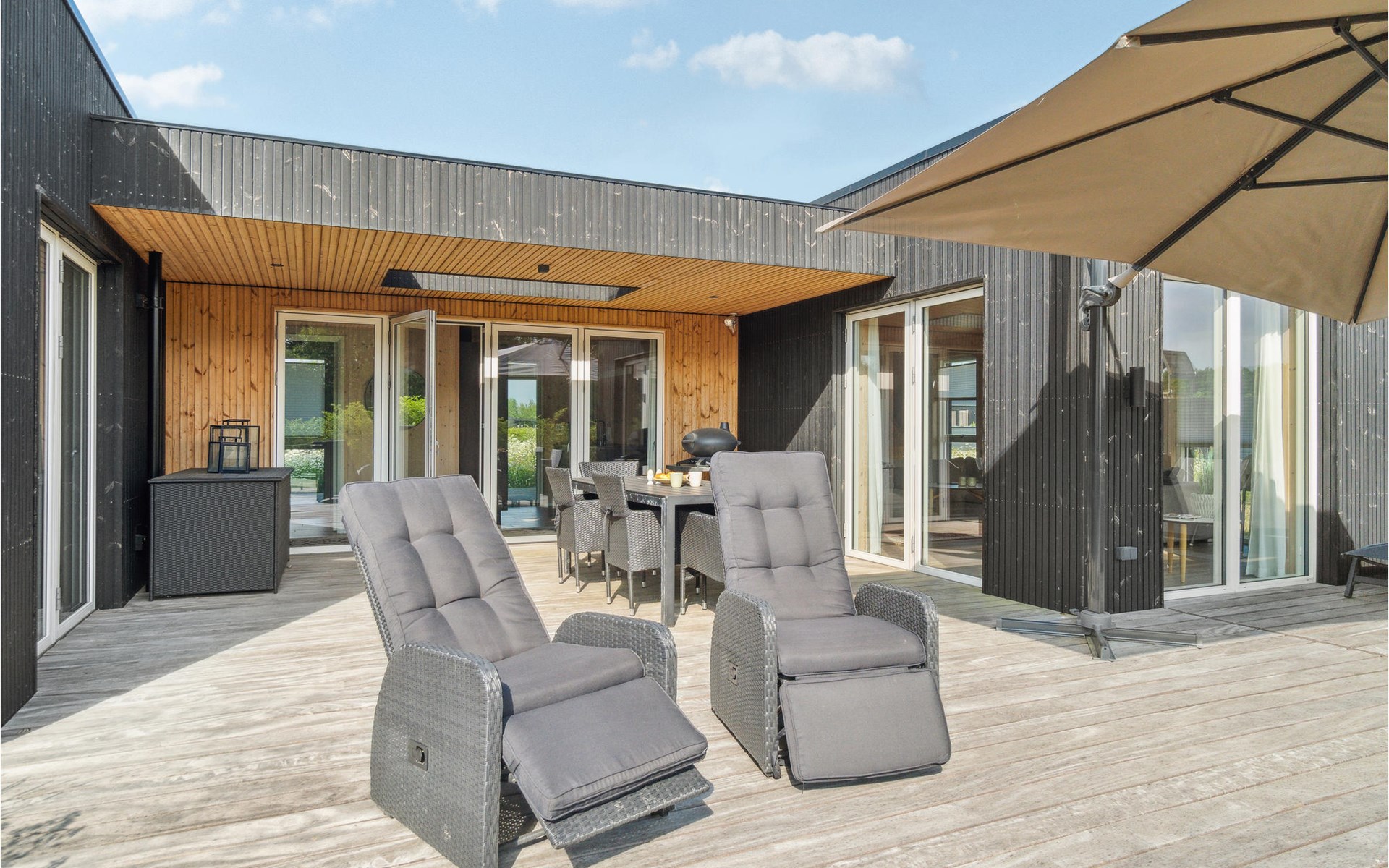 Spend a comfortable vacation with your family in this beautiful vacation home, which creates a warm and cozy atmosphere thanks to its wooden cladding. Enjoy your time in the bright living room, which will become your natural family meeting place. Here you can relax together on the sofa, watch your favorite movie, cook together or play board games. In warm temperatures you can use the large sun terrace and lounge on the high-quality garden furniture, watch the horses grazing in the neighboring paddock or prepare a delicious BBQ and enjoy it together in the open air.