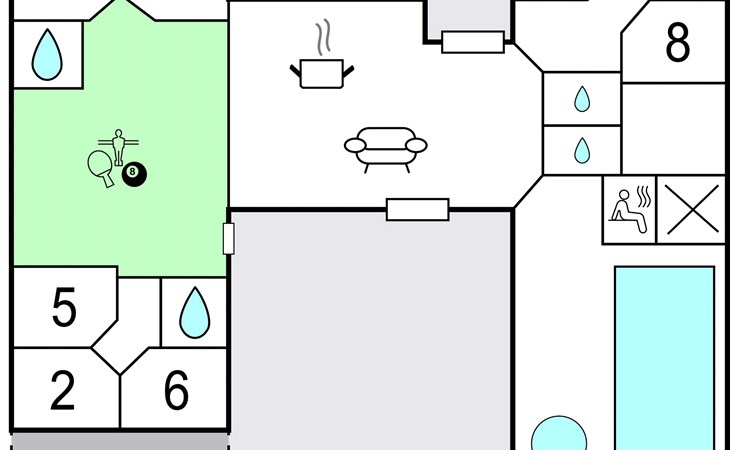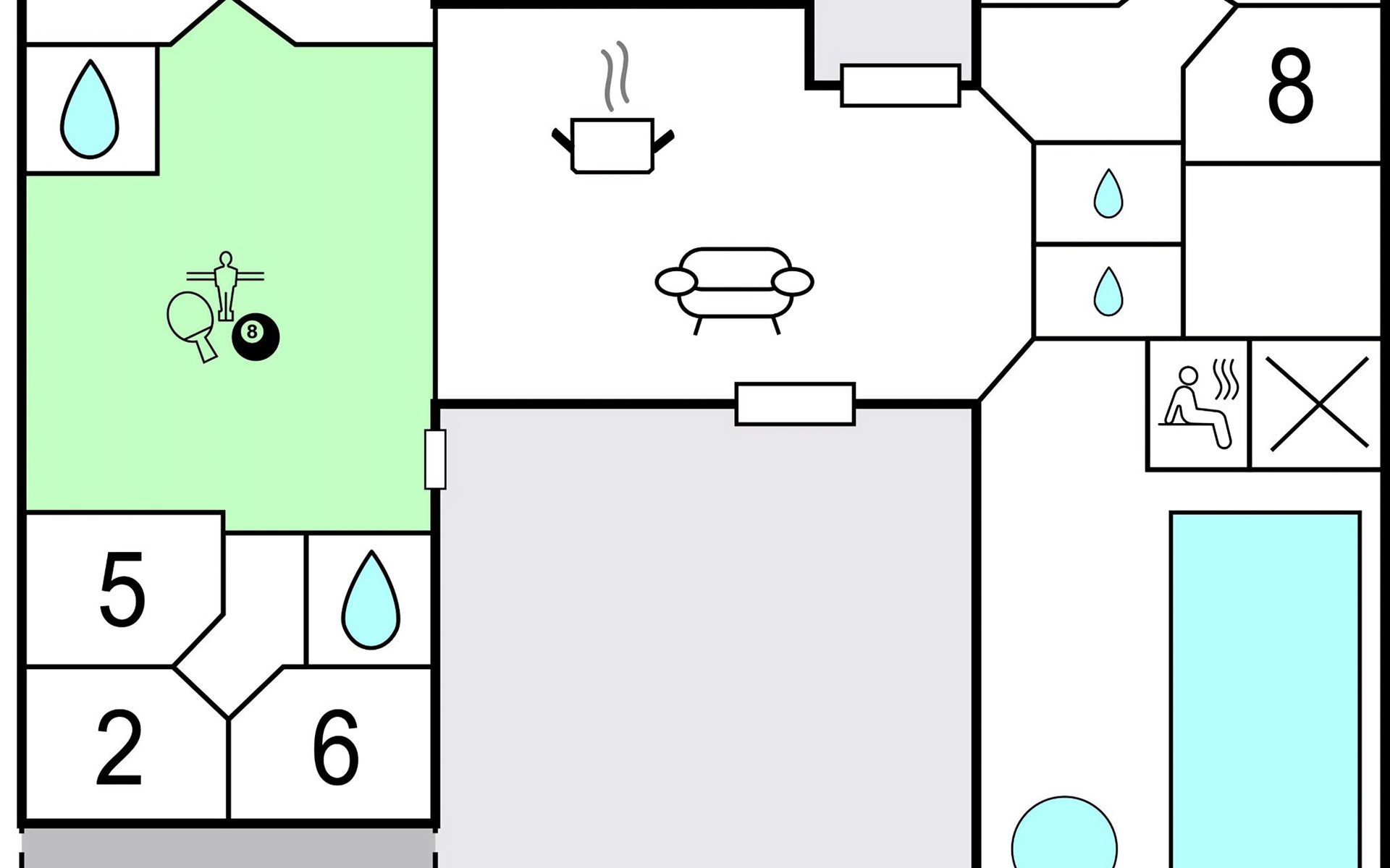 Close to the vacation town of Blåvand with its many possibilities and beautiful beach, this magnificent vacation home with swimming pool awaits you, whose many activity possibilities will create a perfect setting around your vacation in any season. Every possible luxury awaits you in the house, and it is arranged around several sleeping areas, each with its own bathroom, making it perfectly suitable for several families who want to vacation together. The large sleeping loft with room for four will most certainly be a hit with the kids. The house is equipped with soundproof ceilings, which makes the stay especially pleasant. In the house, a lot of emphasis has been placed on luxury, which is especially evident in the impressive pool area. There you will find a large pool with water slide, a whirlpool for 4-6 people and a sauna. In the spacious activity room you can play games like billiards, table tennis, darts or table soccer and more. At the bar you can mix interesting cocktails or simply serve cold beer and other drinks directly from the bar fridge. The kitchen is particularly well-equipped and has two stoves, two washing machines and two refrigerators and freezers, so even many cooks won't spoil anything here when preparing a delicious feast together. You can enjoy the Danish summer on the terrace while the children swing or dig in the sandbox. There is also a covered terrace with an open fireplace and lounge furniture. A few hundred meters from house is the most beautiful mini golf course in Denmark.