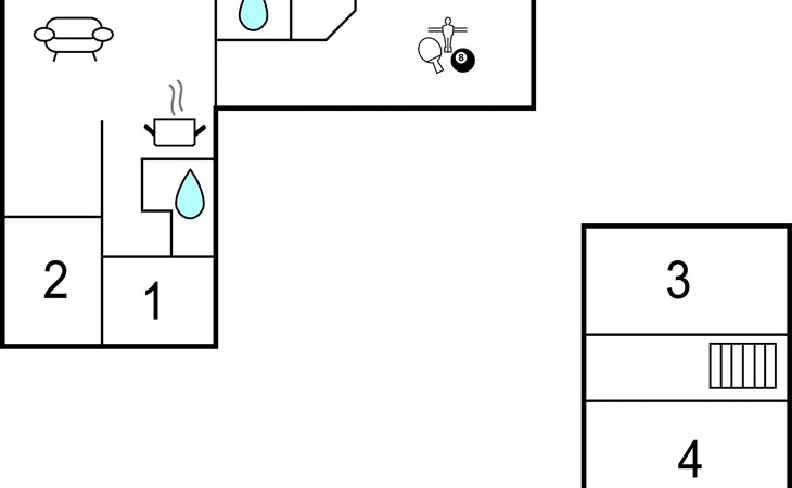 The house has several bedrooms, a sauna and an activity room with darts, foosball, etc.