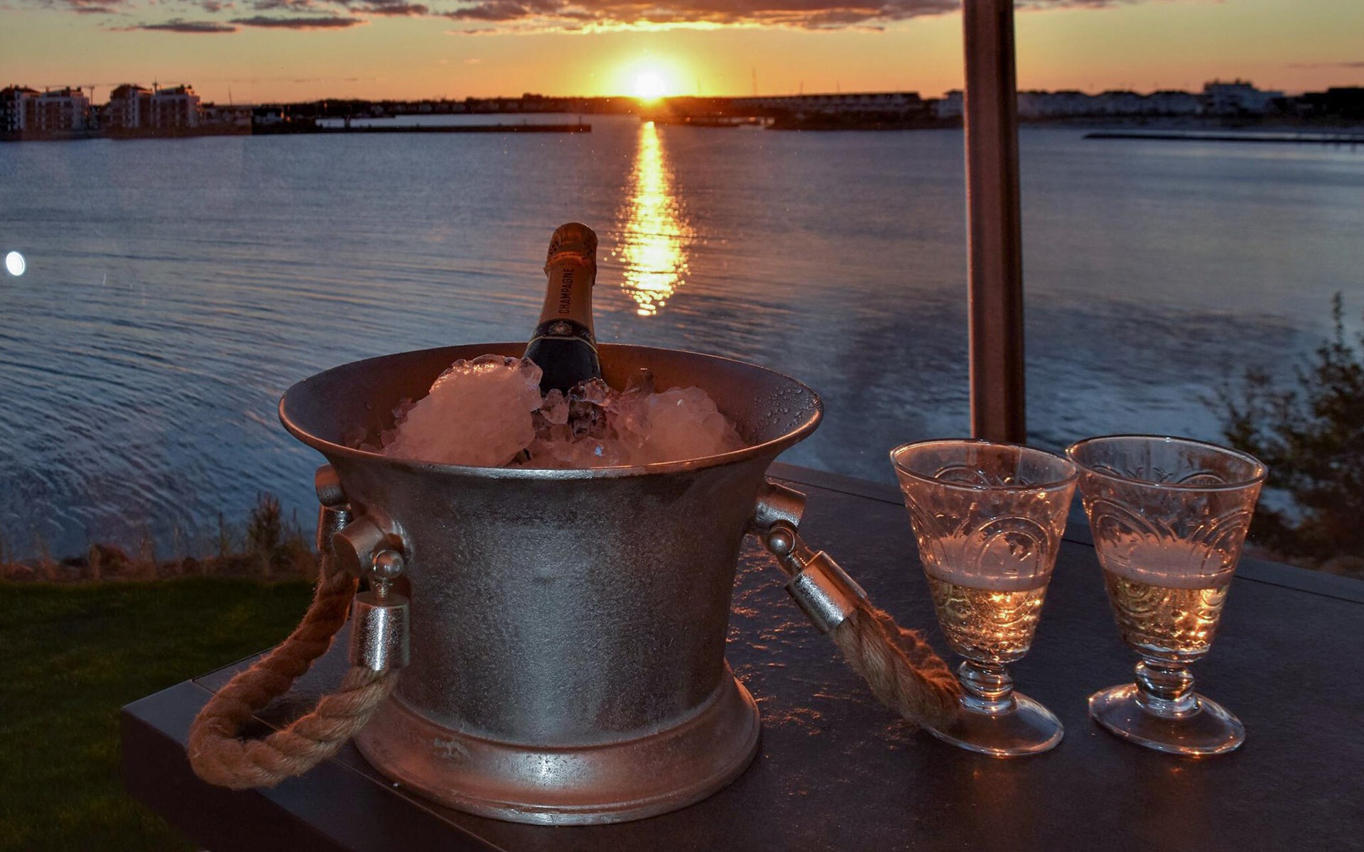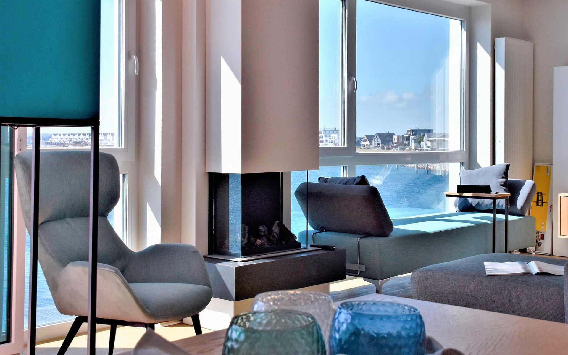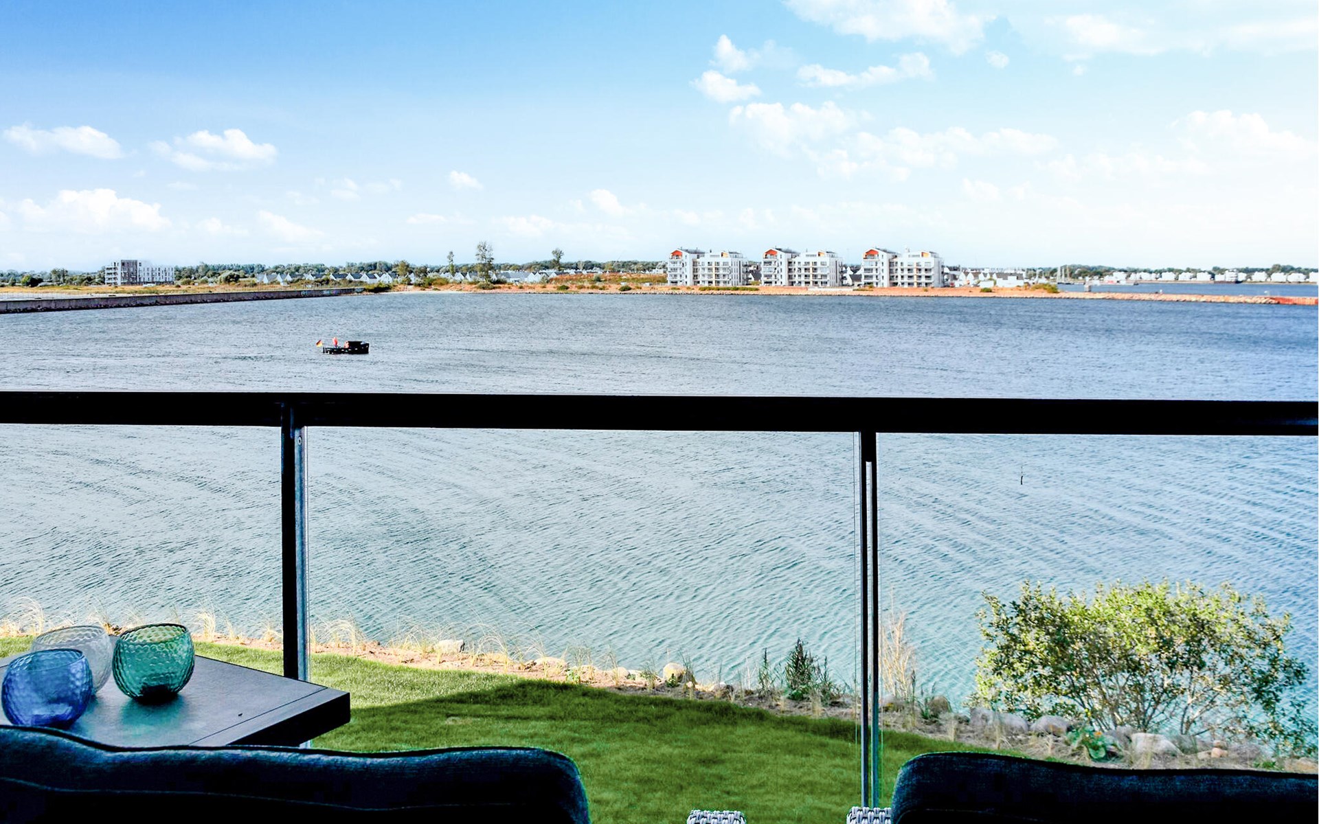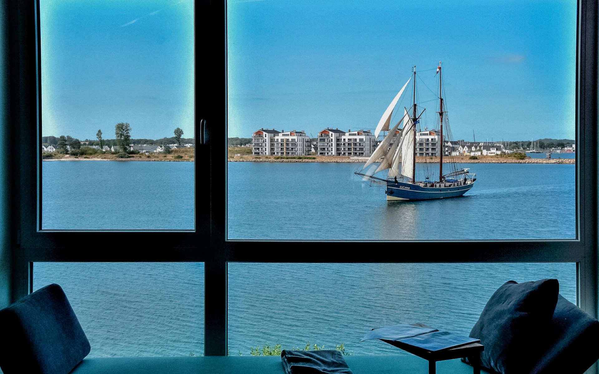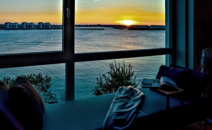 Through the large floor-to-ceiling windows, the view sweeps over the harbour entrance, the marina with the boats sailing past, cormorants diving in the water and porpoises often making their rounds several times a day.