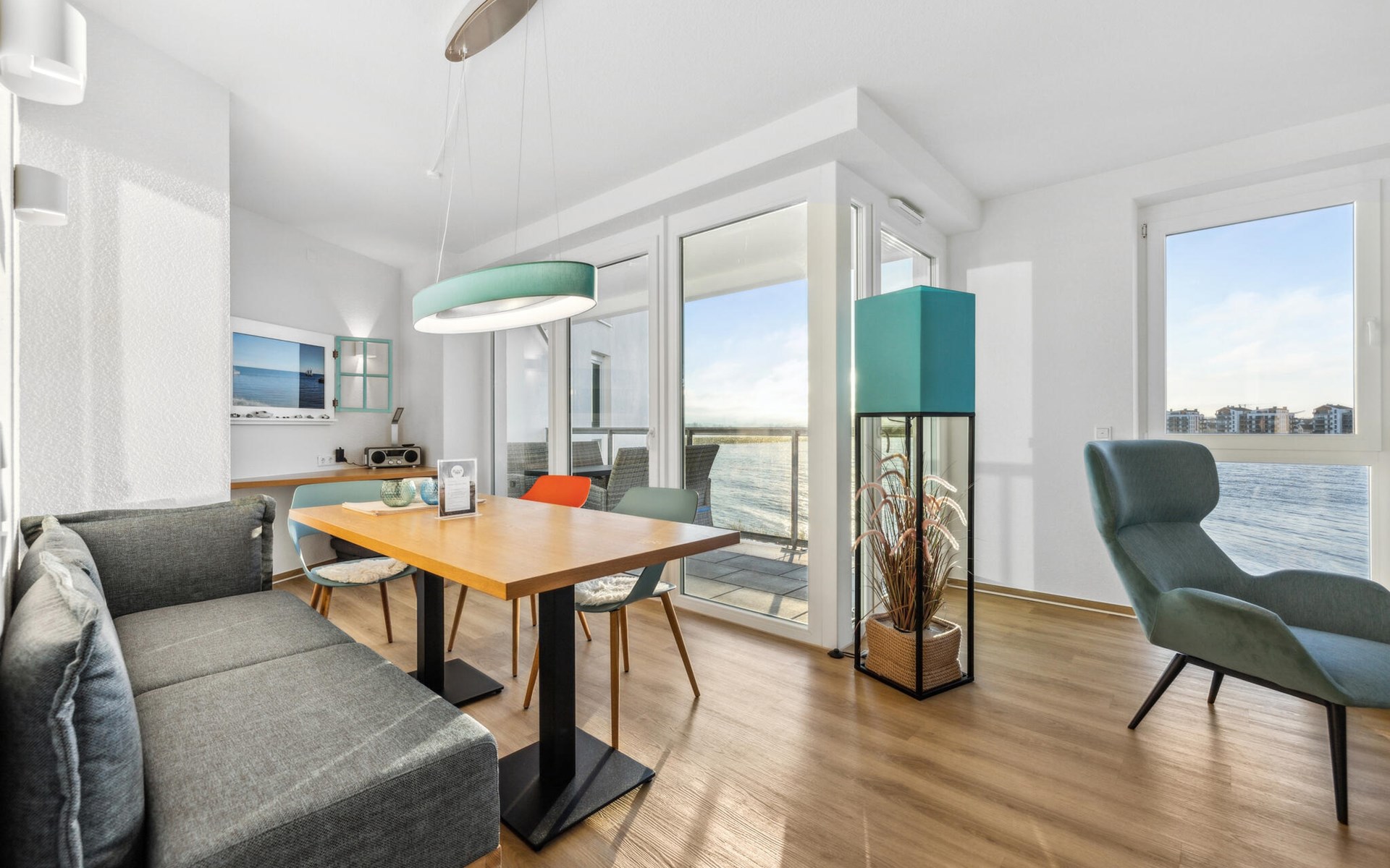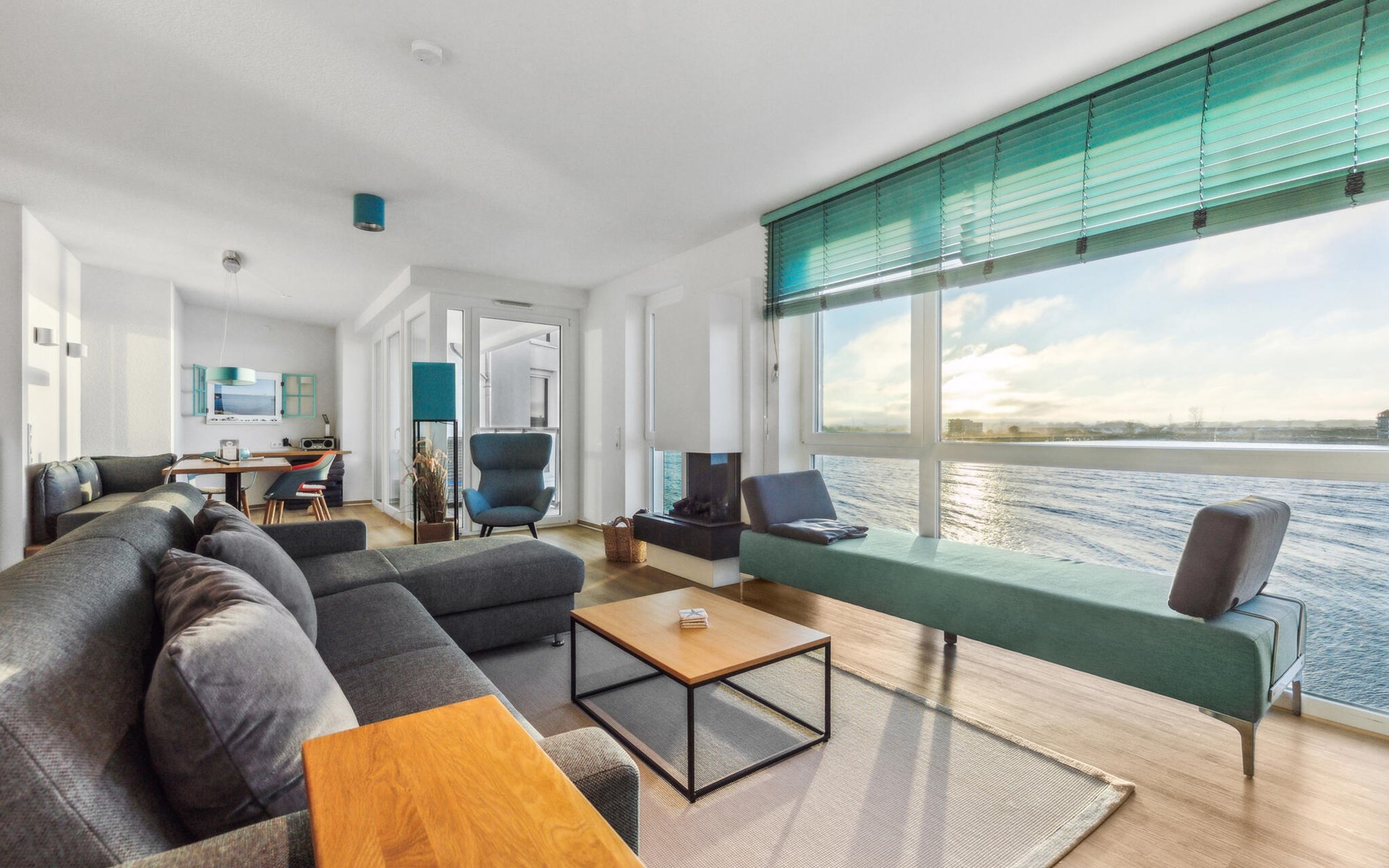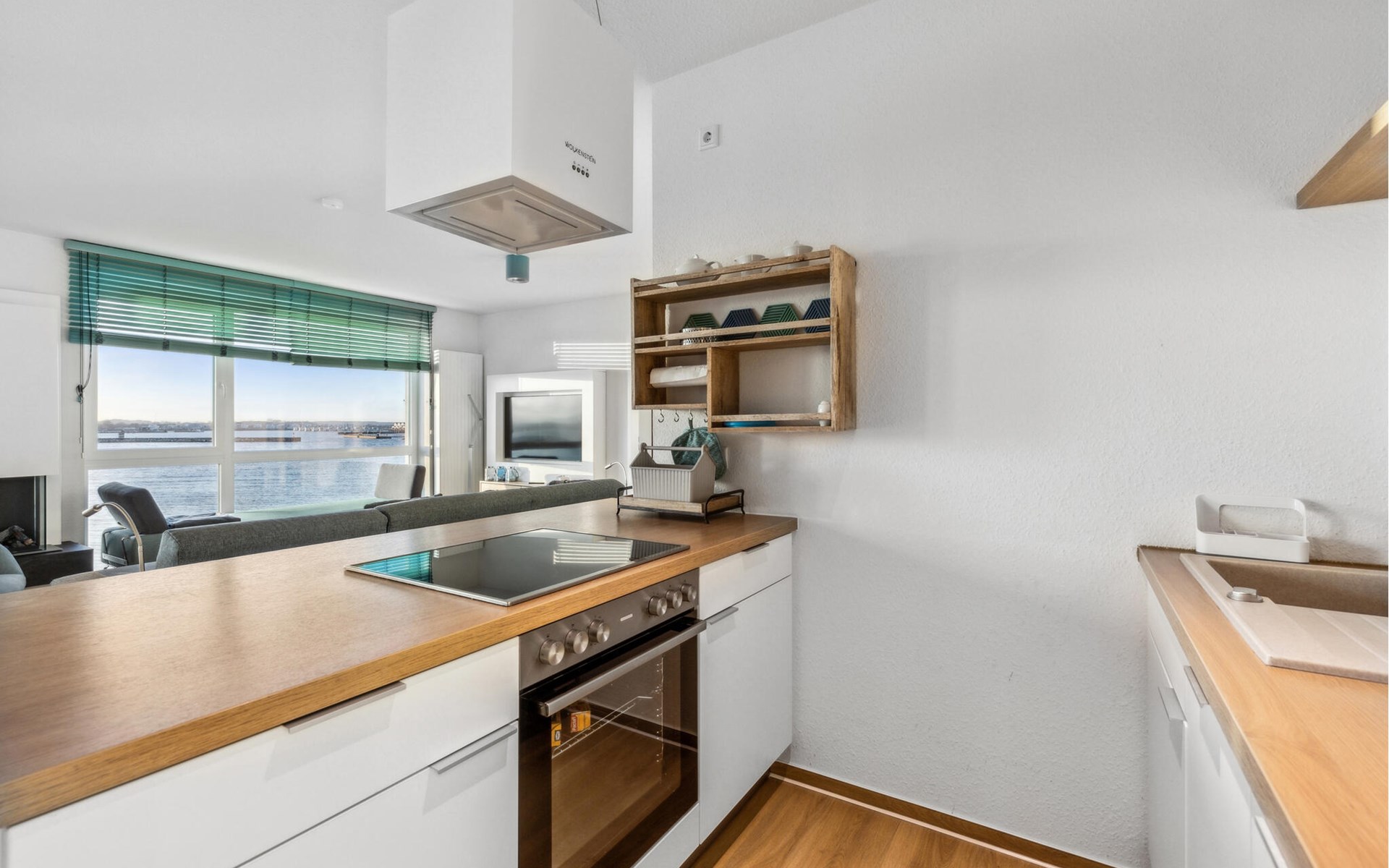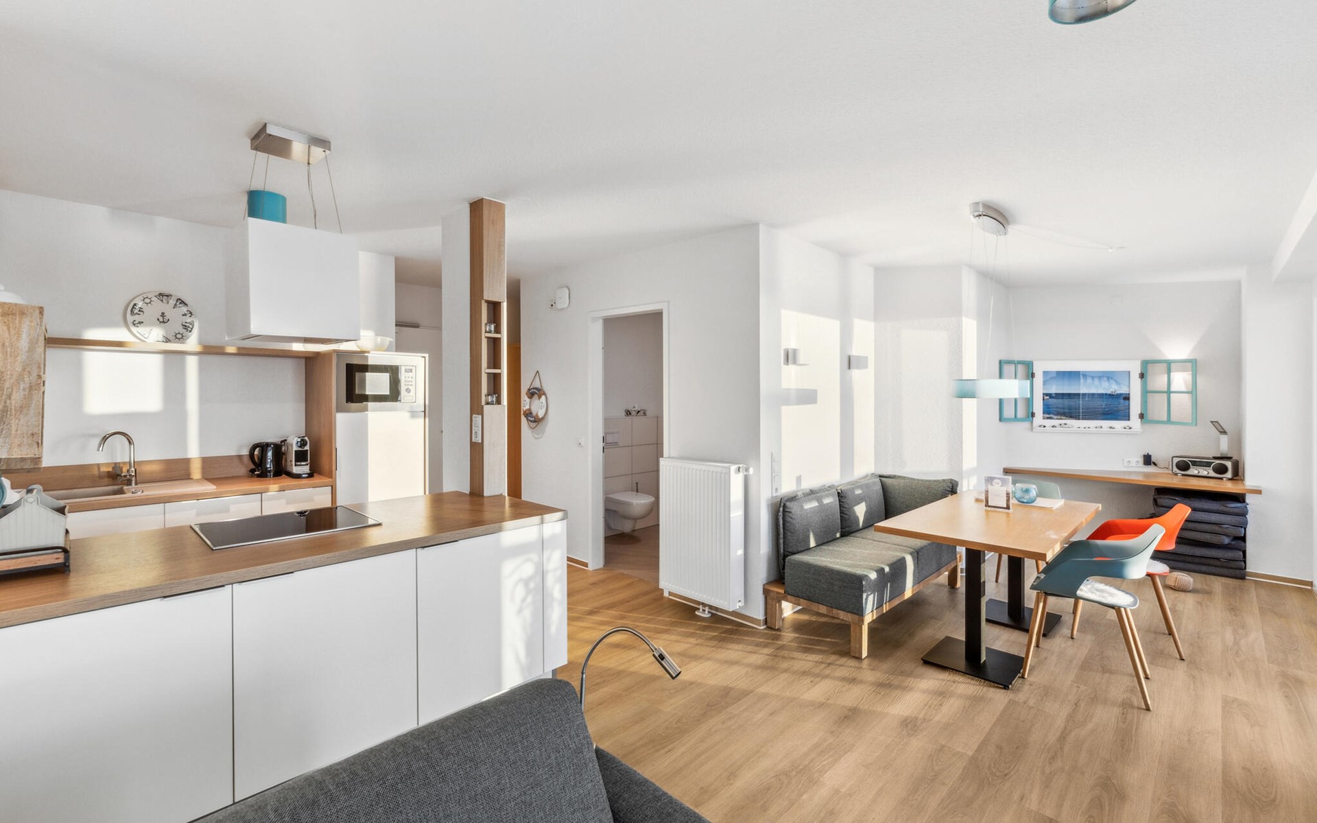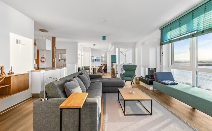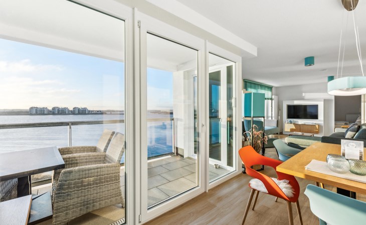 Our Blue Lagoon holiday apartment is located in the middle of the pier, surrounded by the sea on three sides. From all rooms and bathrooms, as well as from the wind-protected loggia facing south-west, you have a direct view of the water, be it from the couch, the beds, while cooking, eating or even showering.