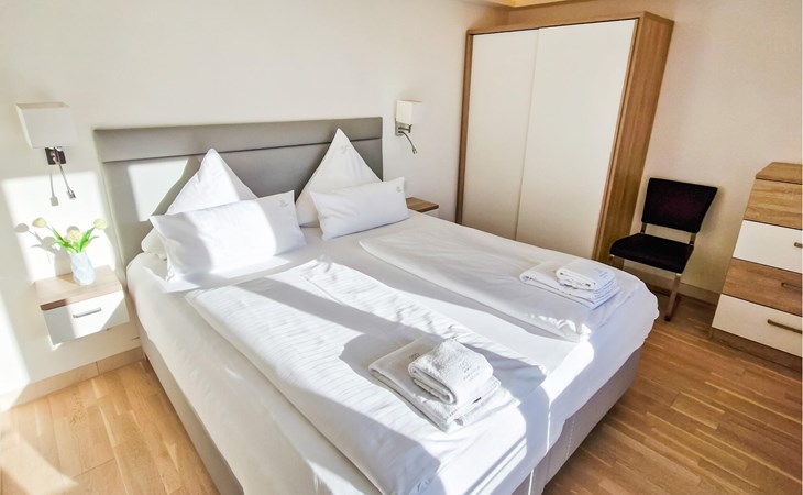The Garden Suite is a very special, bright and sunny apartment, as it is located in the side wing of the listed building. It is one of the very few apartments with windows on three sides, so that it is flooded with light from morning to evening. You can admire the view of the greenery to the north, west and south. The apartment is on the 2nd floor and is particularly quiet and private as there are no direct neighbours. Here you can relax from the first minute of your holiday and simply feel at home. The well-equipped kitchen also leaves nothing to be desired and invites you to enjoy cooking evenings with your loved ones. Coffee lovers will certainly enjoy the Nespresso machine provided (please bring your own capsules).