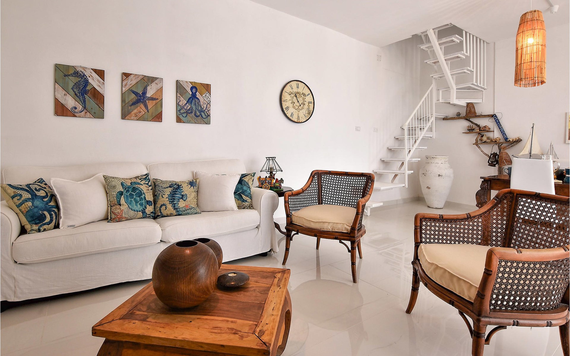 Treat yourself to some time off by the sea and enjoy a wonderful vacation together with your family in this tastefully furnished house. On two floors you can make yourself comfortable in the cozy rooms and make the individually decorated rooms your second home. Look forward to artful tiled floors or the large living room where you can come together as a family. A particularly nice place to be is the balcony. Here you can gather for your vacation meals, enjoy the view of the sea and breathe in the sea air.