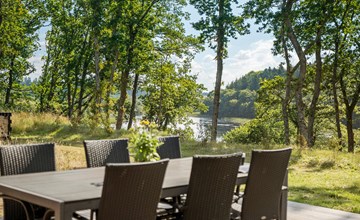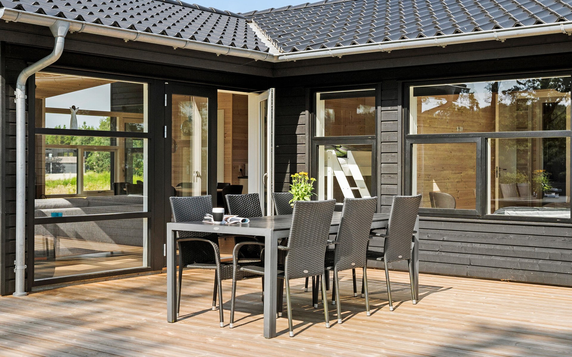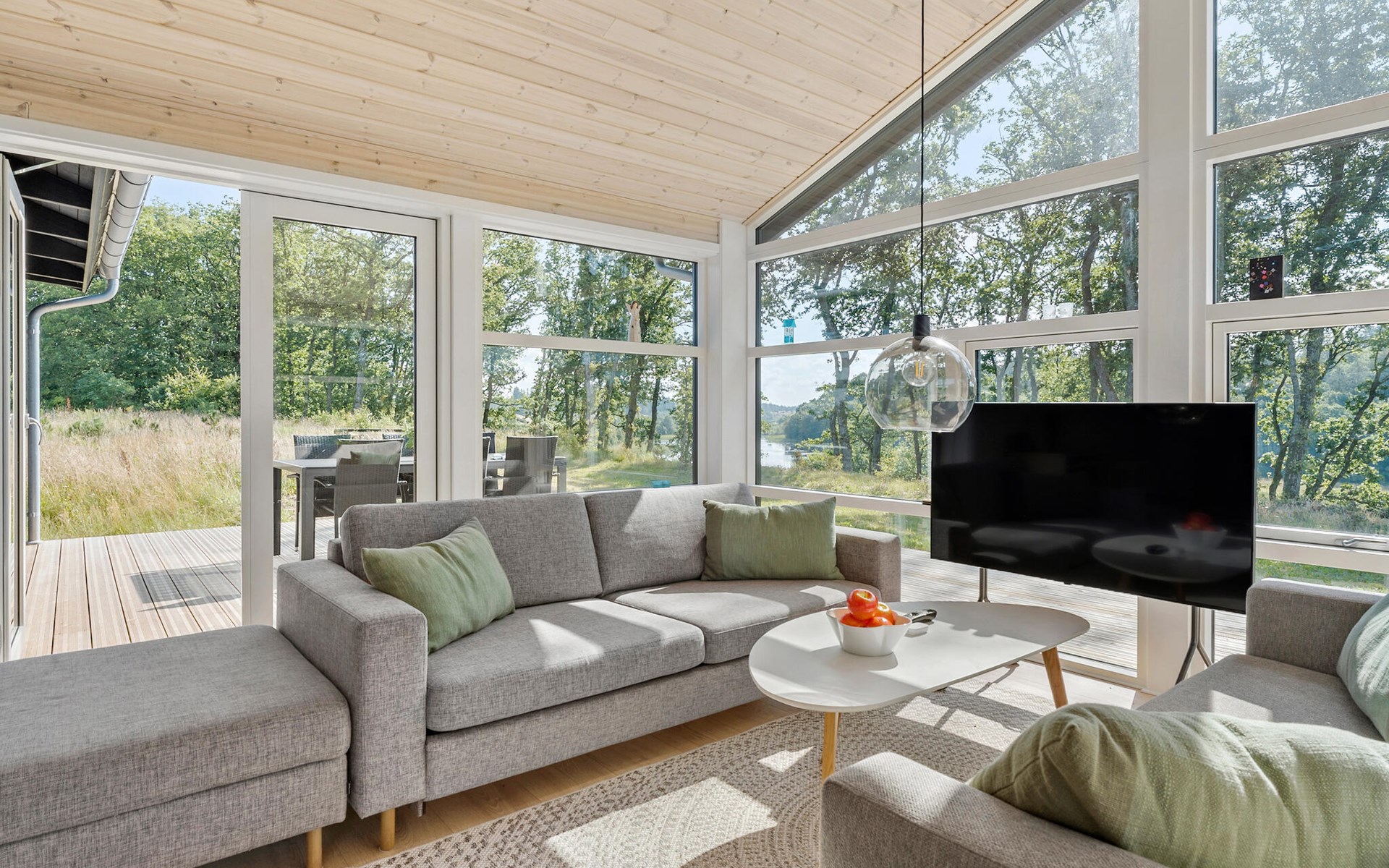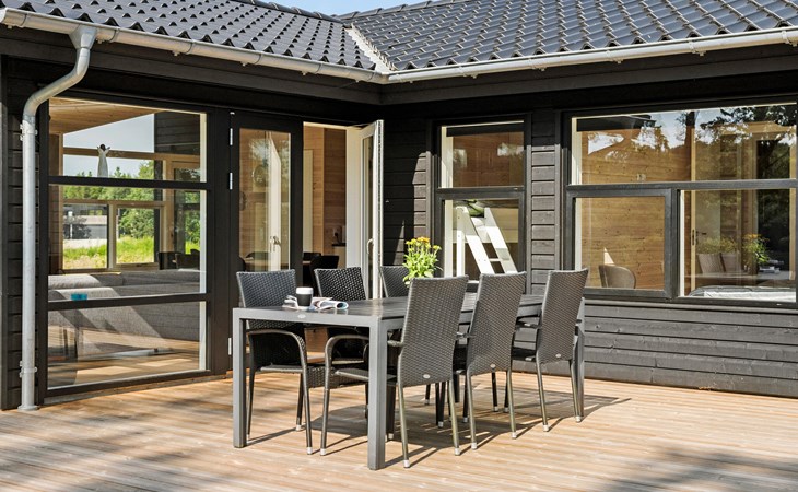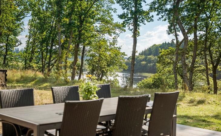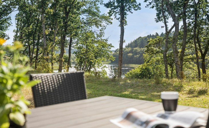 Enjoy your meal at the large dining table with a view of the greenery or outside on the spacious wooden terrace in fine weather. The terrace area is ideal for relaxing in the sun or enjoying dinner with the family while gazing out over the lake.