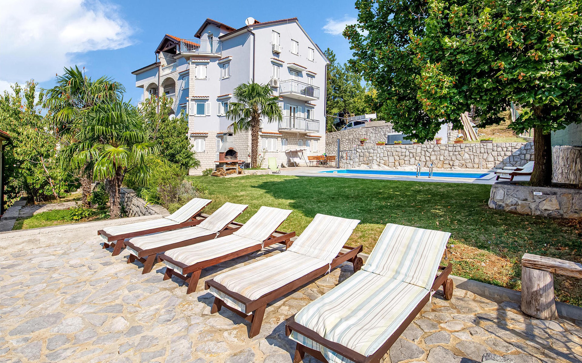Welcome to this well-kept apartment building, which has several comfortable vacation apartments ready for you. The inviting apartments offer space for small to large families. The furnishings and equipment create a cozy atmosphere in which you can feel at home. Have your morning coffee on the balcony and then head to the communal garden, where you can read a book in the sun on the communal terraces or relax in the hot tub while your children splash around in the pool. You can also retreat to the sun deck, where you can enjoy the view of the Opatija Riviera to the full.