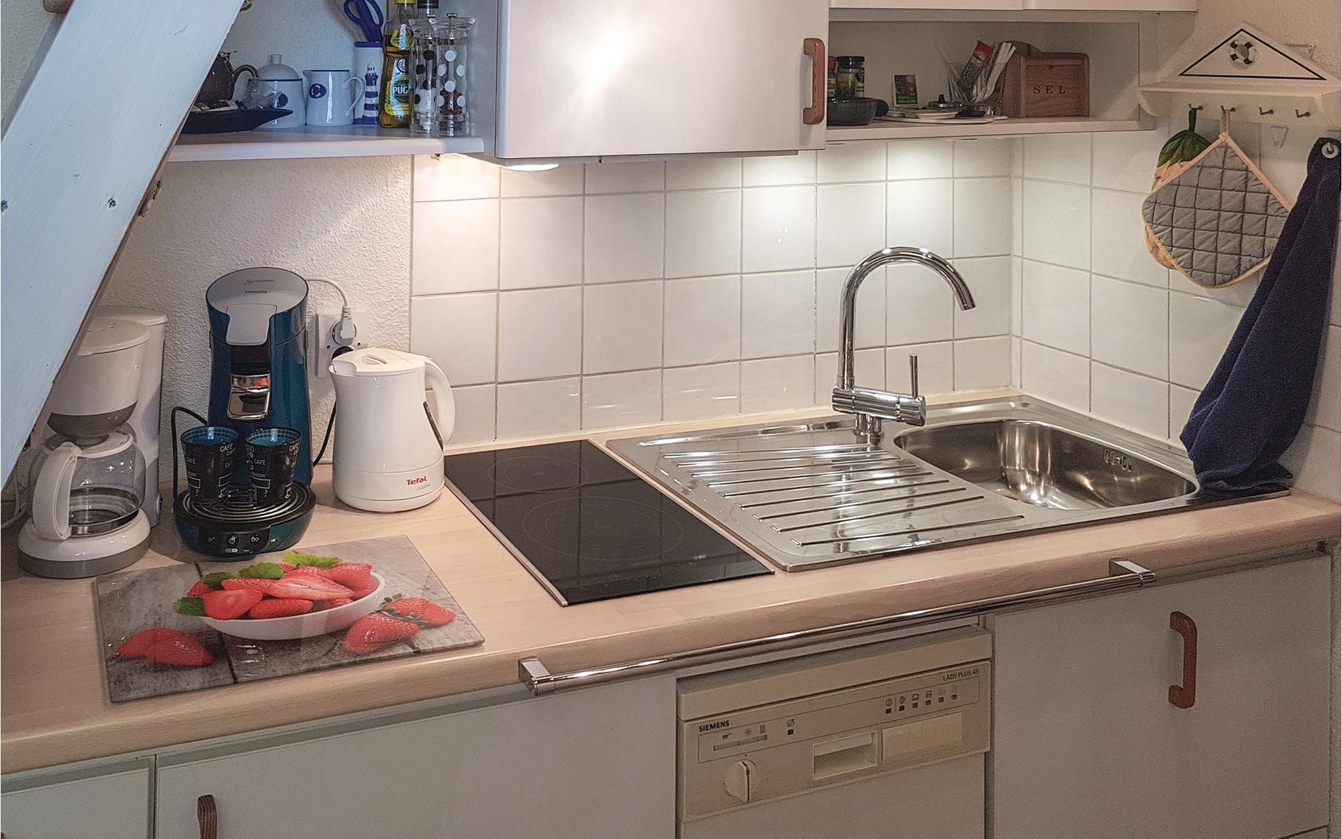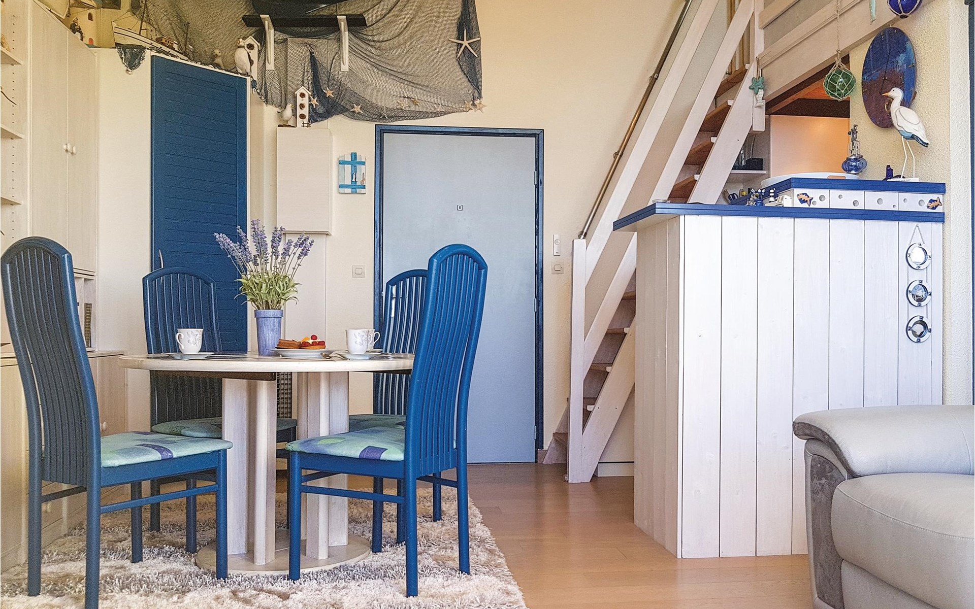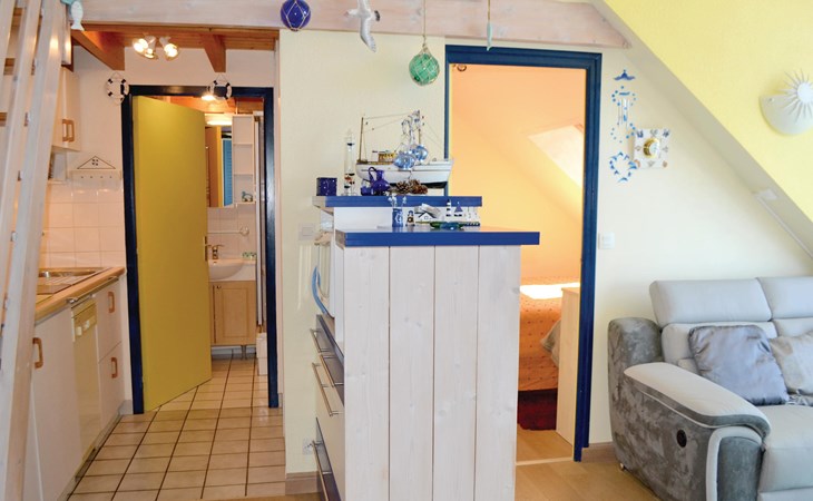 Escape from everyday life and spend a relaxing vacation with your loved ones in this cozy, small apartment just a few steps from the beach. Make yourself at home in the homely rooms with their maritime color scheme and use the apartment as a base for wonderful days at the beach and exciting excursions in the surrounding area. After an eventful day, conjure up a delicious dinner in the living room. In the evening, you can discuss your experiences in the seating area by the large window, enjoy the view and make plans for the next few days over a glass of wine.
