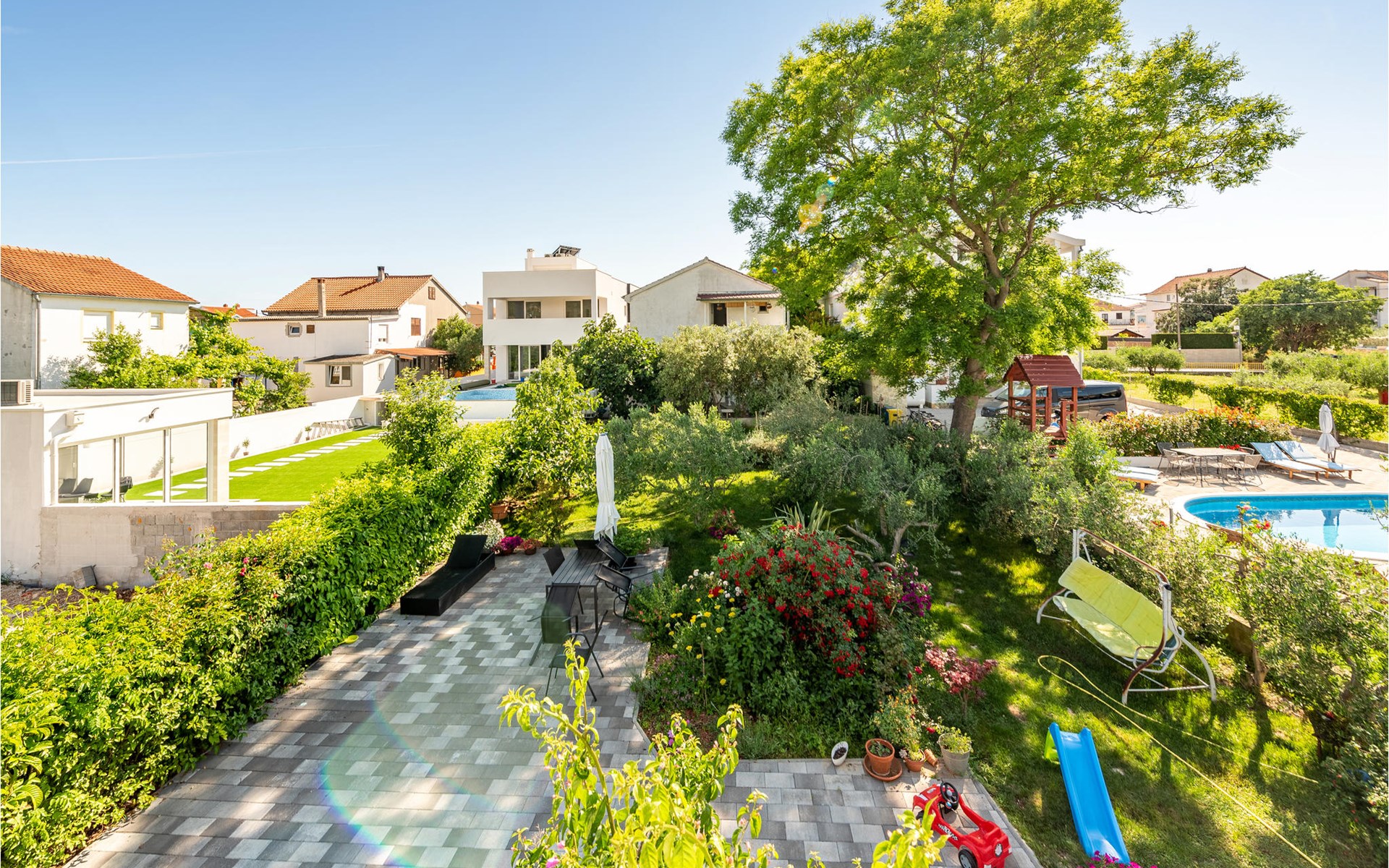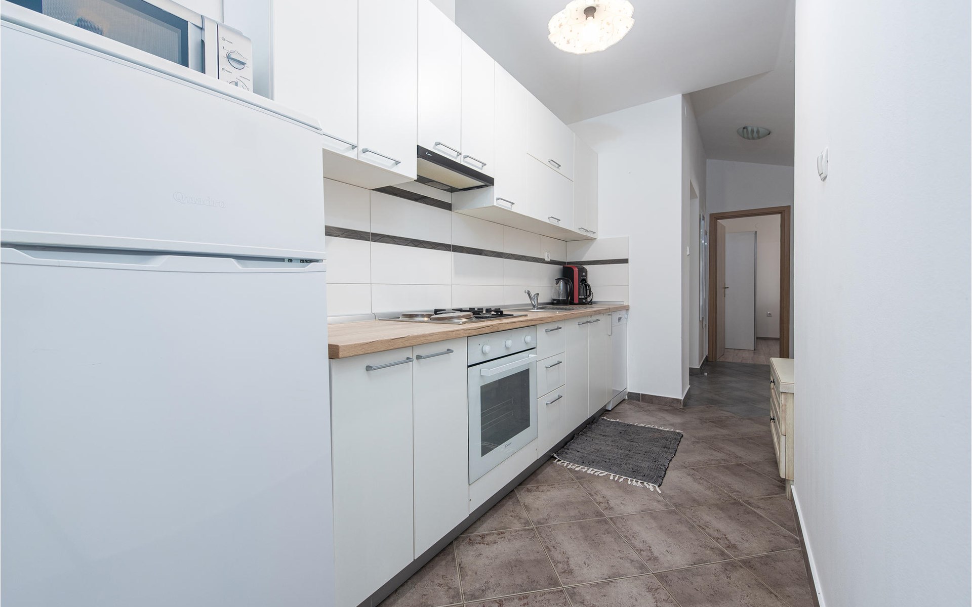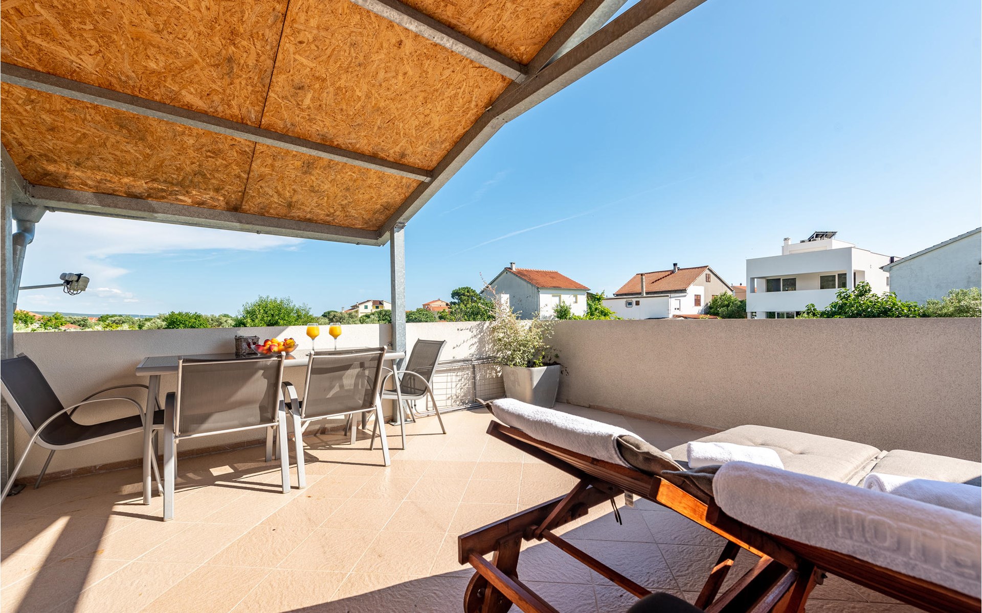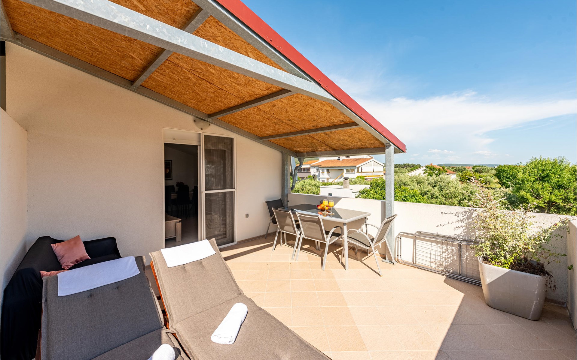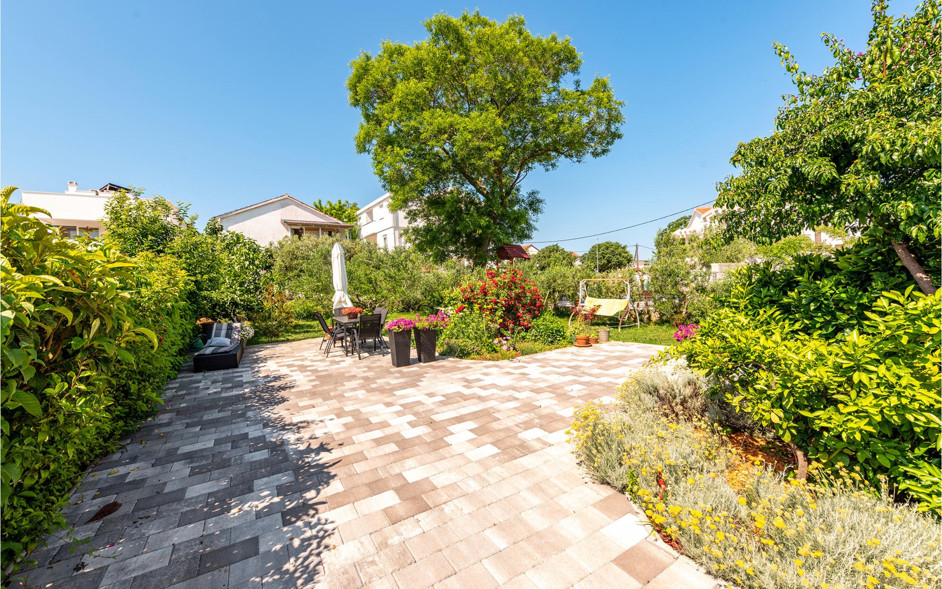 The comfortable apartment offers you and your family space and a nice place to enjoy your vacation on the Adriatic coast. The cozy apartment creates space for you to relax, cook or play together. Besides a balcony where you can relax on the sun loungers and enjoy a glass of wine or a book, you can also enjoy your vacation meals on the terrace in the garden. The beautiful garden is lovingly landscaped with flowers and offers you an oasis of tranquility.