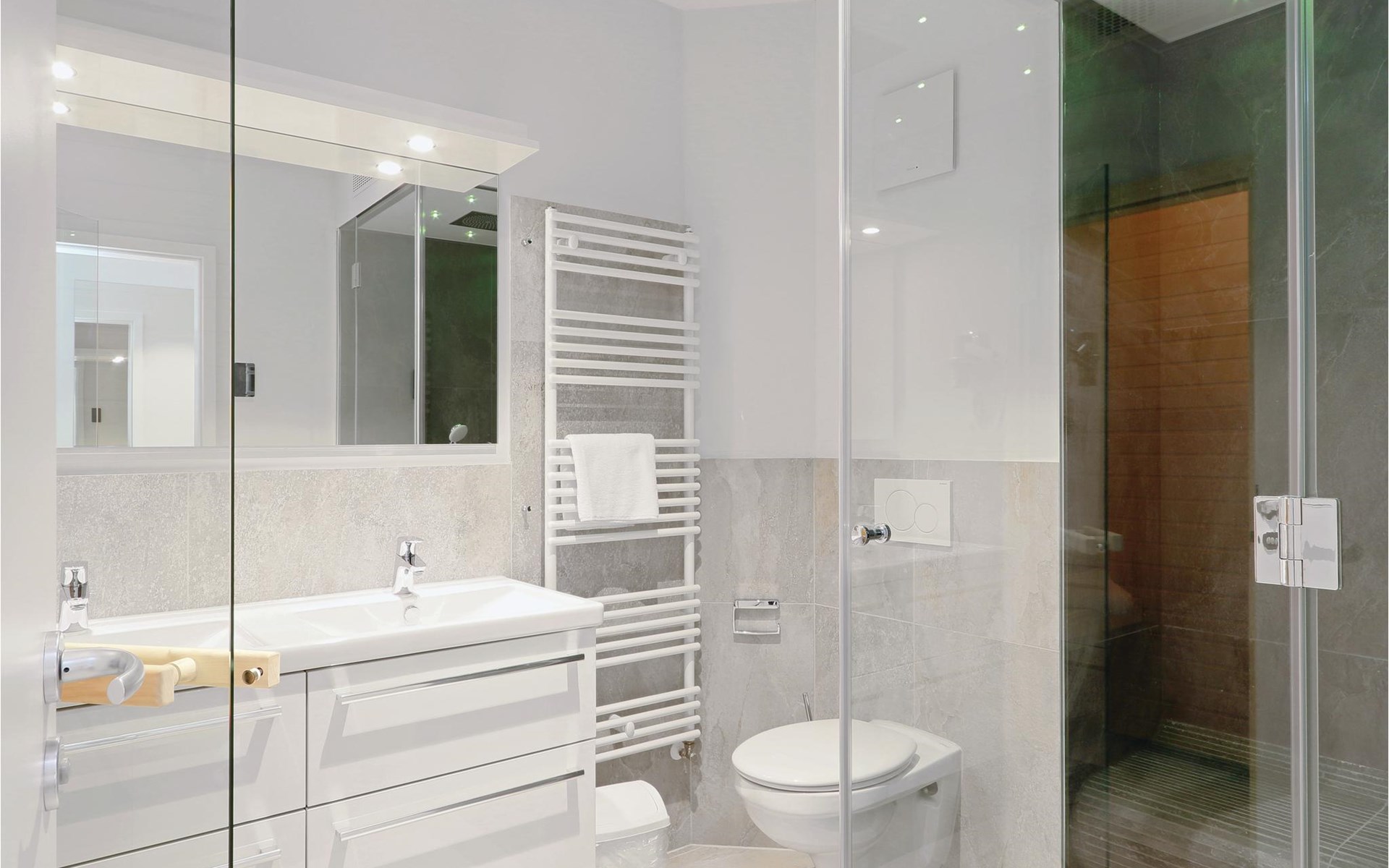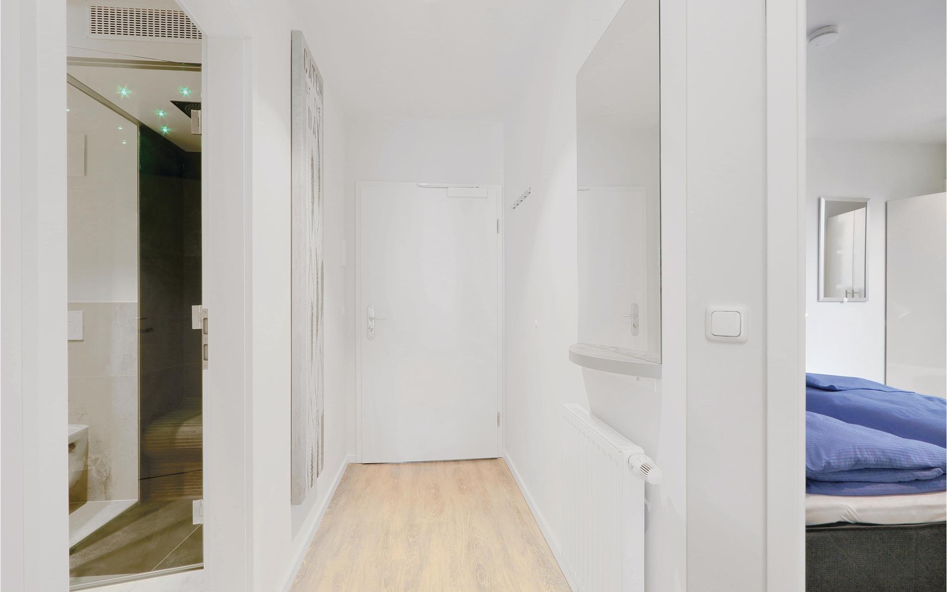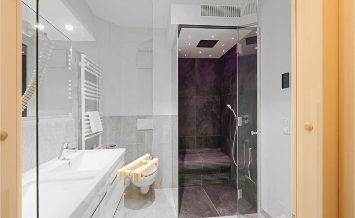 The bathroom is your private wellness area. Here you can cosy up in the infrared sauna or relax in the steam bath with rain shower. The holiday apartment also has a modern entertainment system with Blu-Ray player, two flat-screen TVs and a music system with MP3 connection.