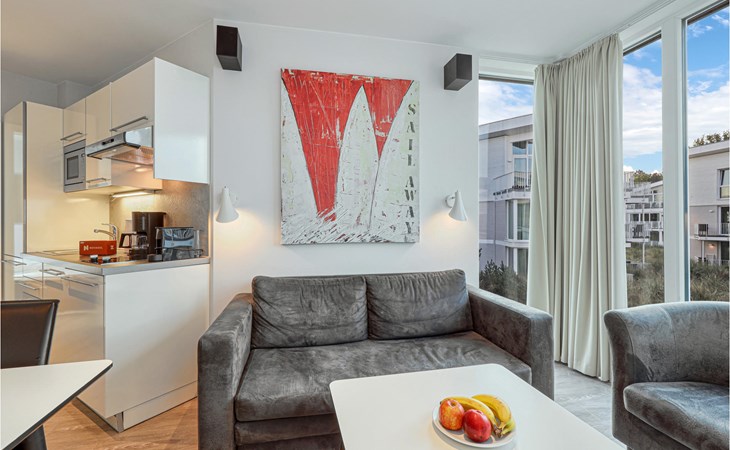 The living area has a bay window made of glass, making the holiday apartment particularly bright and flooded with light. The kitchenette, sofa bed and bio-ethanol fireplace are also located here. You can reach the balcony from the separate bedroom. Here you can have breakfast together or simply enjoy the fresh Baltic Sea air. Coffee lovers will find a Nespresso machine in the kitchen (please bring your own capsules), as well as a thermos flask and hand filter for brewing your own coffee if you prefer the classic filter coffee.