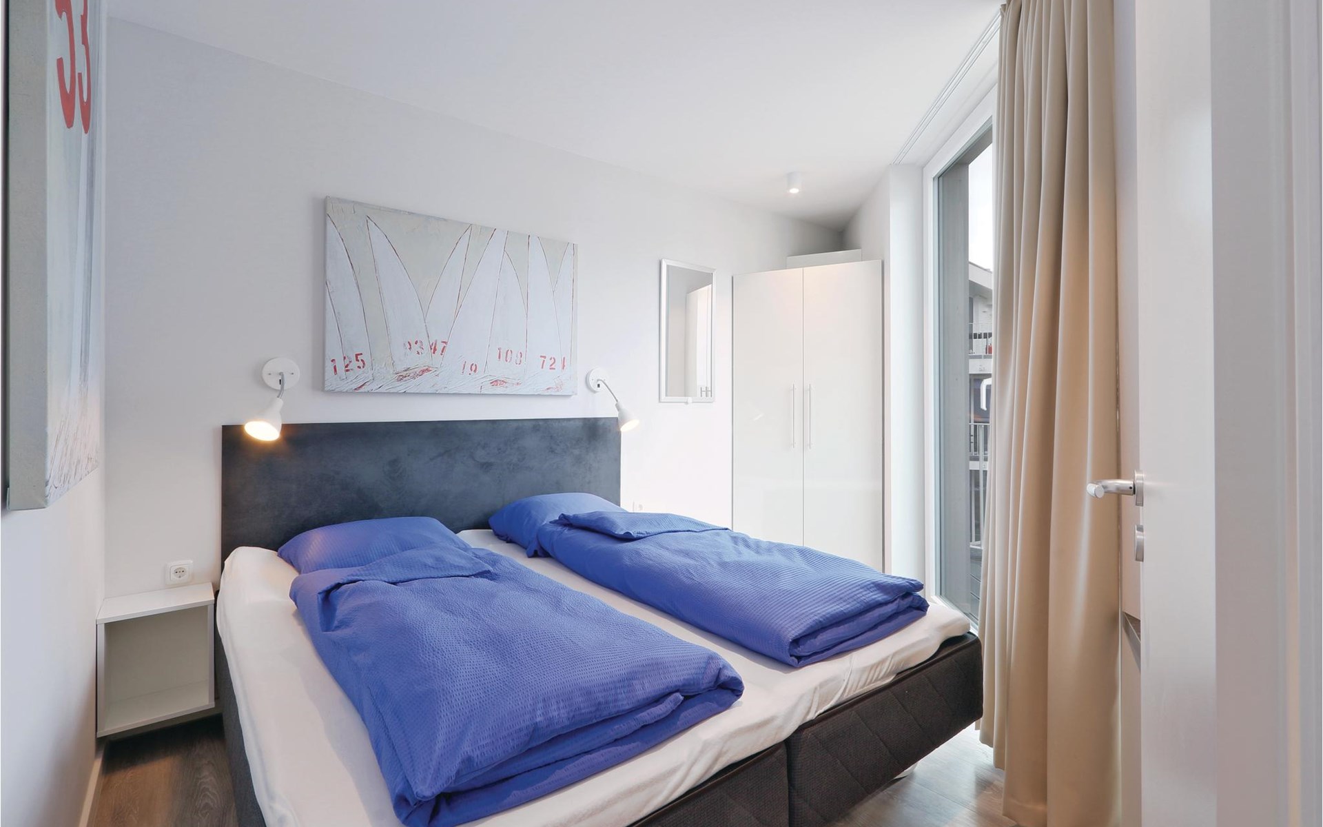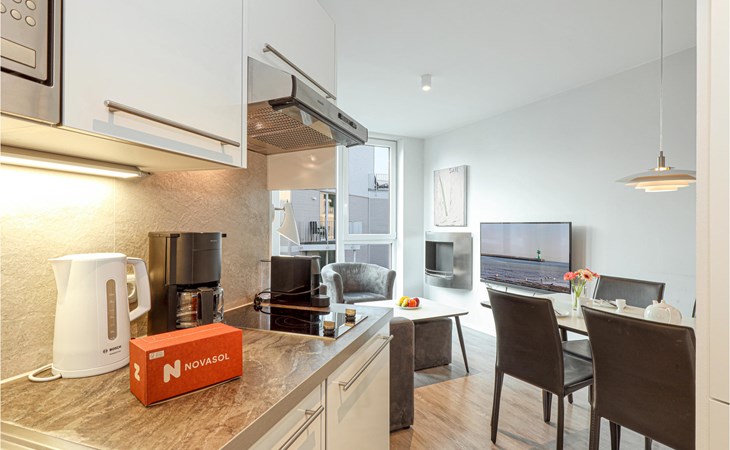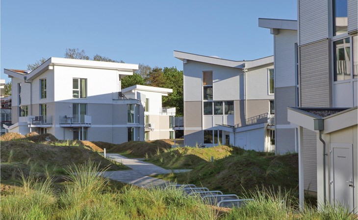 Enjoy your holiday by the Baltic Sea in the new BeachBay holiday resort on the Priwall in Lübeck Travemünde. The comfortable holiday apartment is located on the 1st floor of the dune villa in a quiet location behind the promenade villas. The beach house-style accommodation is designed with lots of wood, glass and warm colours and thus blends in perfectly with the landscaped dune landscape.