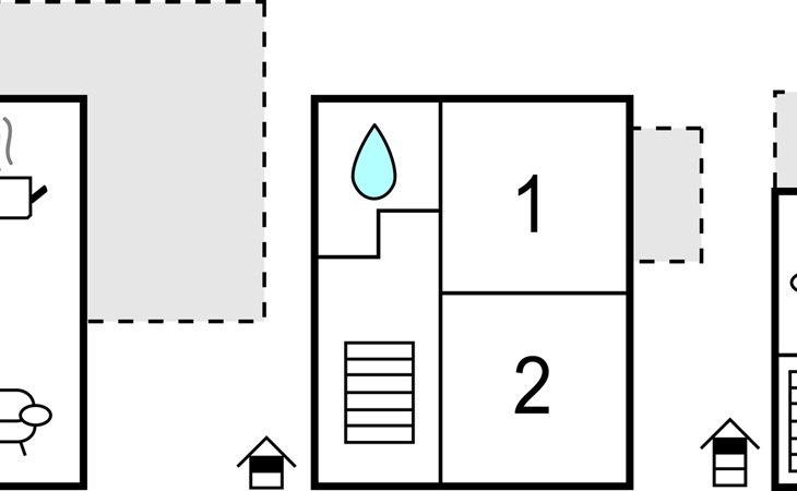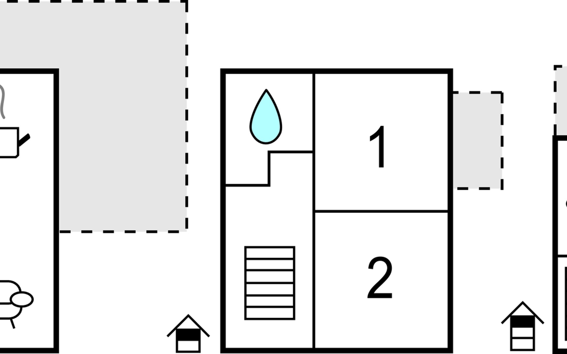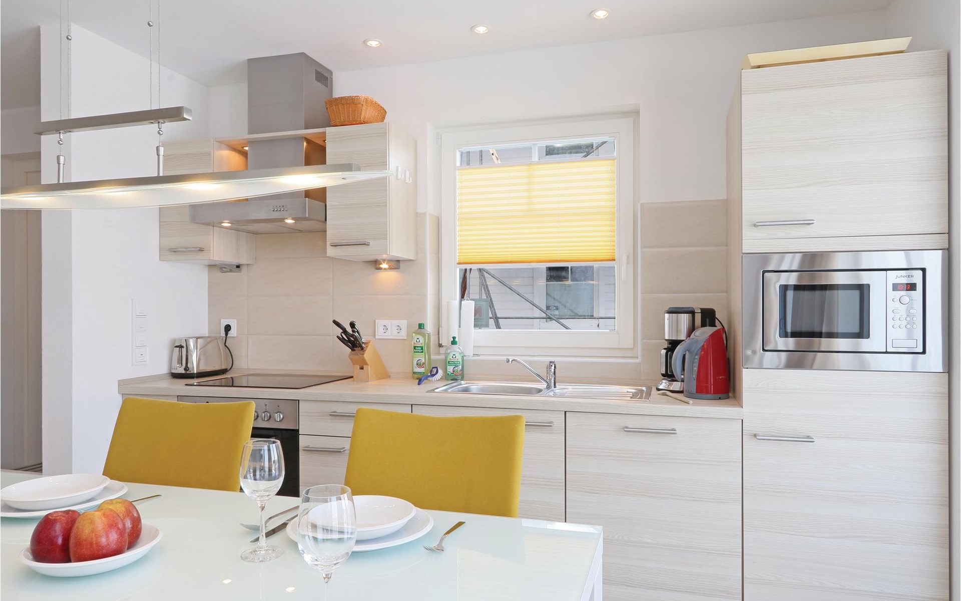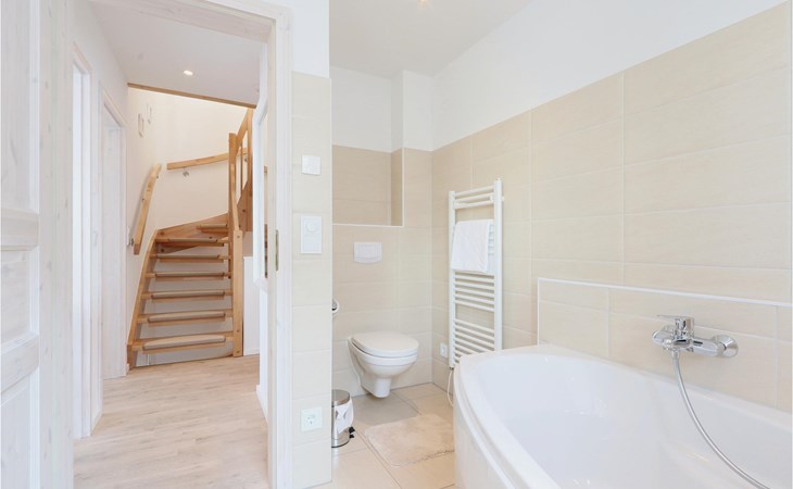 Each house has a fully equipped kitchen with all mod cons (dishwasher, microwave) and a utility room where the washing machine is located. All rooms are equipped with underfloor heating. In addition to the fully equipped bathroom on the 1st floor, there is a guest WC on the ground floor and a separate shower in the sauna area.