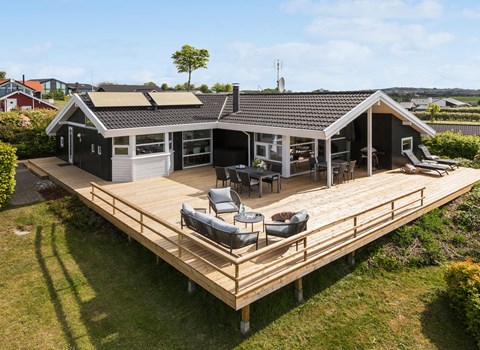 Fantastic views over Begtrup Bay, light, air and a great deal of space both outside and inside characterize this wonderfully spacious vacation home, which is well suited for several families. The house is nice for a vacation at any time of the year, as it offers a wonderfully large terrace with direct access to the wood-heated Wildmarksbad, where you can relax overlooking the sea.