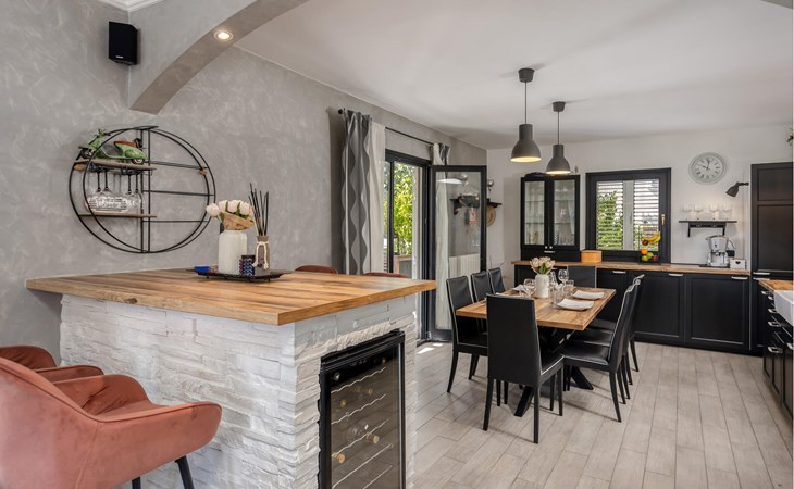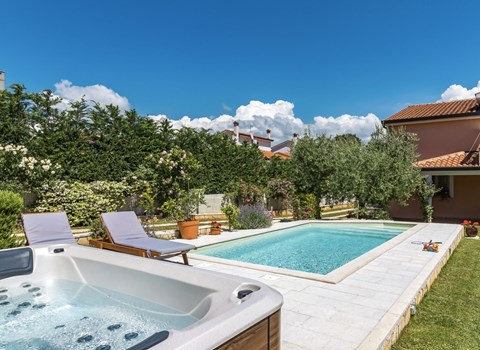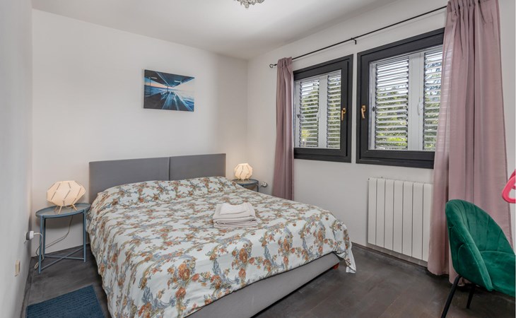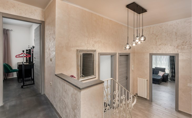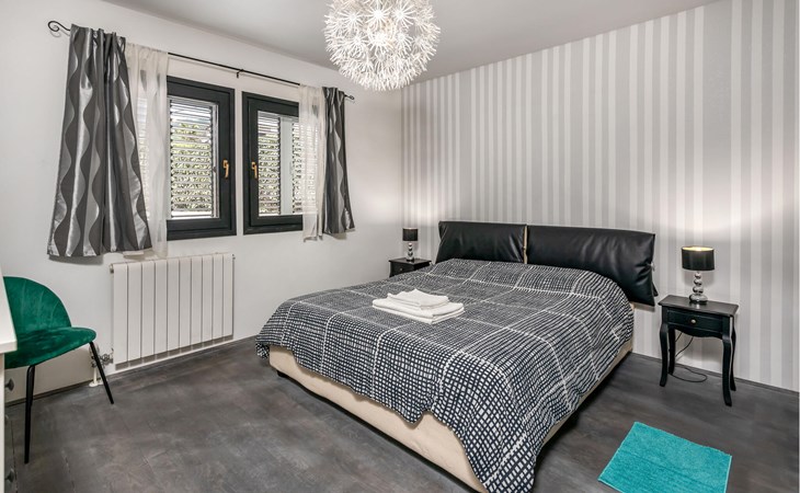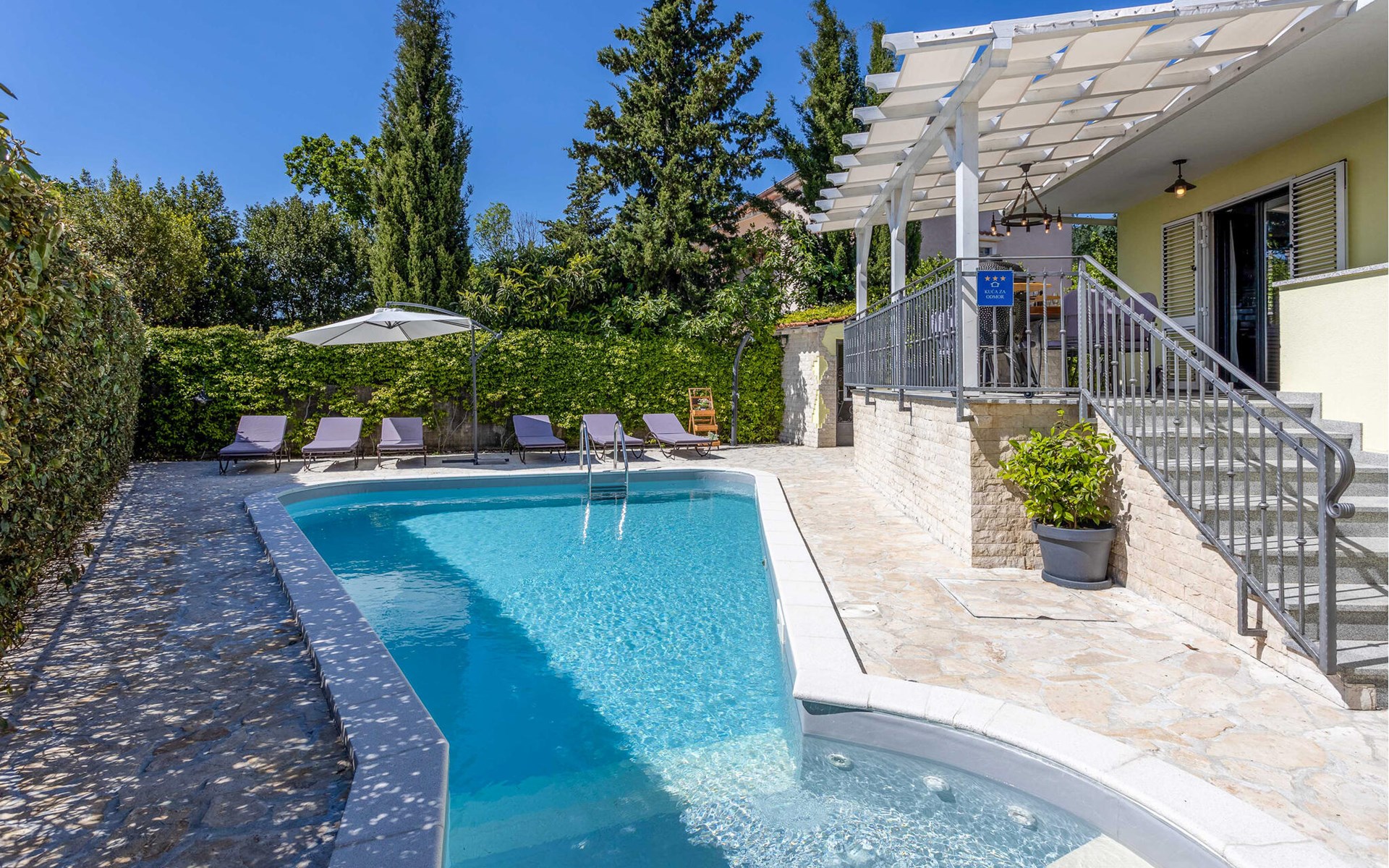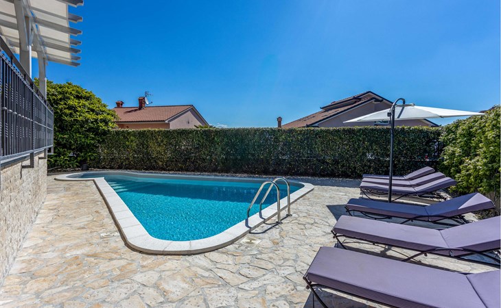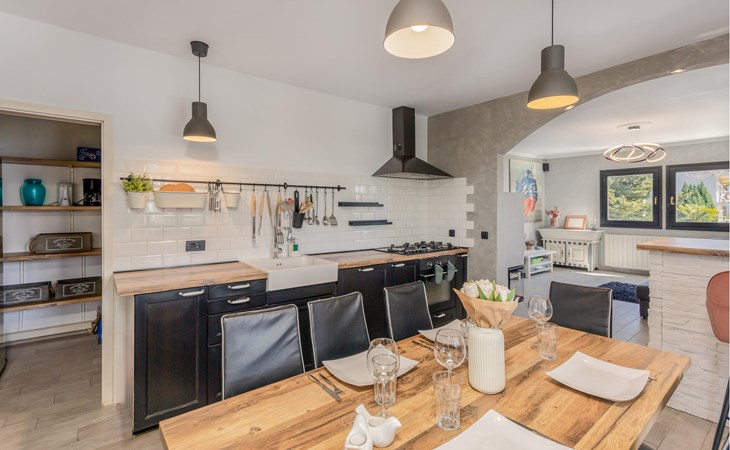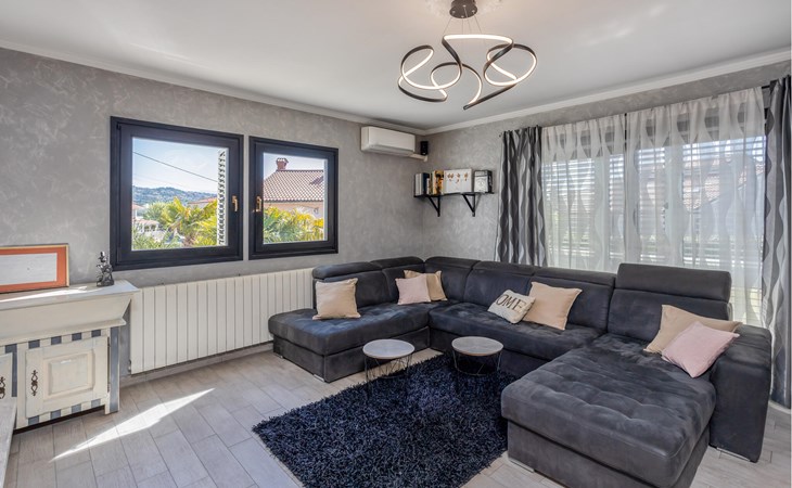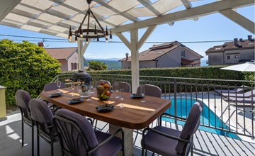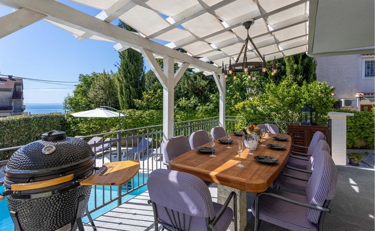 This cosy holiday home is located in the quiet village of Pobri, just above the town of Opatija. On the ground floor is the living room with kitchen and dining area, while upstairs there are three bedrooms and a bathroom. Behind the house, on the fenced plot, is the garden terrace with barbecue and the outdoor pool. The whirlpool is located in a part of the pool where you can enjoy the hydromassage. The picturesque town beaches of Opatija, Iii and Volosko can be reached in about ten minutes by car. However, if you want to spend some time exploring the area, then drive along the coast where you can visit beautiful little towns such as Lovran, Medveja and Moenika Draga. Opatija offers many events, especially in the summer months. We recommend evening strolls along the Lungomare promenade, where you can sample fish specialities on the open terraces of the restaurants.