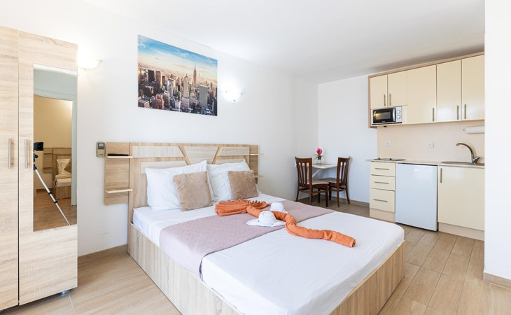 It is only a few steps from this airy holiday apartment to a pretty pebble beach, where you can leave everyday life behind you as a couple. Prepare your meals in the practical kitchenette and plan your adventures at the inviting dining table. Treat yourself to relaxing siestas after long hours in the sun and round off the day with a good book or a board game.