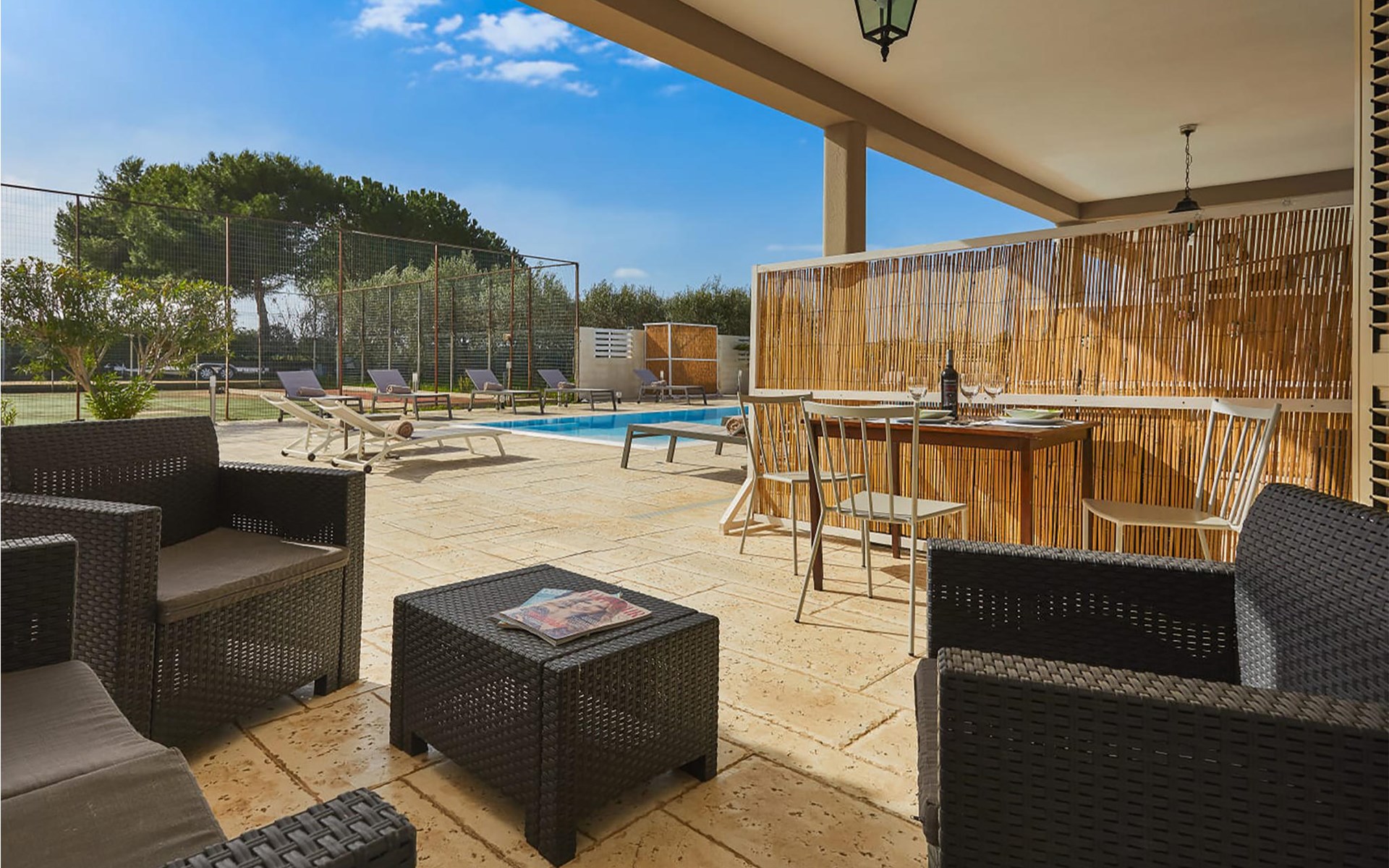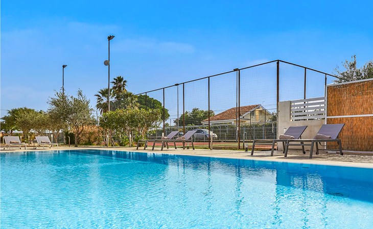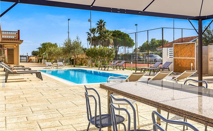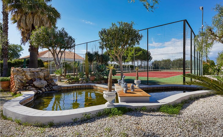 From the veranda on this side you have direct access to the pool area and barbecue and relaxation area. Outside you can expect large areas with sun loungers, umbrella, barbecue corner, children's playground, tennis court, fountain and bowling green. The winter pool cover system allows you to keep the water temperature comfortable.