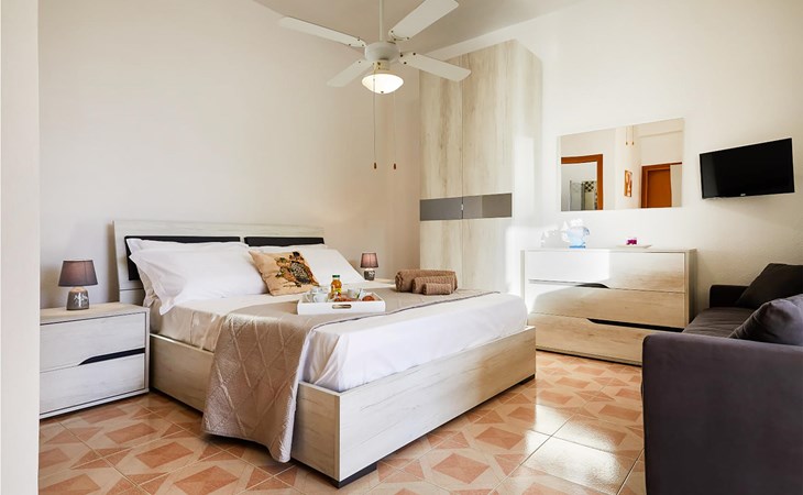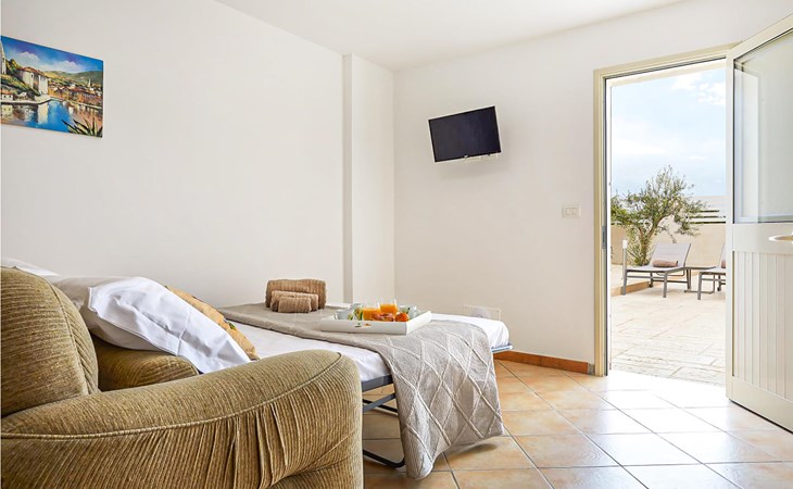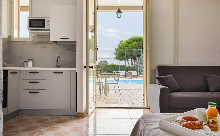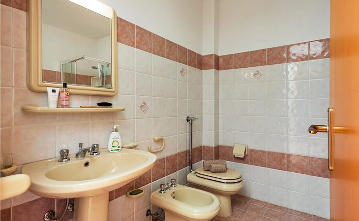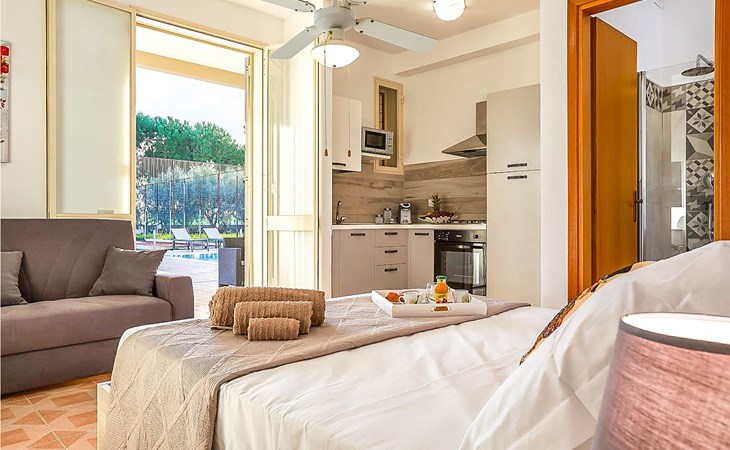 The main area consists of two bedrooms, kitchen, living room with the possibility of an extra bed, bathroom, a beautiful and spacious veranda overlooking the garden and pool and a mezzanine with access from the terrace with double bedroom with bathroom. The analge is completed by two studios with private bathroom and with the possibility of a kitchenette. The side area offers a kitchen / living room with double sofa bed, double bedroom and bathroom with shower.