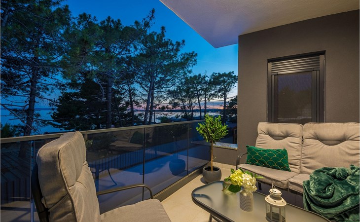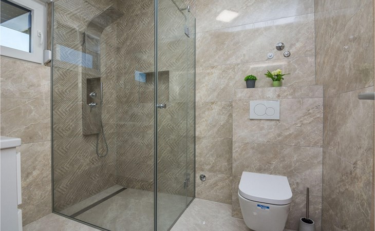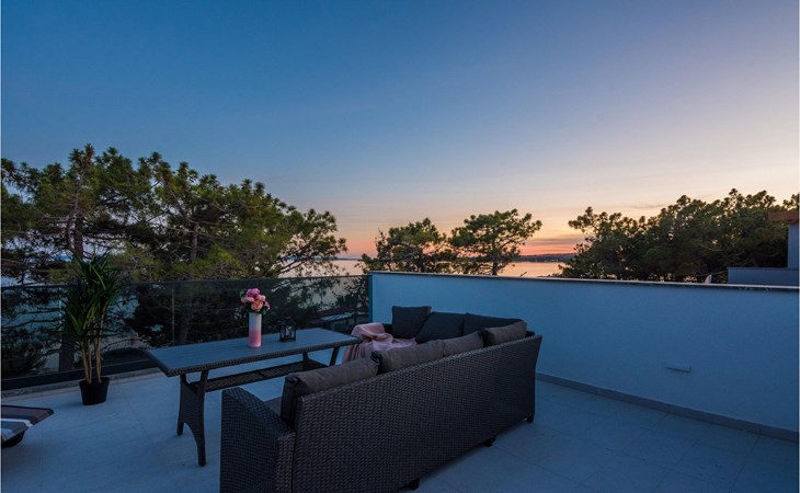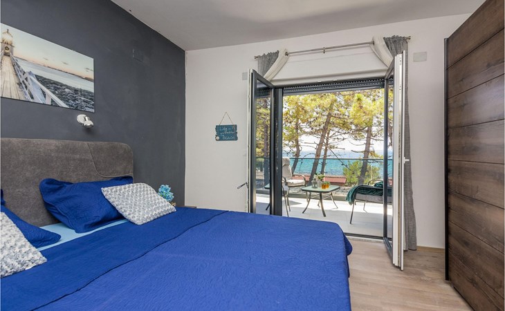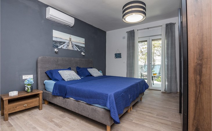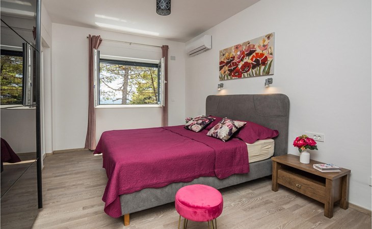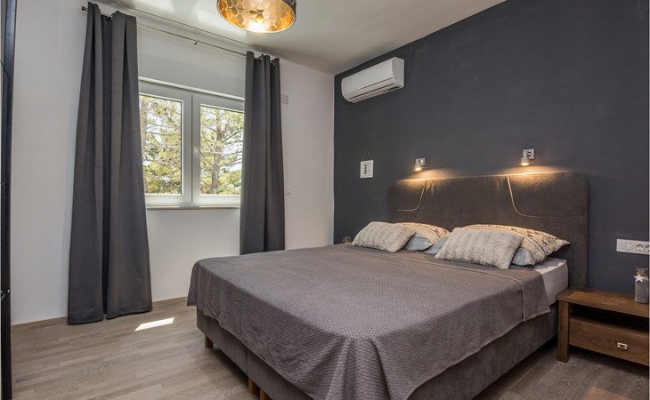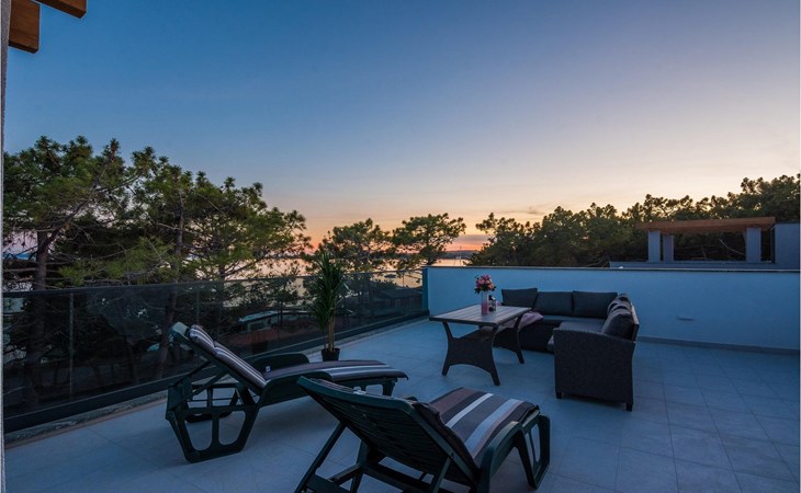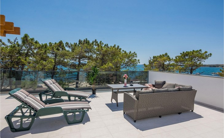 Villa Filip, with its spacious 400 m2 space, and a distance of only 50 m from the beach, offers accommodation for a maximum of 8 people and is fully air conditioned. On the upper floor there are three bedrooms with double beds, two bathrooms with shower, and a terrace with seats and a table where you can completely relax and enjoy your morning coffee with the sound of the waves and the view of the greenery. On the roof of Villa Filip there is another terrace with a small corner set, a table and two deck chairs.