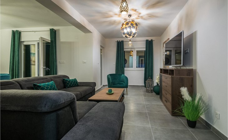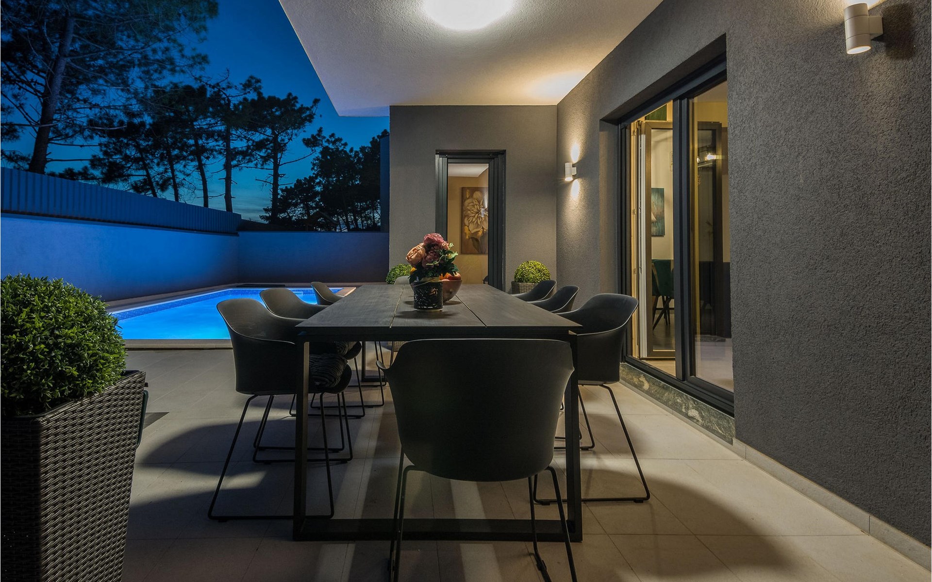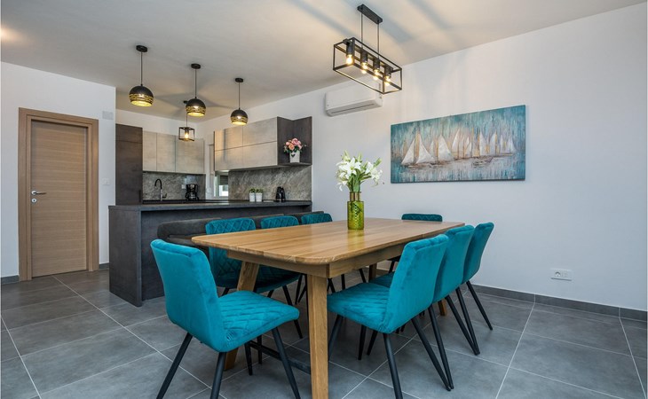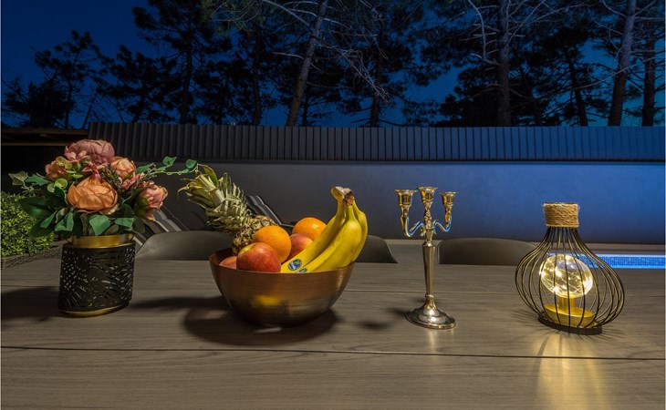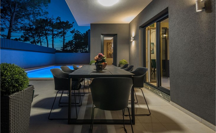 On the ground floor is another bedroom with double bed, bathroom with shower, pantry, and modern living room with corner sofa, armchair, coffee table and TV, where you will surely enjoy watching your favourite movies and series with your family. The beautiful, breathtaking kitchen, together with the dining room and dining table for 8 people, will be one of your favourite rooms because you will enjoy preparing delicious meals with your loved ones, and you can try all of the above on an outdoor gas grill. Near the dining room there is an outdoor terrace with a table for 8 people, and a pool of 21 m2 where you can cool off during the day or night, and next to which 4 sun loungers are perfect for relaxing in complete privacy.
