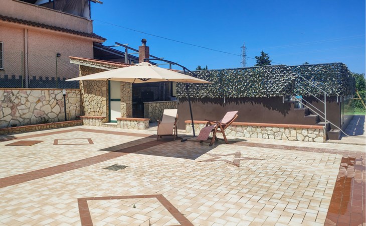 The veranda of the house and the tiled plot, which you can use as a sun deck and enjoy the sun, invite you to linger. The pool, which is situated on a platform, and the brick barbecue in the garden invite you to socialise outdoors.