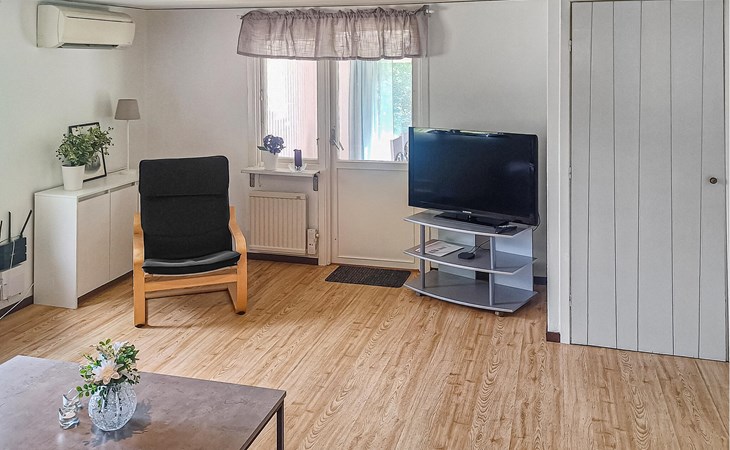 Well-equipped and beautiful cottage with conservatory, from which a glass door leads to the terrace. You live near Torpa in Småland. Tiled bathroom, central vacuum cleaner. Undisturbed and beautiful location with lake nearby, you can see the lake behind the trees. Lake Mäen is good for fishing, long walks along the shore and cycling in its surroundings. Nearby you will also find several nature reserves. Large lawn for playing. Shopping in Ljungby or Halmstad.
