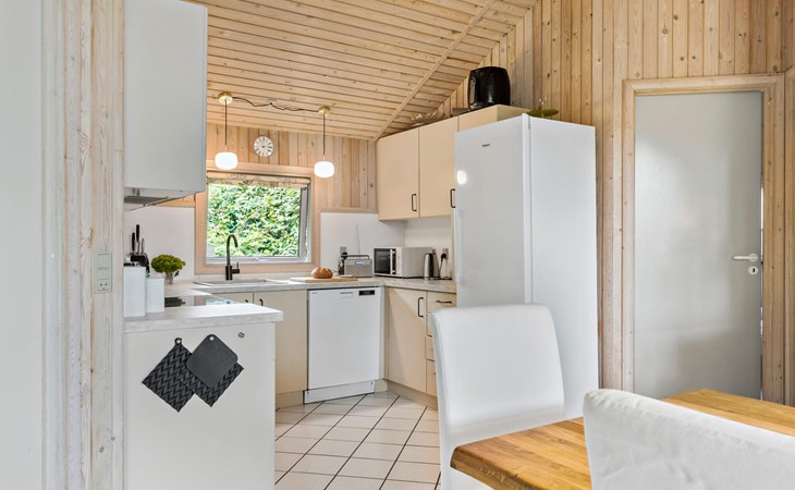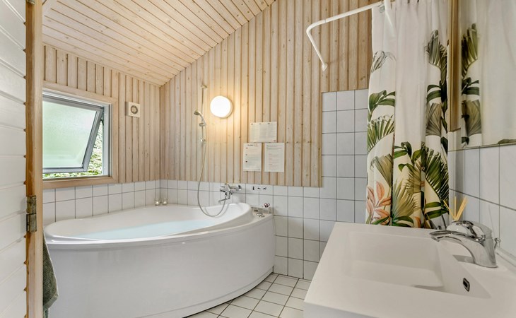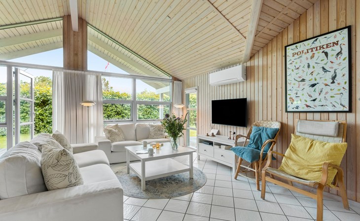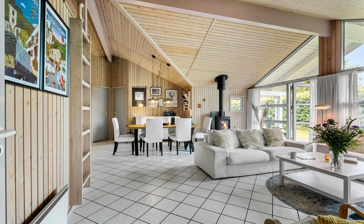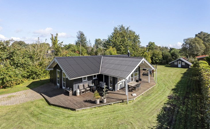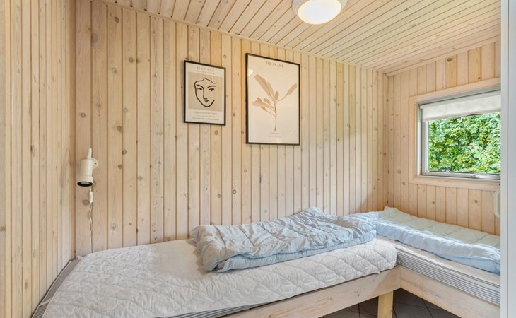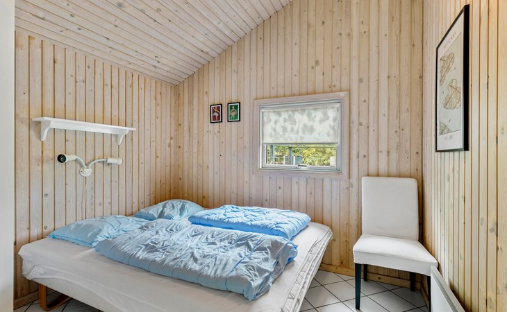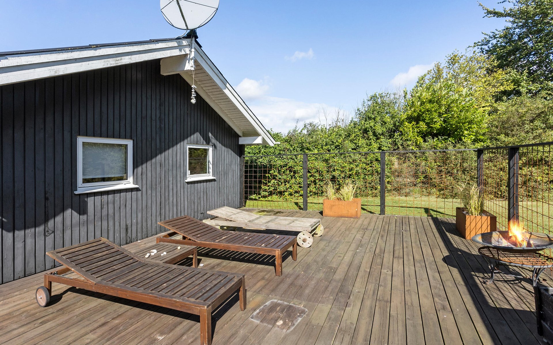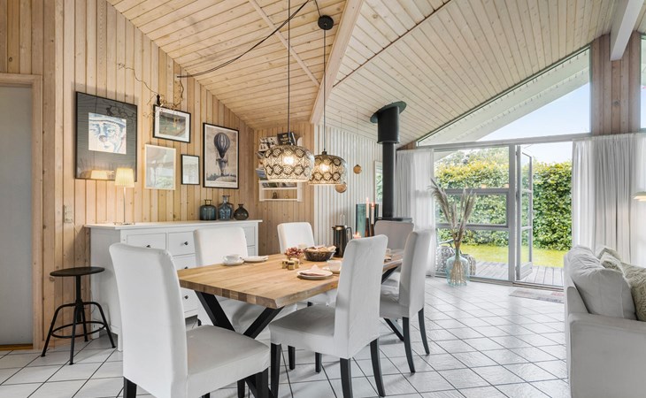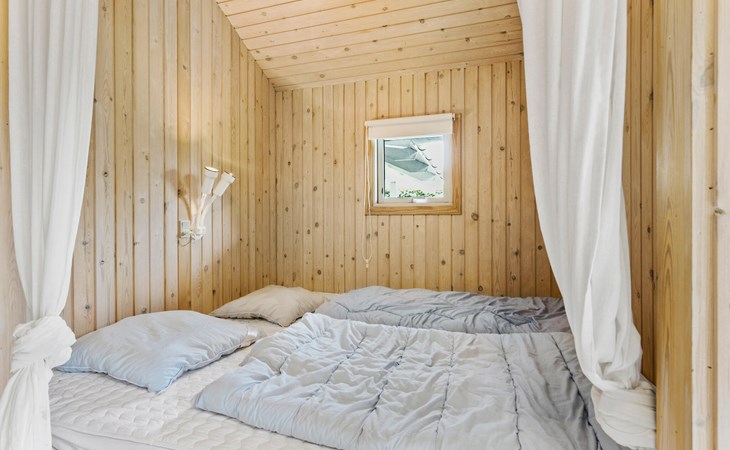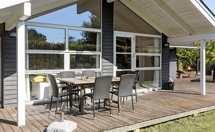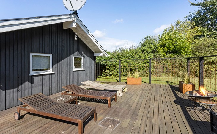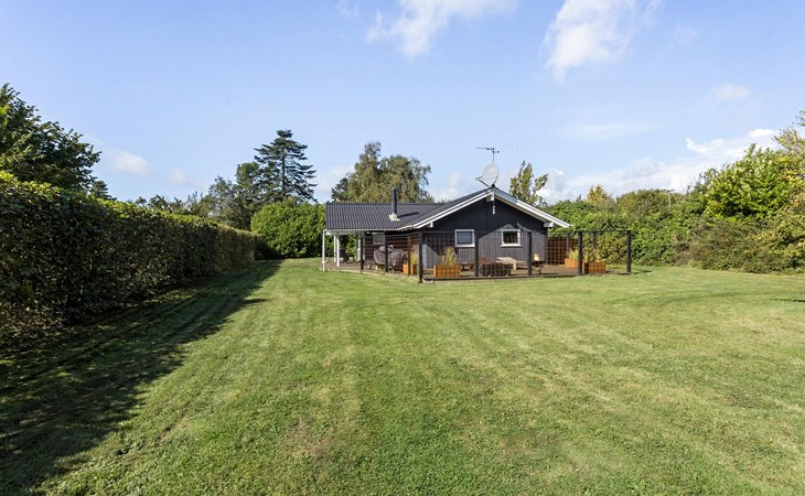 Located in the Bukkemose cottage area on the east coast of Langeland in picturesque surroundings, this beautiful wooden cottage is just 1.5 km from Langelands Golfbane clubhouse and 1 km from the Put and Take lake. There are tile floors with loose carpeting throughout the house. Two of the eight beds are in the alcove in the entrance hall. Here you will find really good opportunities for swimming and fishing from the shore. Large, beautiful open terraces and covered wooden terrace where you can enjoy the sun. On wet days you can find shelter under the smaller covered terrace. In high season a bathing jetty is set up at the water's edge.