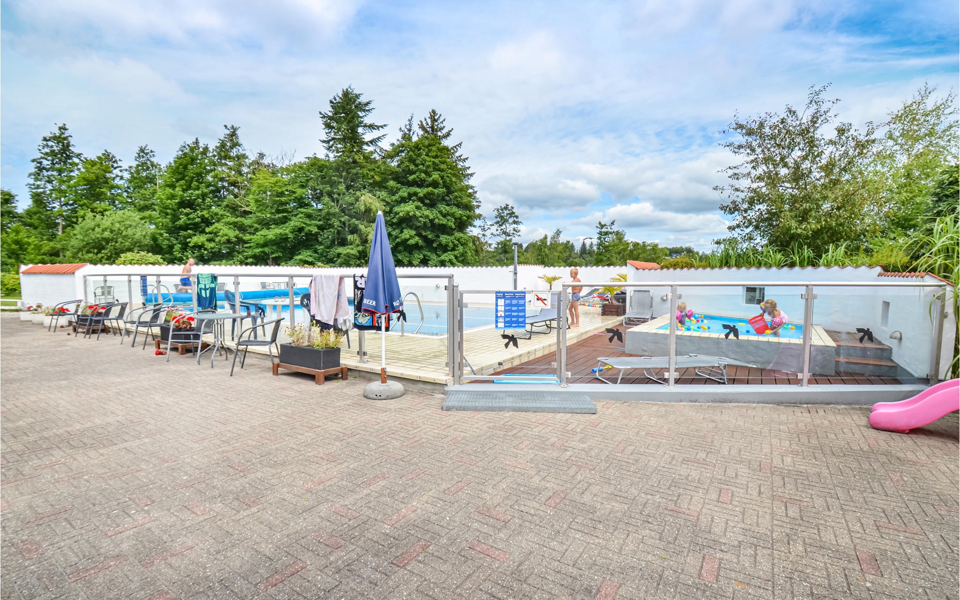 The extensive grounds offer space to play and relax outdoors. The shared pool with children's pool promises many hours of swimming fun for young and old. Round off the day with an evening around the barbecue or campfire.
