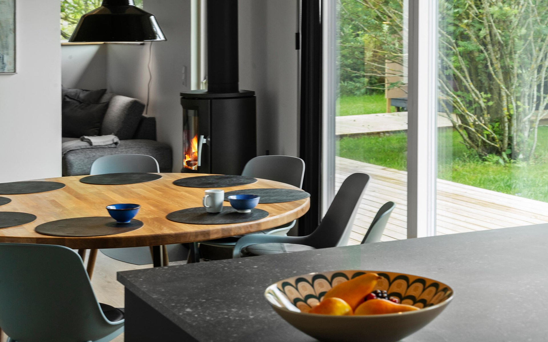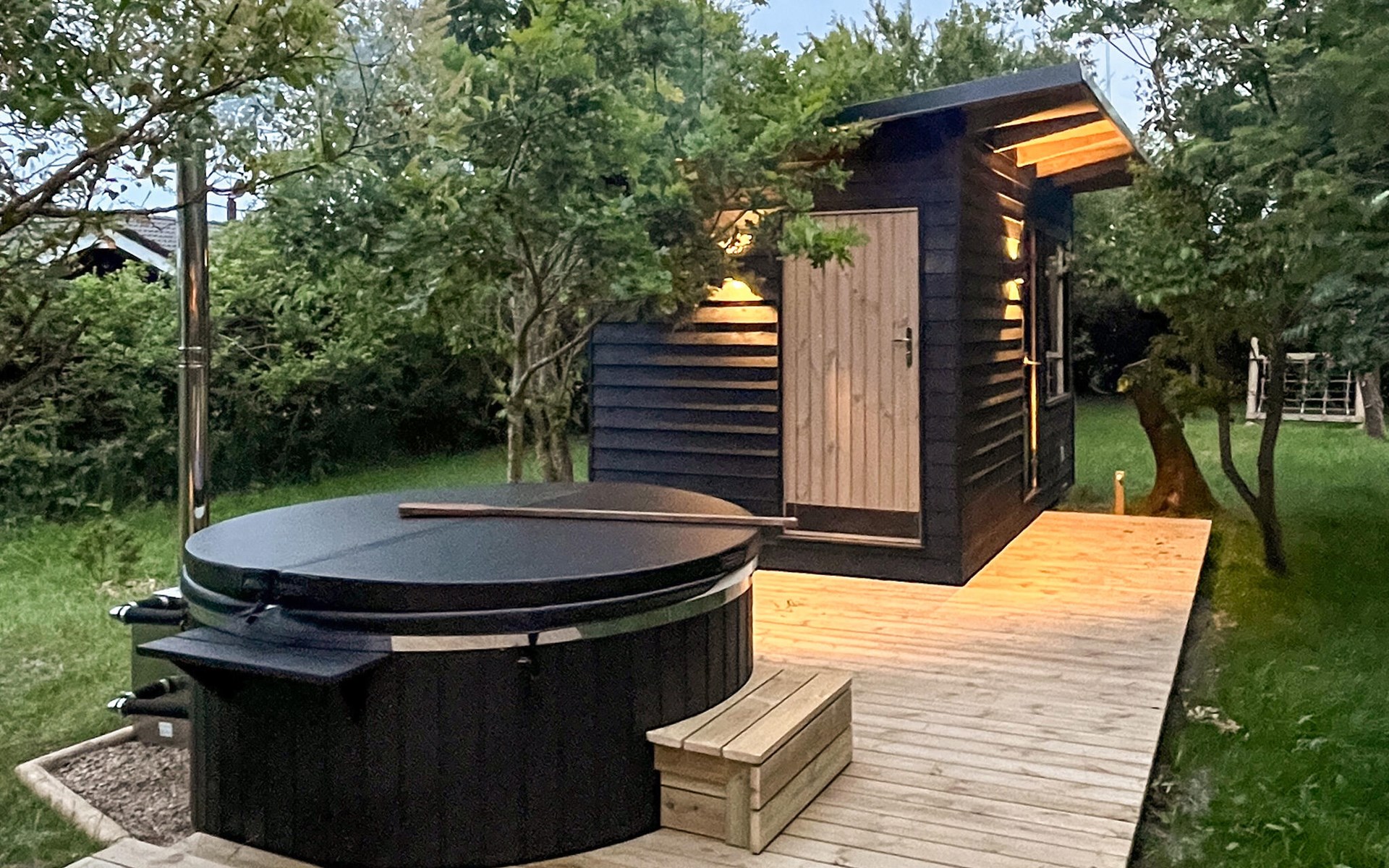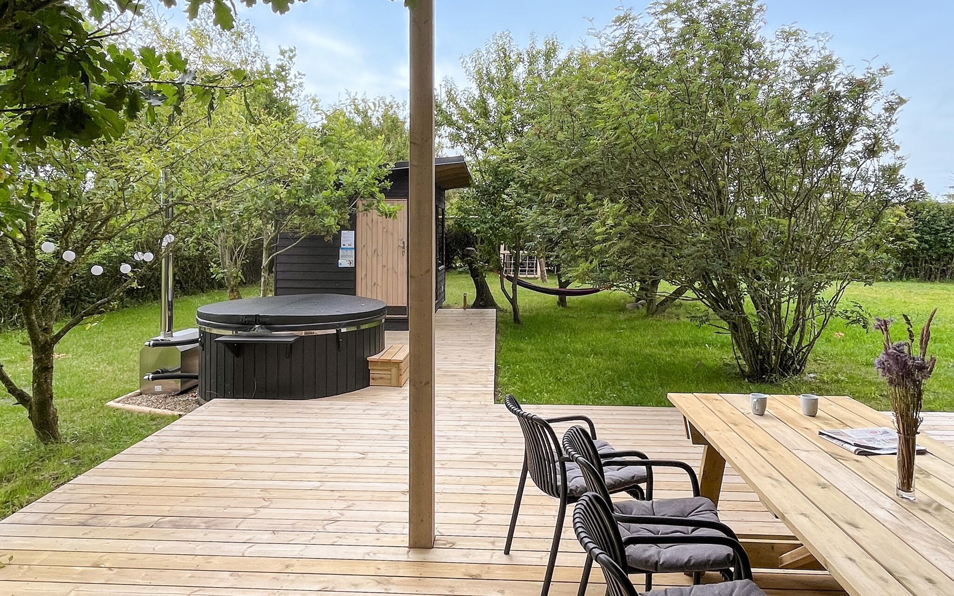 Step out into the large green garden in the morning and enjoy the peace and quiet with a cup of fragrant coffee. Refresh yourself in the whirlpool or relax in the Finnish wooden bath or sauna on cooler days. Gather round the fire pit in the evening and bake crispy bread on a stick over the fire while the stars begin to twinkle at dusk.