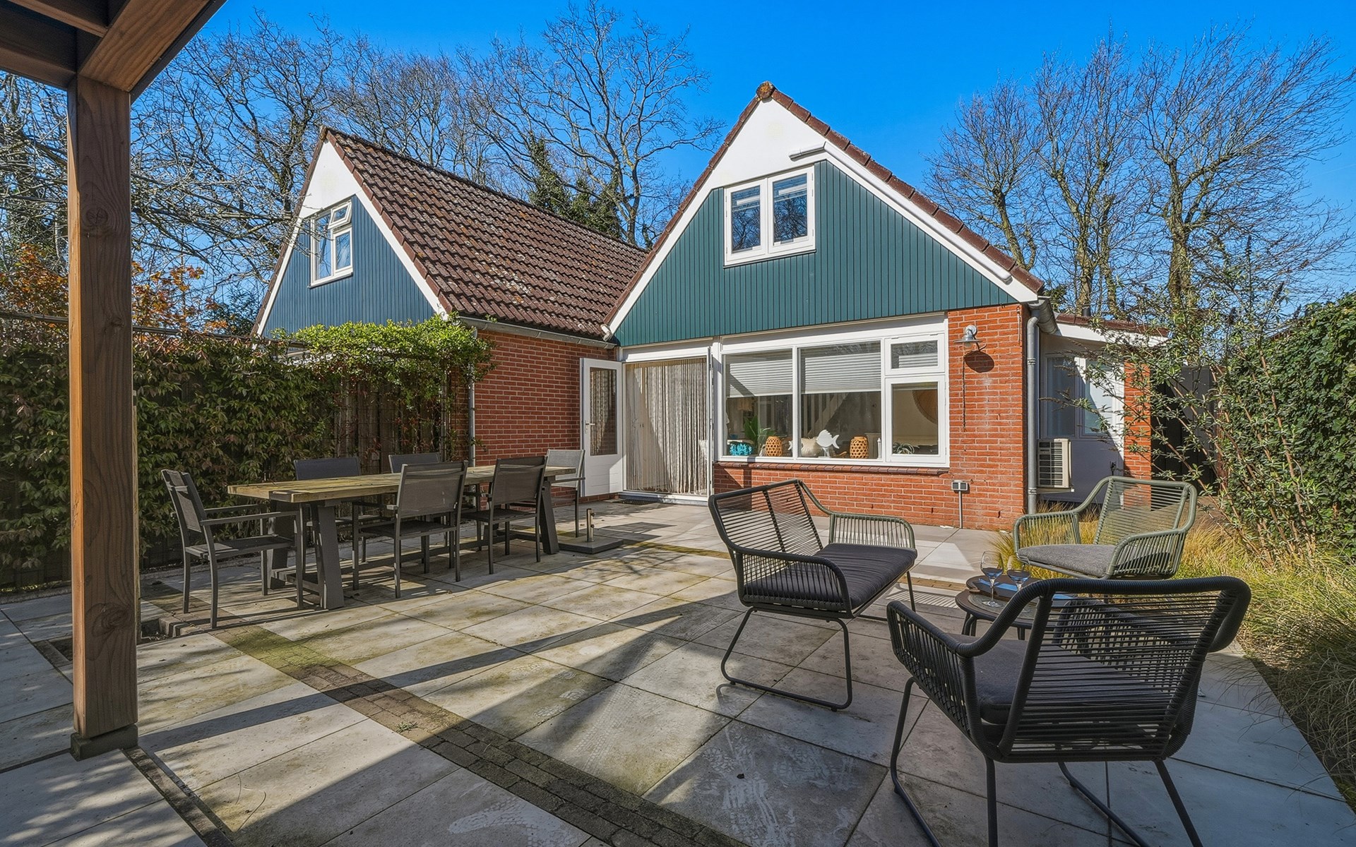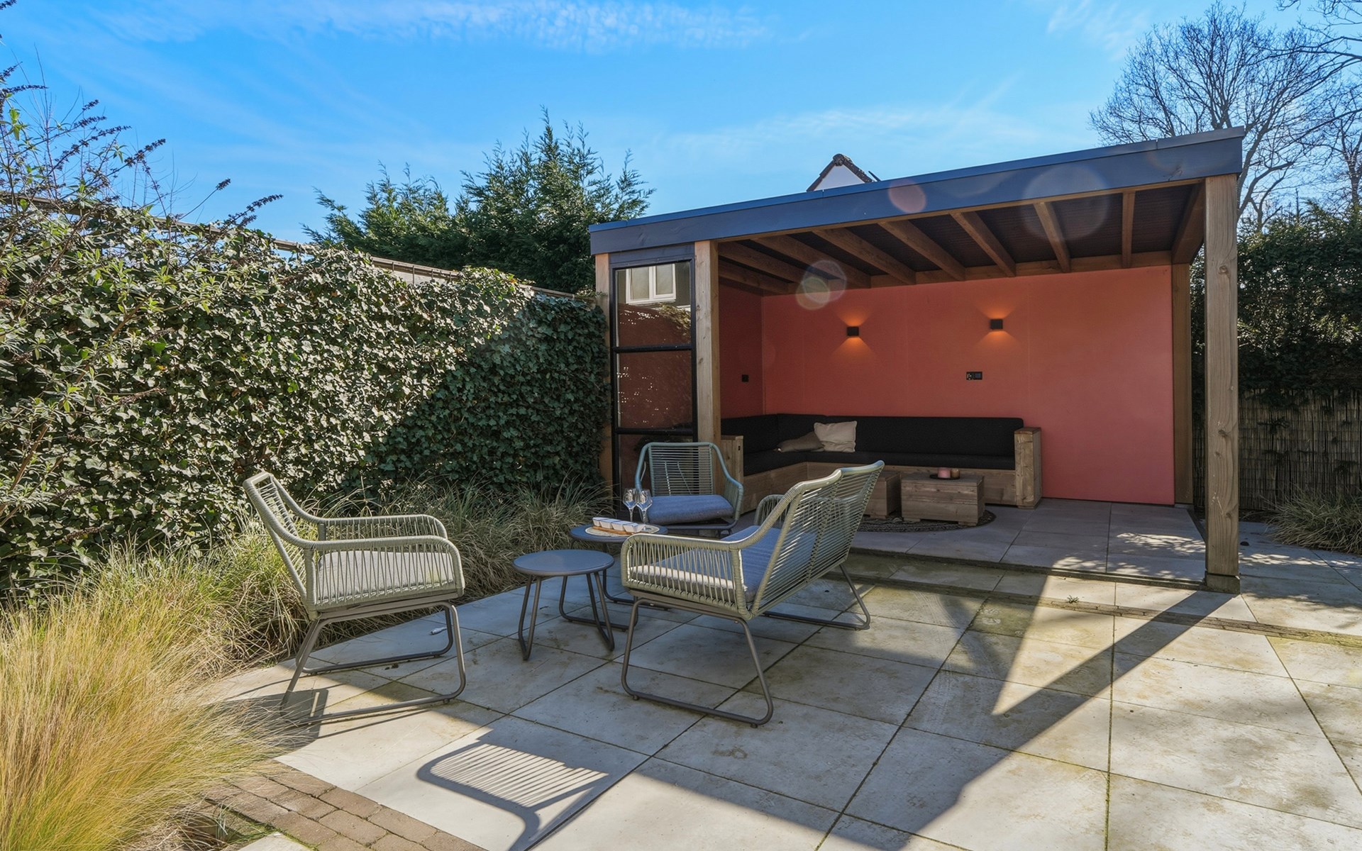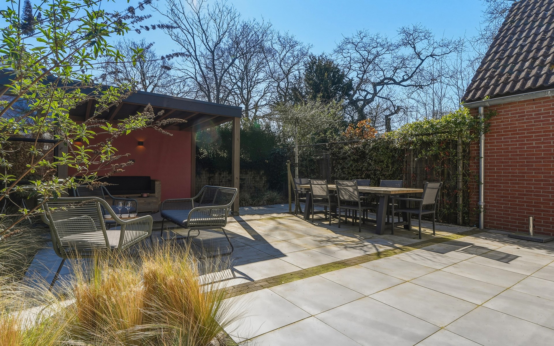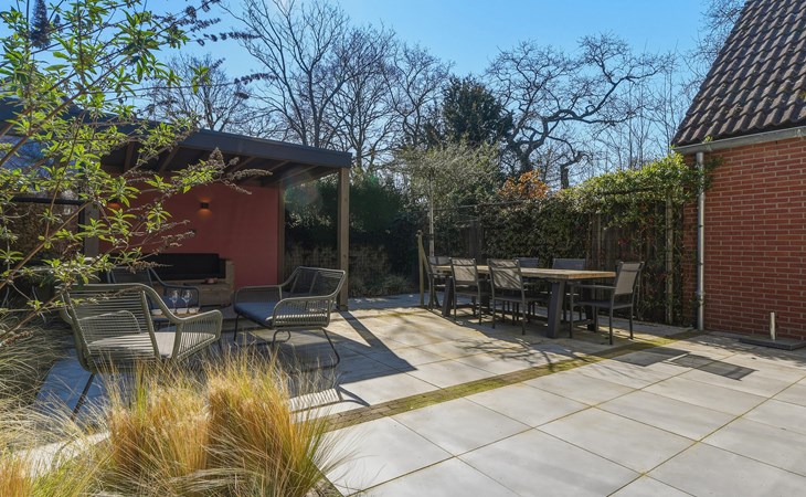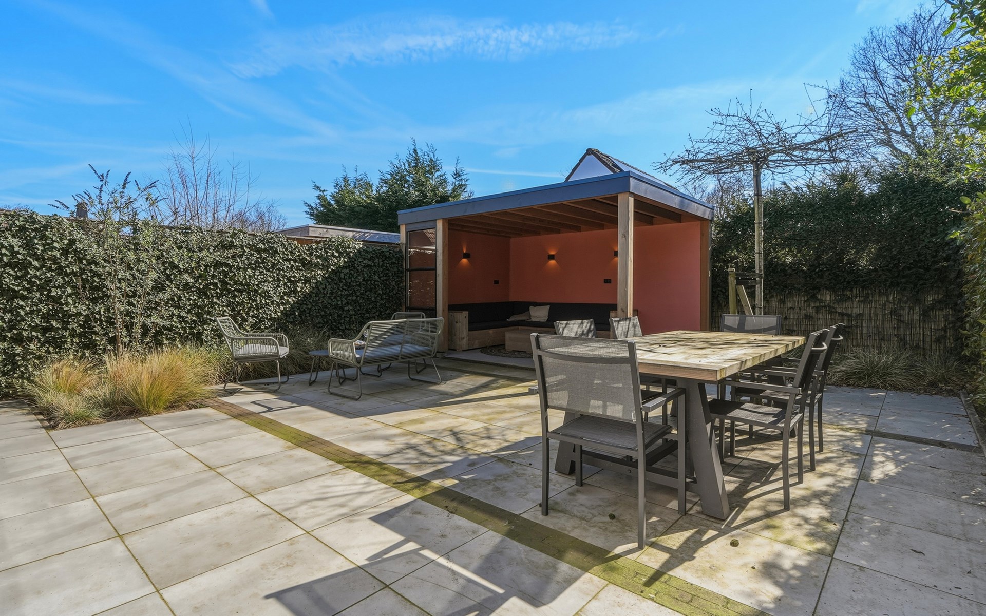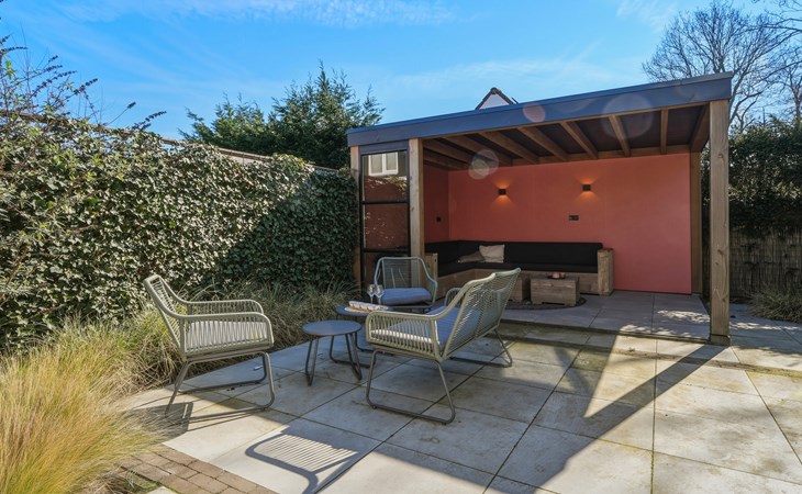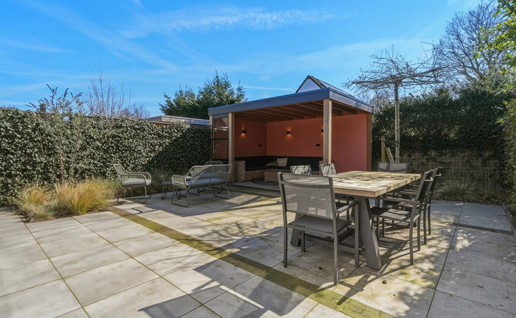 In the garden, there is a garden table with 6 chairs and 2 lounge chairs. A spacious canopy with a lounge sofa provides a wonderful place to sit in the shade on sunny days or enjoy the evening on cooler nights.