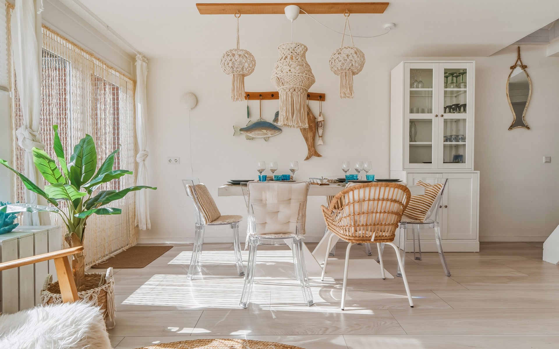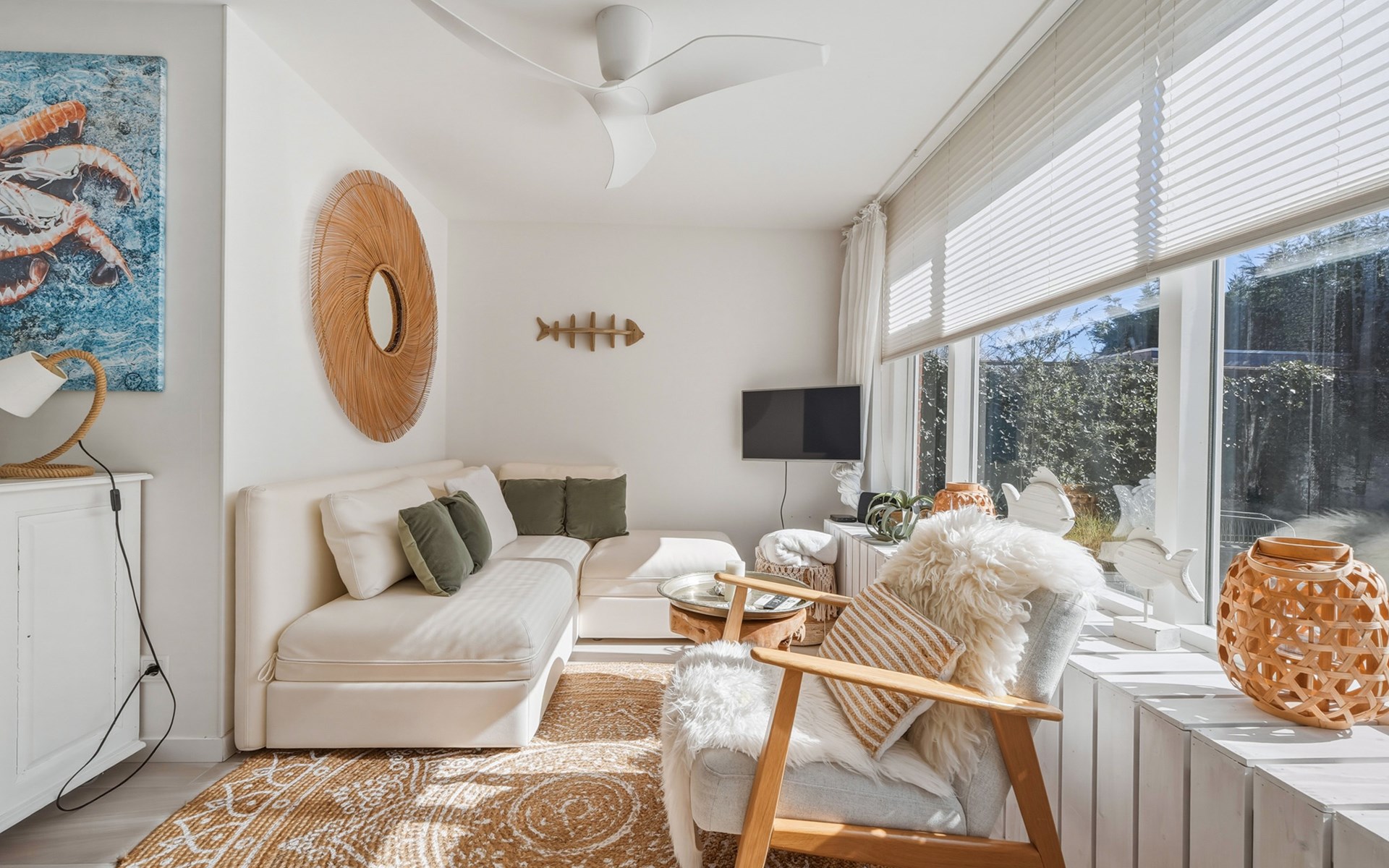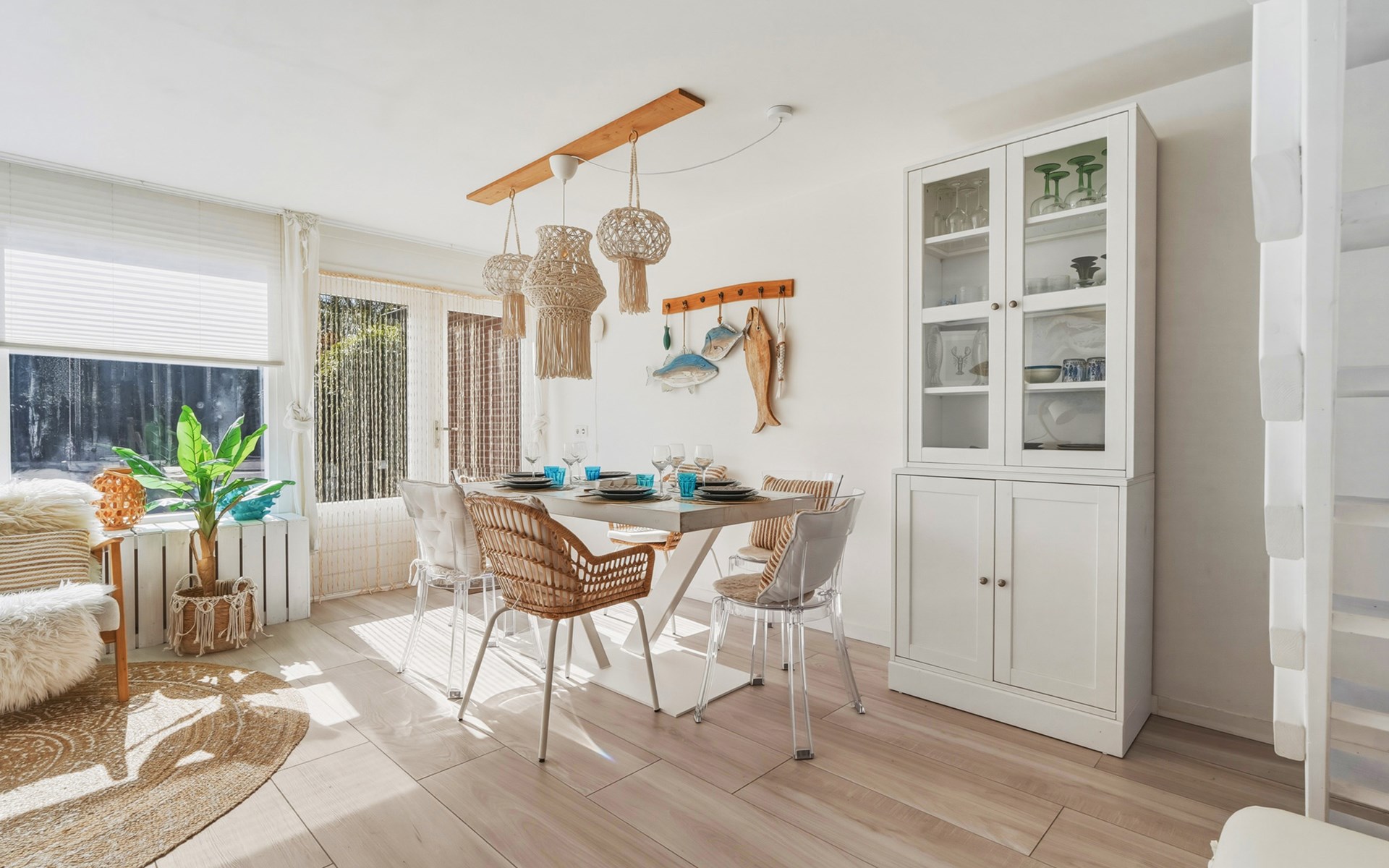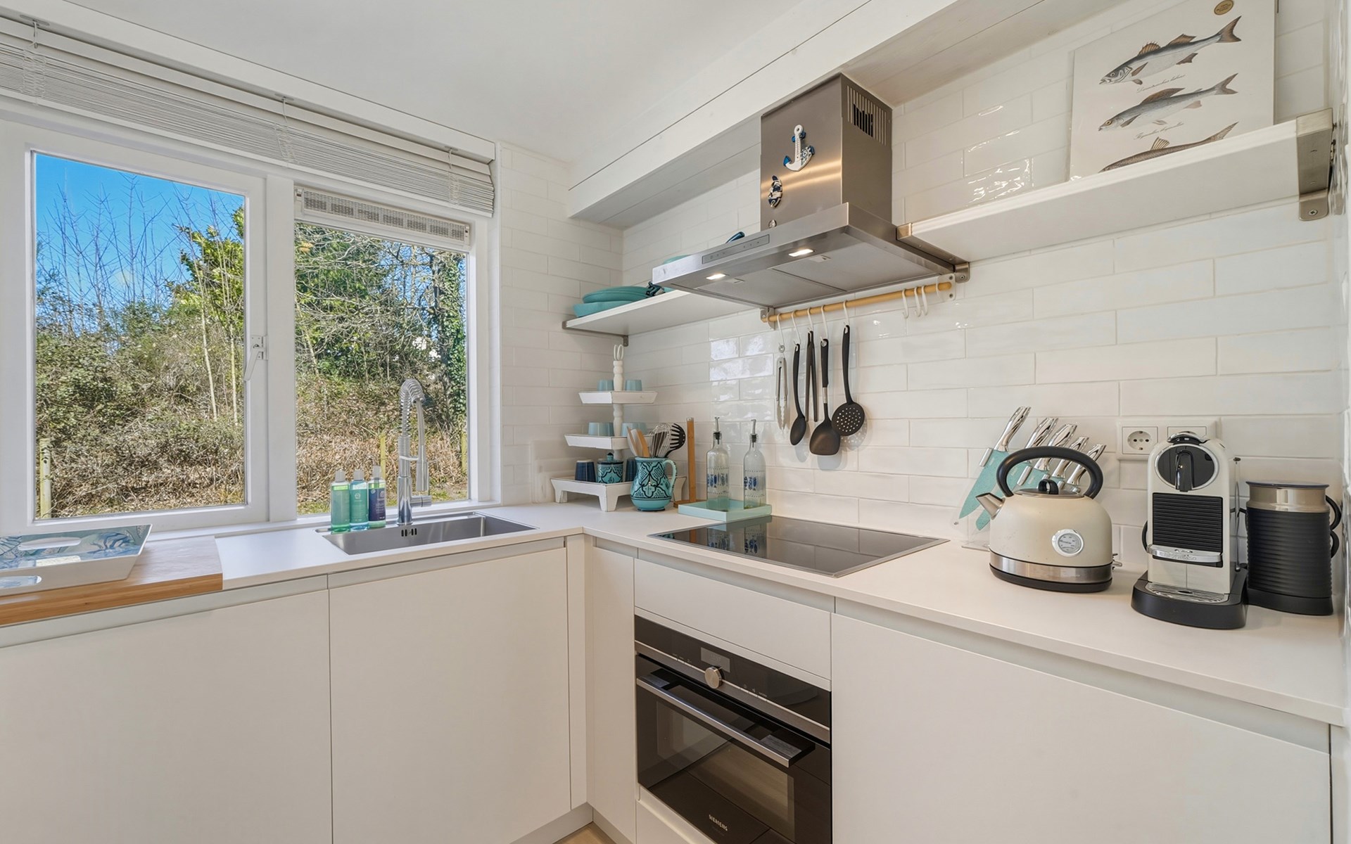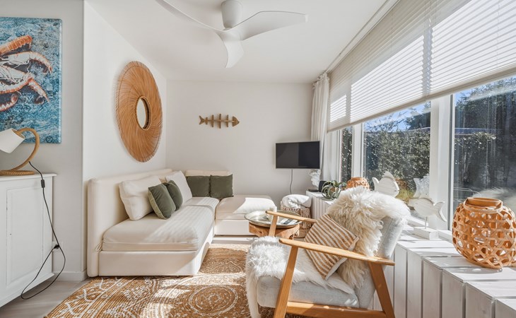 The holiday home is decorated with a nod to beach life and has delightful spots to recharge and relax. The interior is bright and cozy. The living room has a seating area with cable TV and a dining area with a dining table. The semi-open kitchen is fully equipped with a 4-burner gas stove, oven, refrigerator with freezer compartment, toaster, dishwasher, kettle, and a Nespresso machine.