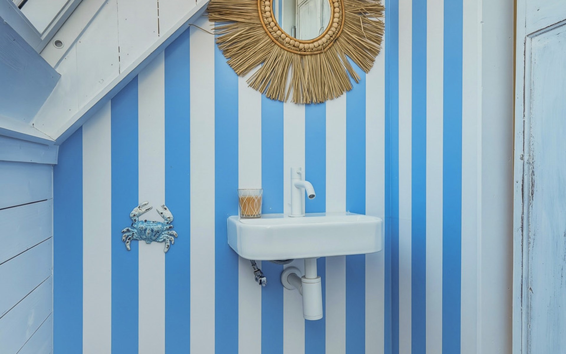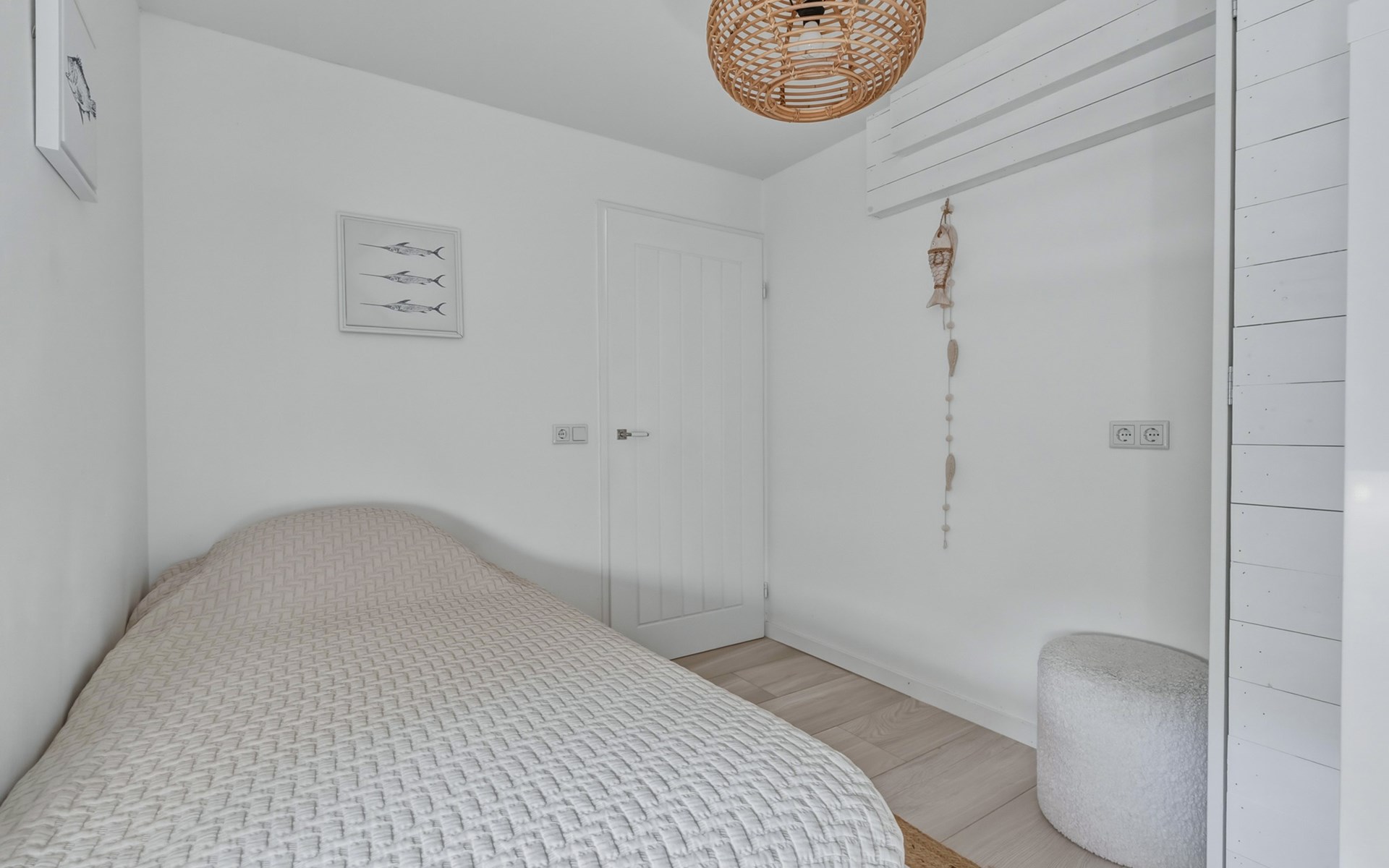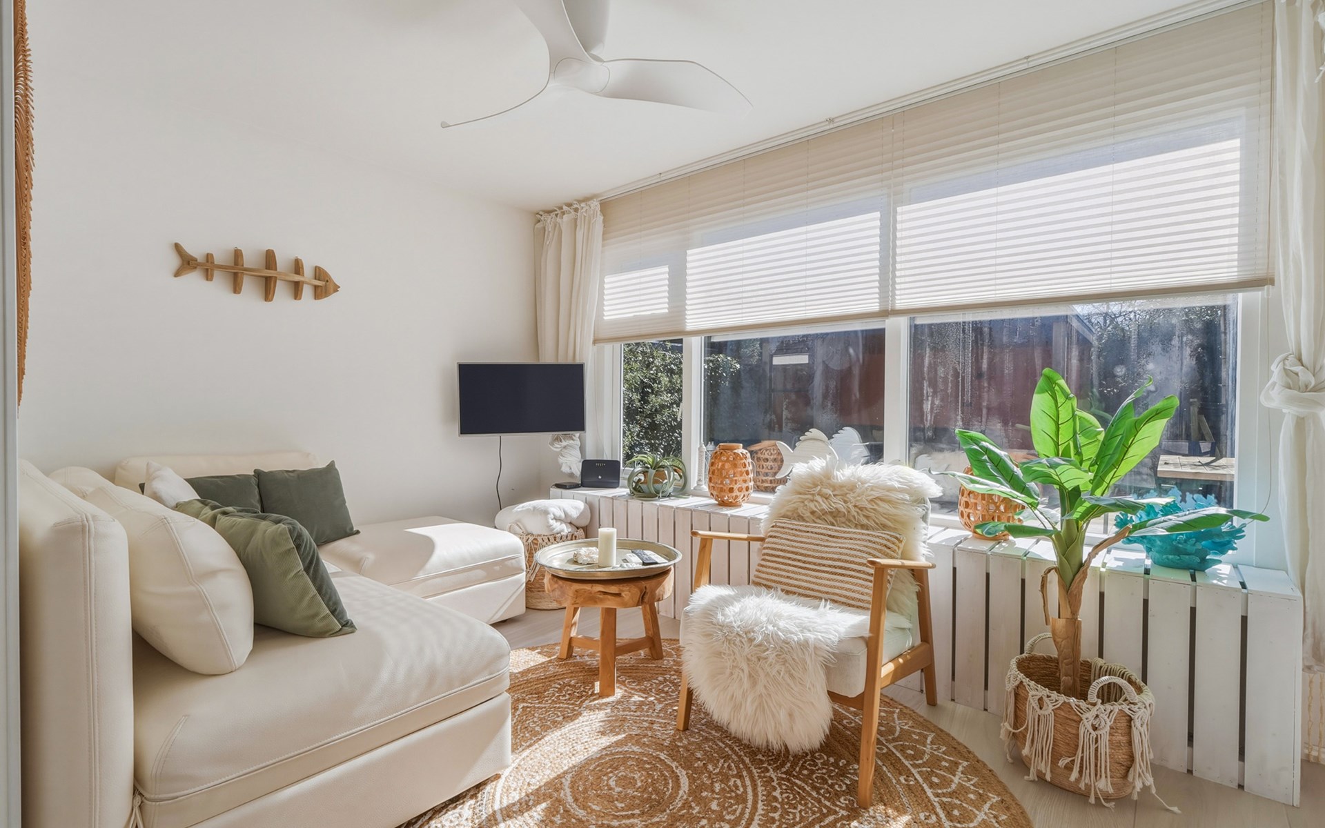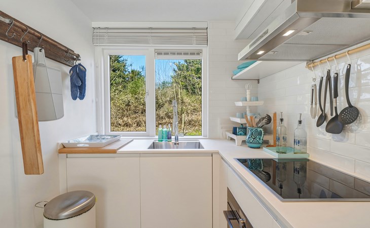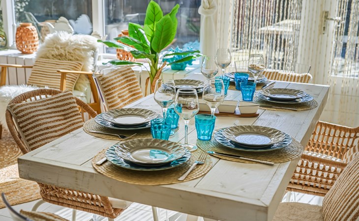 The holiday home is decorated with a nod to beach life and has delightful spots to recharge and relax. The interior is bright and cozy. The living room has a seating area with cable TV and a dining area with a dining table. The semi-open kitchen is fully equipped with a 4-burner gas stove, oven, refrigerator with freezer compartment, toaster, dishwasher, kettle, and a Nespresso machine.