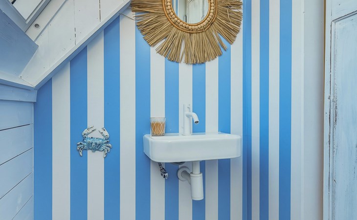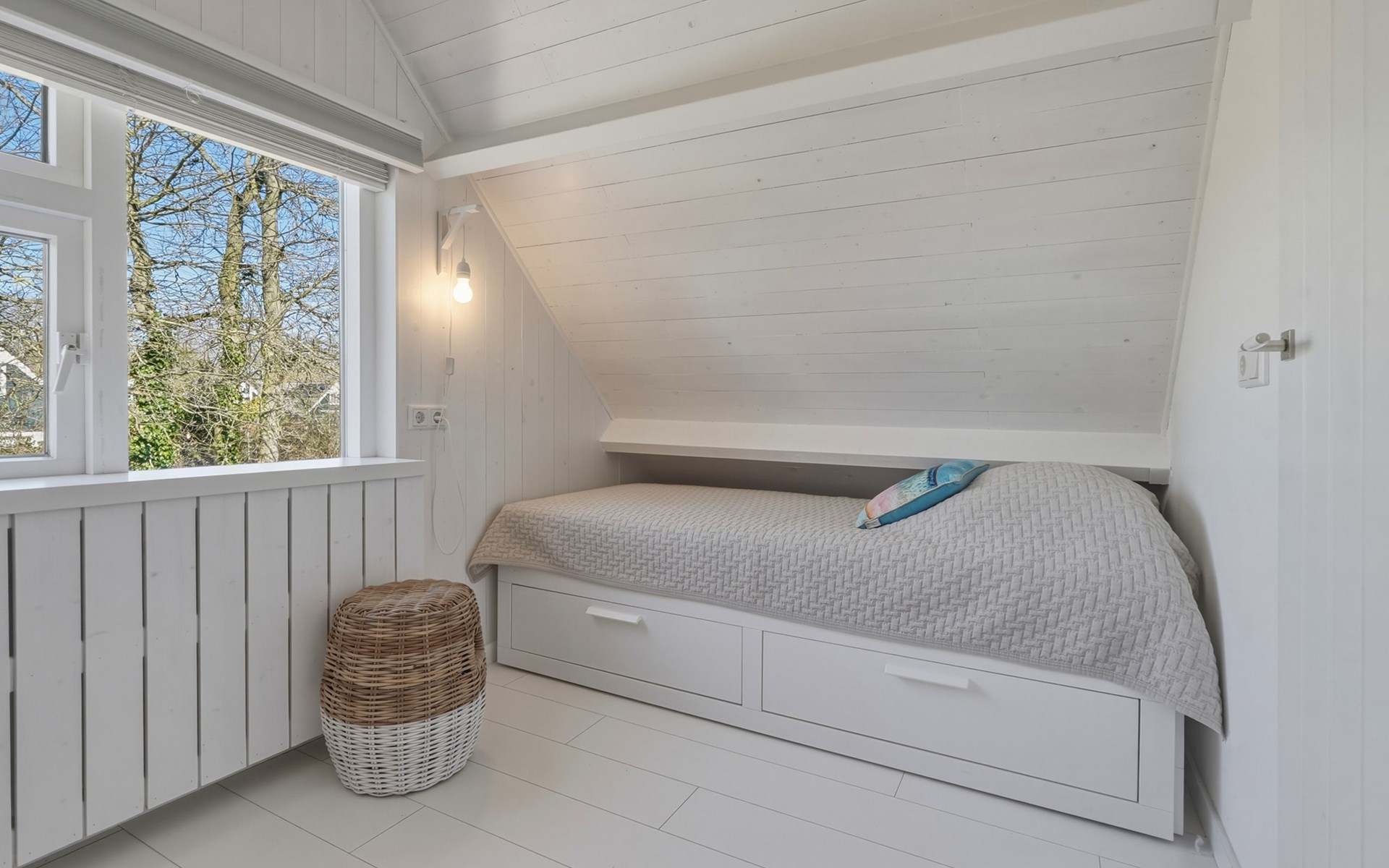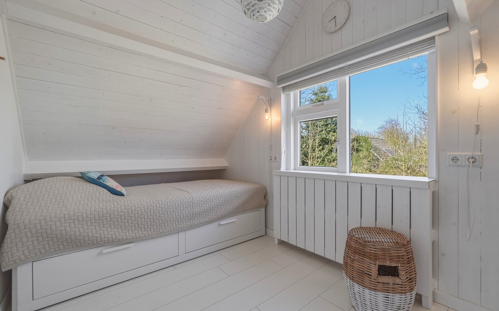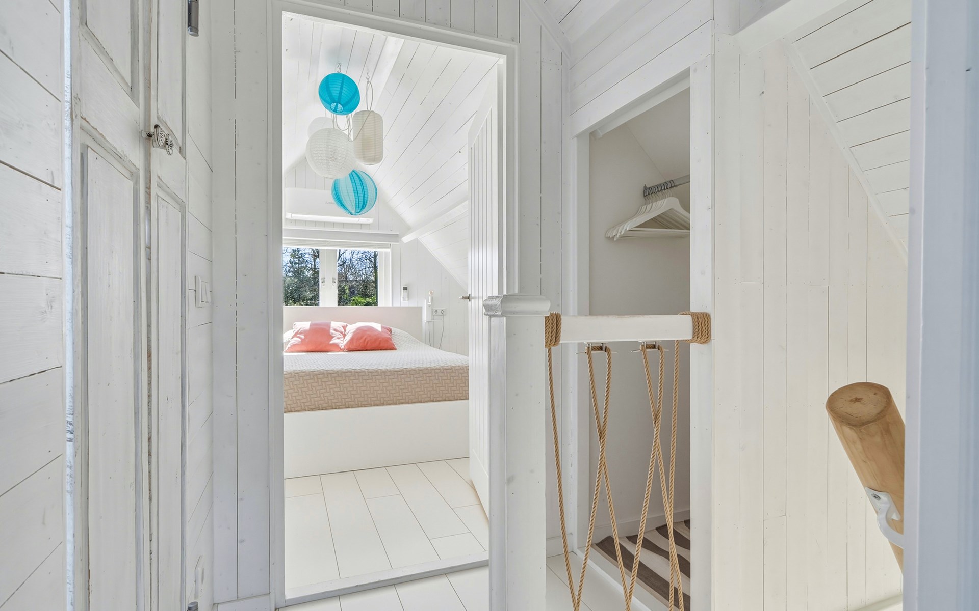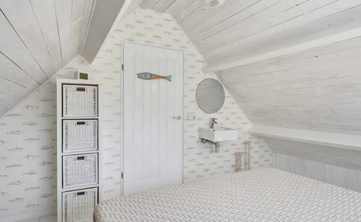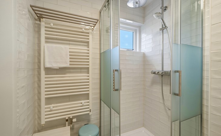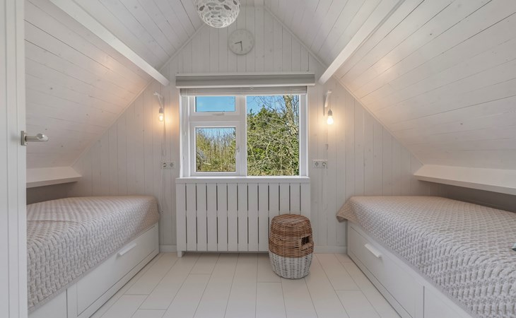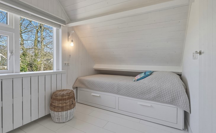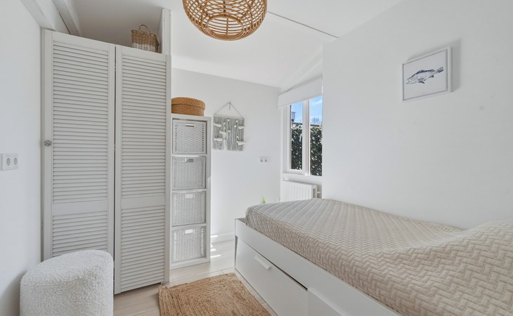 The bathroom is downstairs and has a shower, washbasin, and toilet. On the ground floor, there is one bedroom with a single bed 90 x 200. The first floor has 2 bedrooms, one with a double bed of 160 x 200 and the other with two single beds of 90 x 200. A camping cot and high chair can be rented.