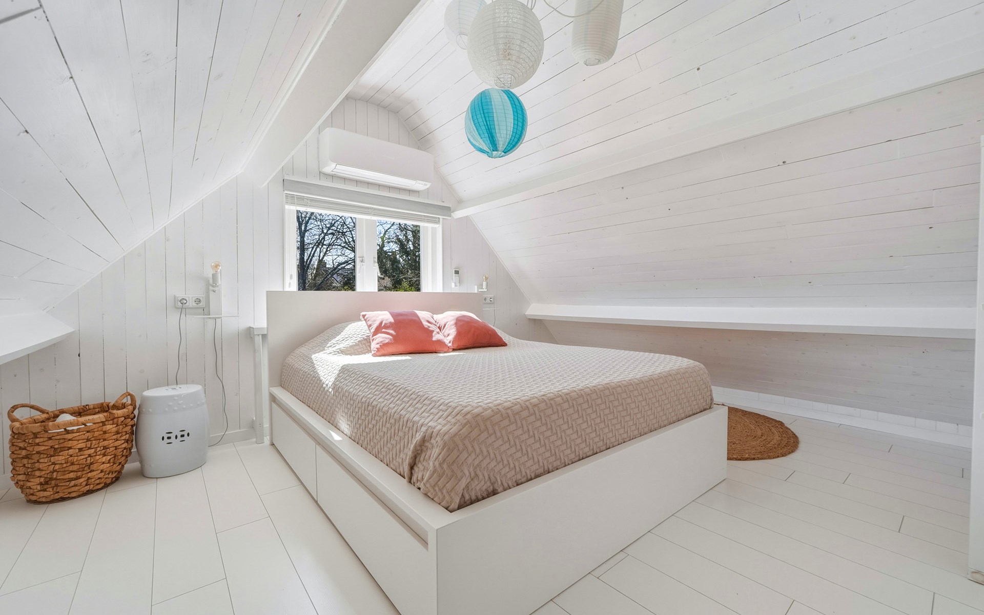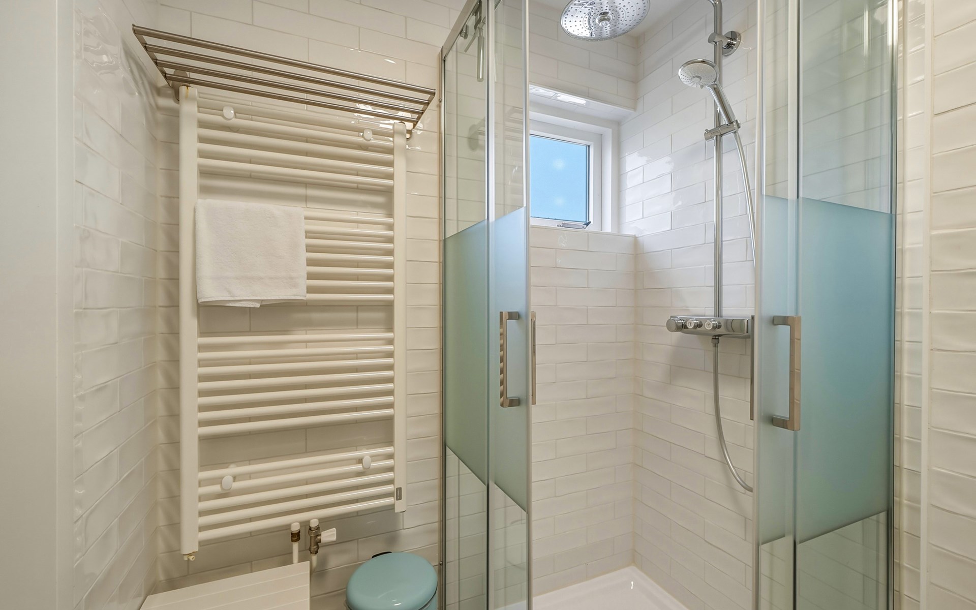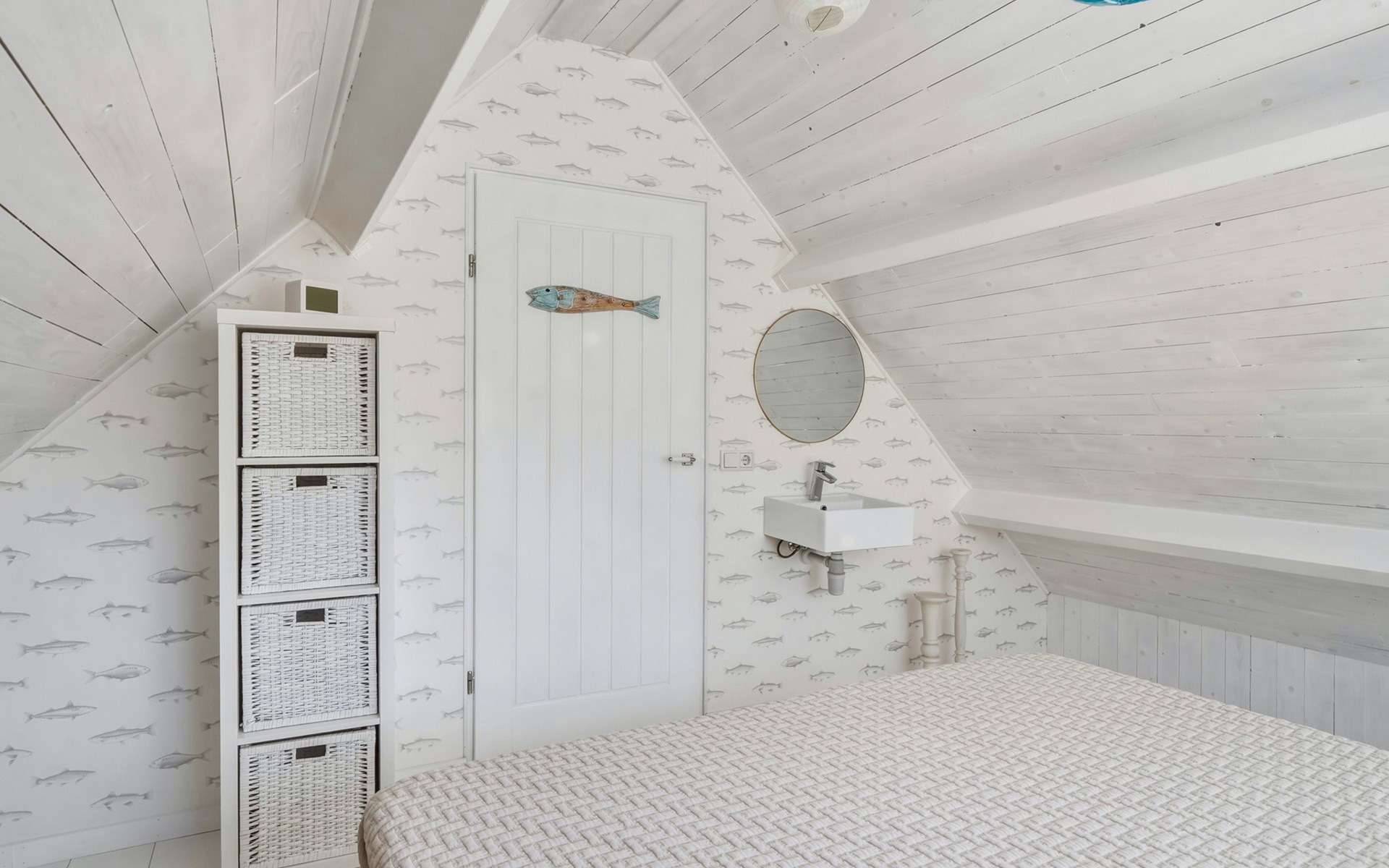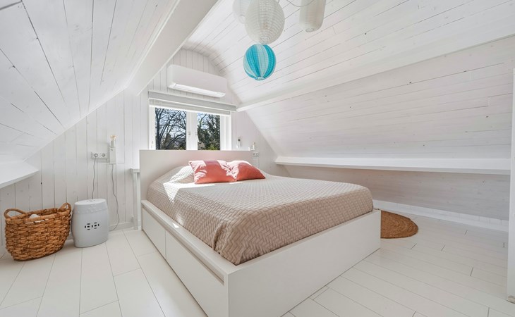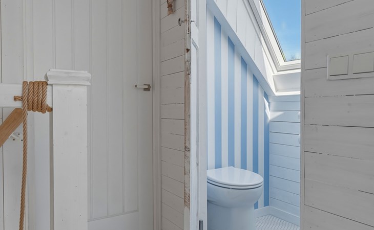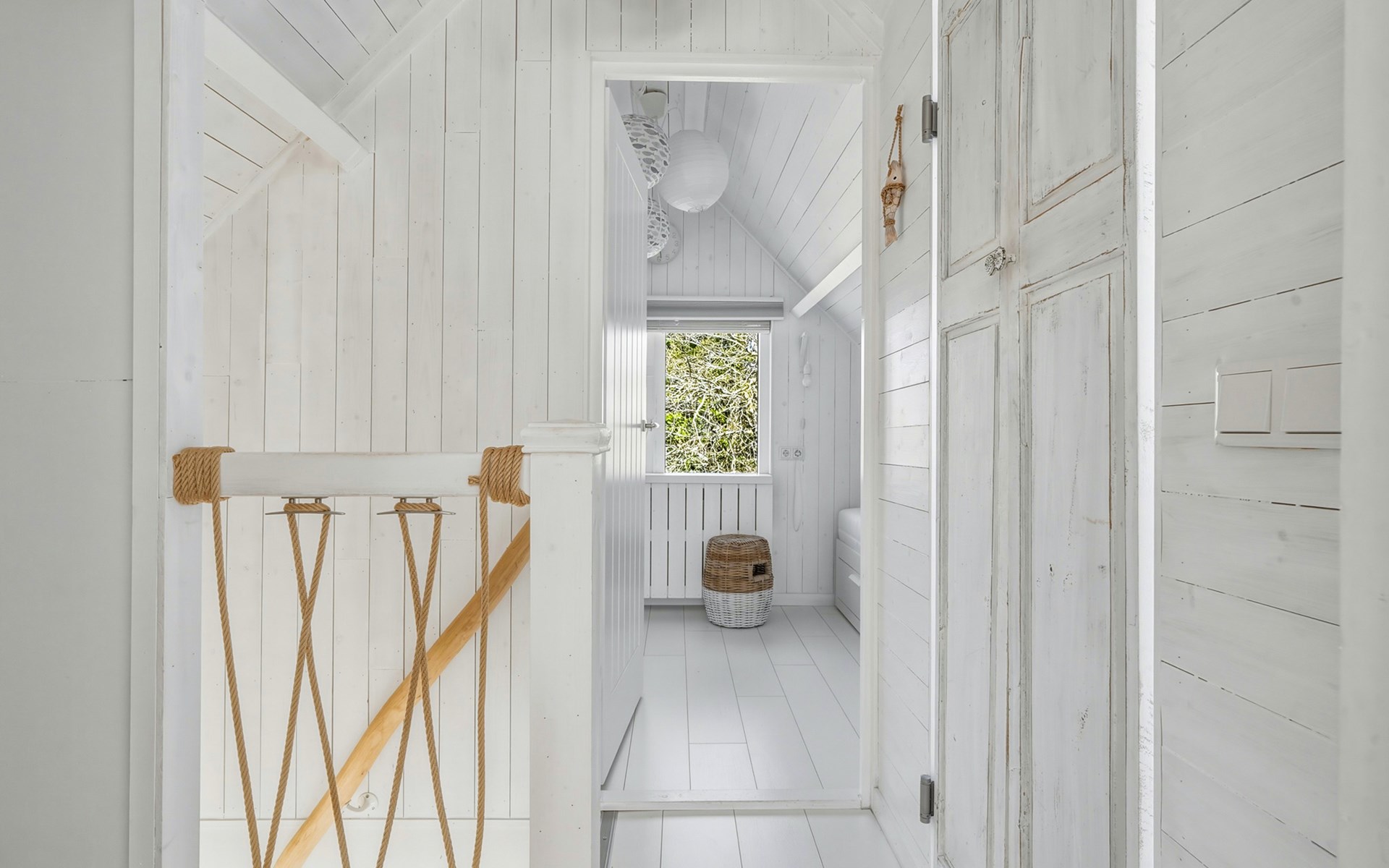 The bathroom is downstairs and has a shower, washbasin, and toilet. On the ground floor, there is one bedroom with a single bed 90 x 200. The first floor has 2 bedrooms, one with a double bed of 160 x 200 and the other with two single beds of 90 x 200. A camping cot and high chair can be rented.