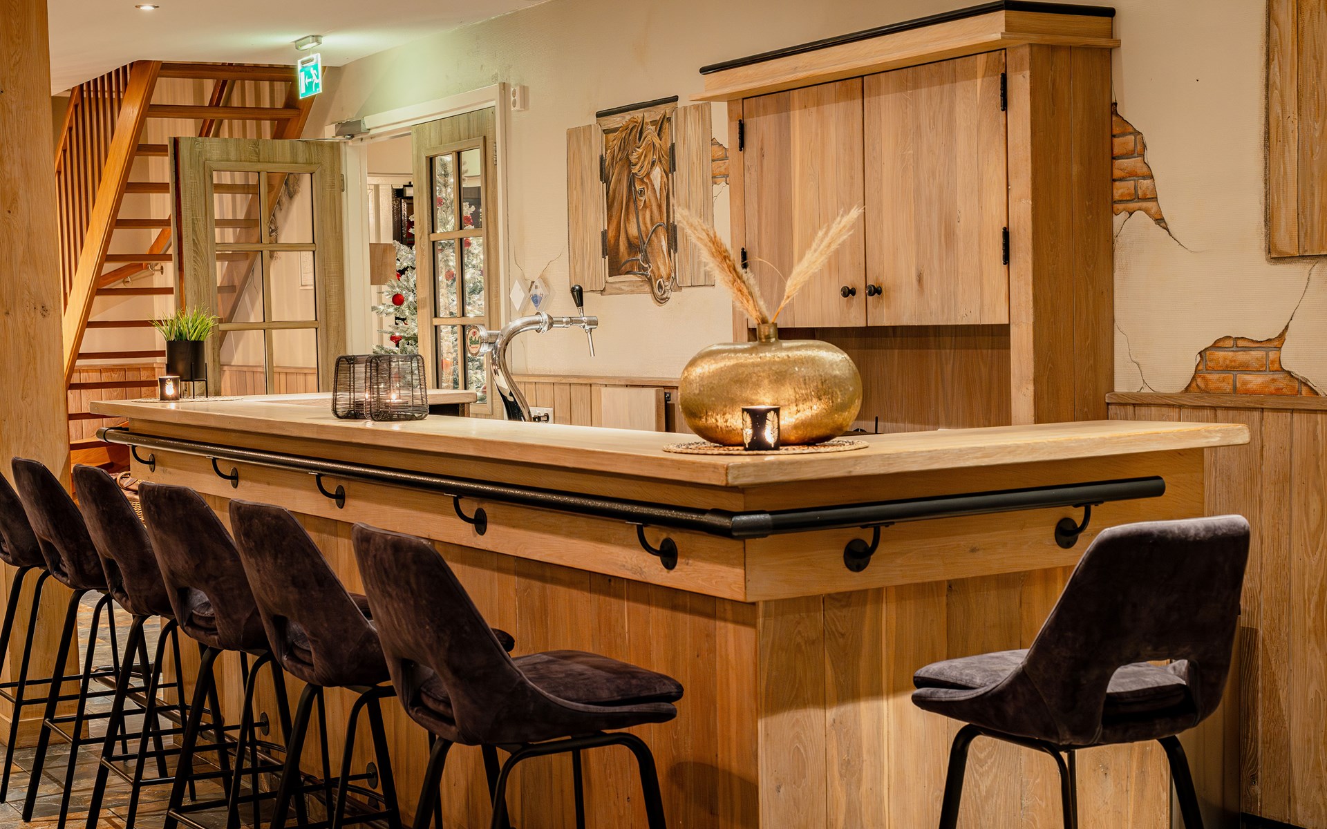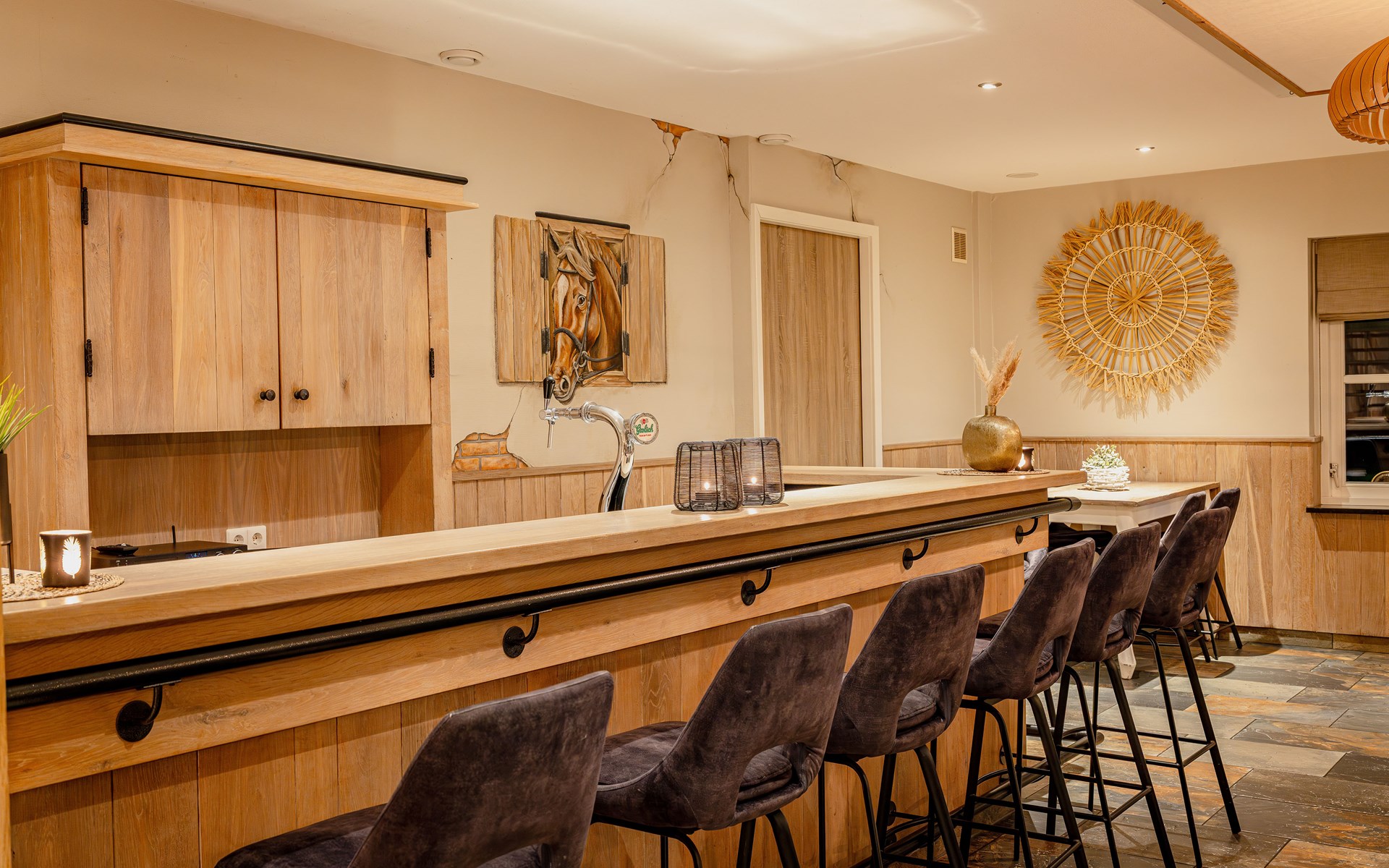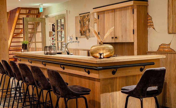 In the living room, you can relax in the chair and enjoy the fireplace after a walk in the woods. For a cozy evening, you can hire a bartender or take on the role yourself behind the private bar.