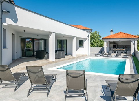 If you are looking for a charming villa close to the sea, then the beautiful Villa Kalista Istriana is the perfect choice for you. This villa is a terraced house located in the small Istrian town and is perfect for a lovely family vacation. In front of the villa is a large private pool where you can enjoy sunny days with your favorite drink in hand. Outside you will also find a covered terrace with barbecue and dining table where you will enjoy the romantic atmosphere on summer evenings with family and friends. But that's not all - a jacuzzi awaits you on the covered terrace, where you can relax to the full!
