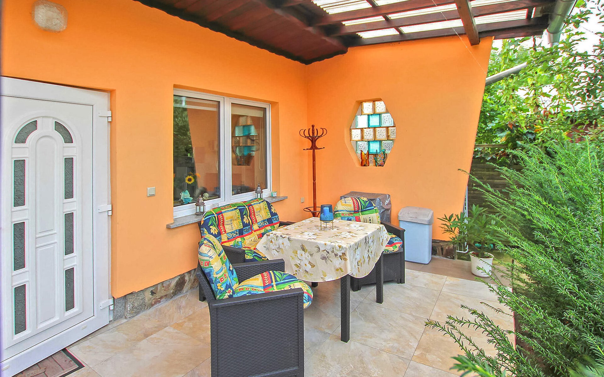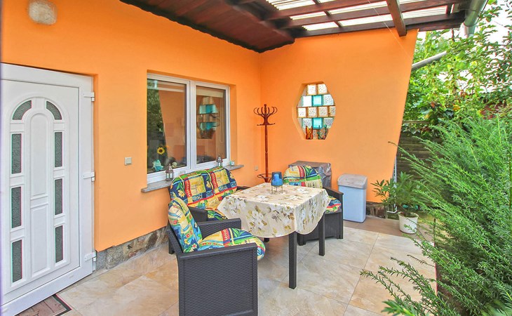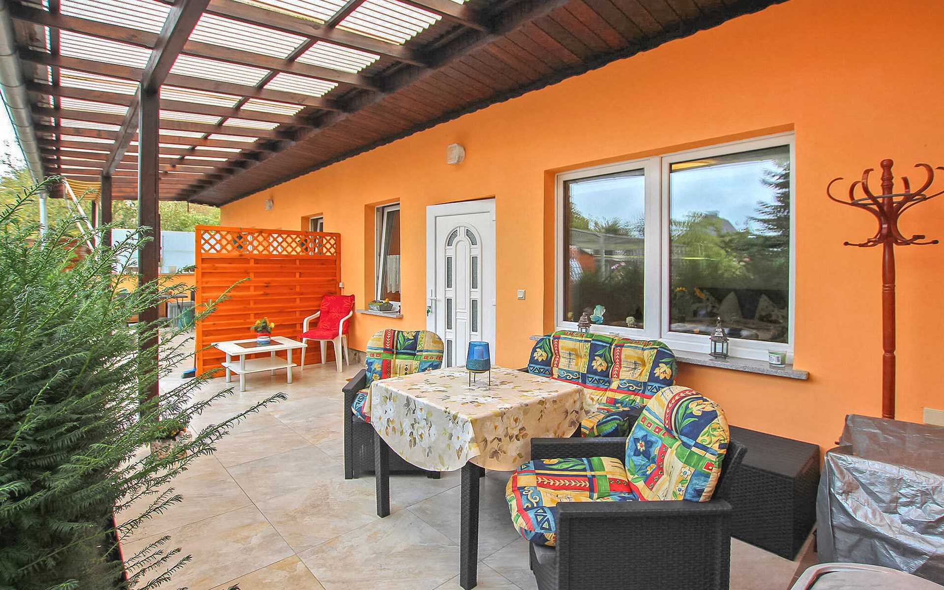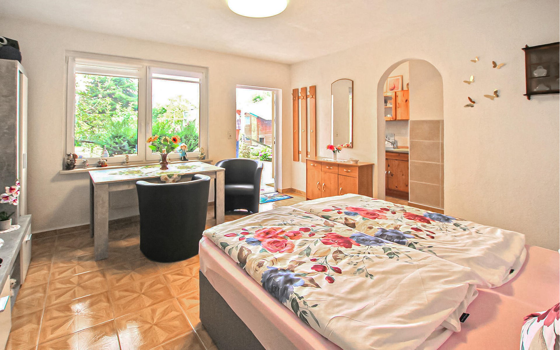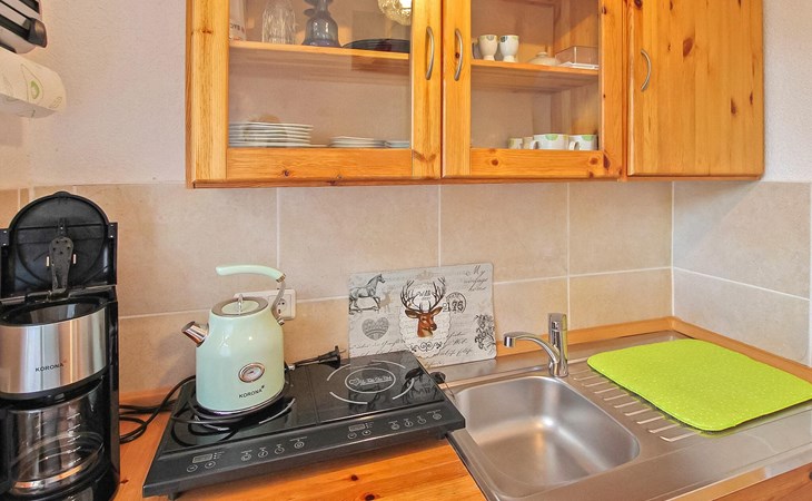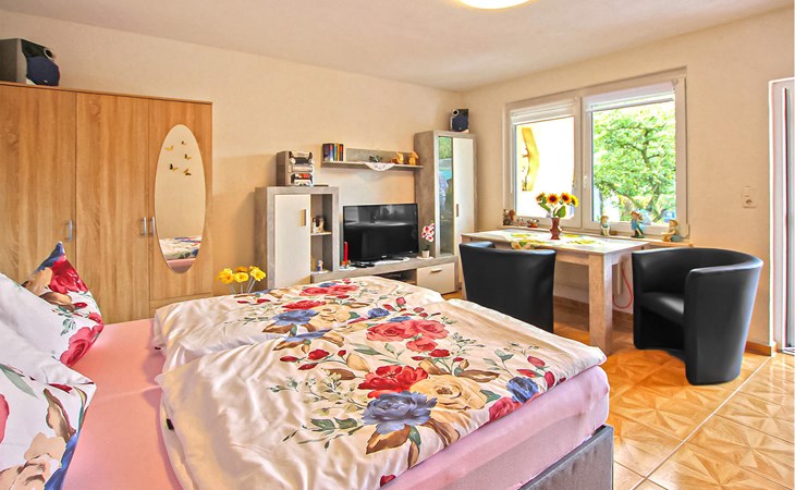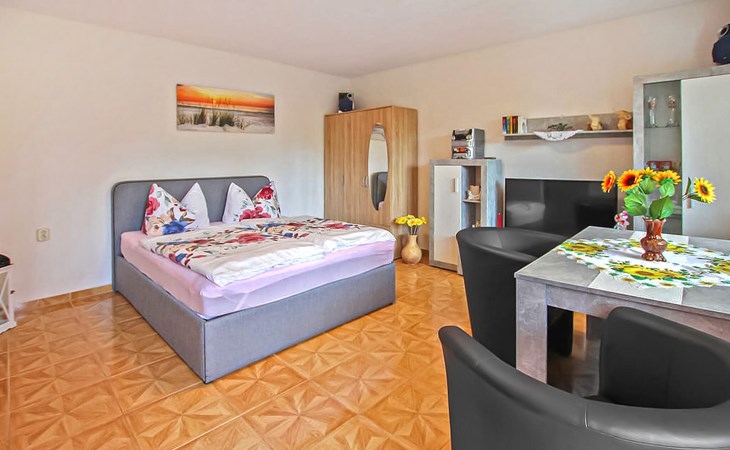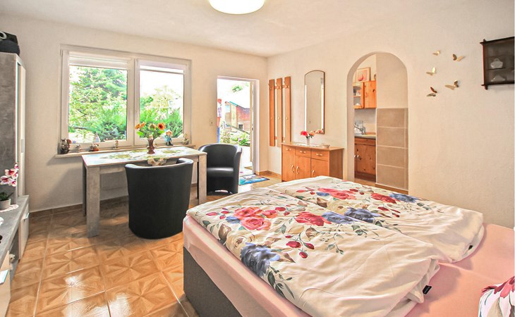 The approx. 36 square metre, ground-floor, non-smoking house with separate entrance is equipped with a combined living room/bedroom (double bed, dining table, flat-screen TV, radio, CD player, small sitting area), a small separate kitchen (hotplates, fridge with freezer, various small kitchen appliances) and a recently renovated bathroom (shower, WC). There is also a large covered and furnished terrace, barbecue, bicycle storage and storage facilities, electric heating and a car park. The owner keeps chickens and offers fresh eggs on request (for a fee), fruit from the garden can be harvested by arrangement.