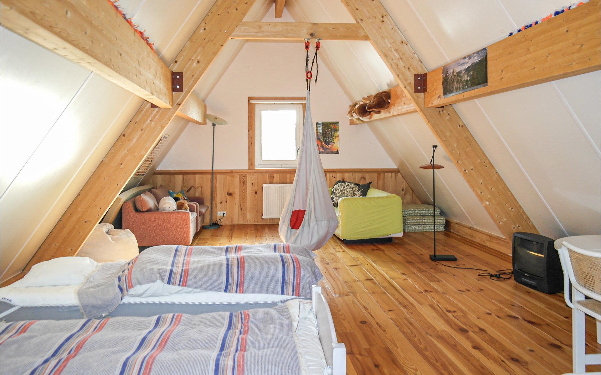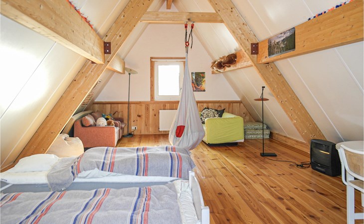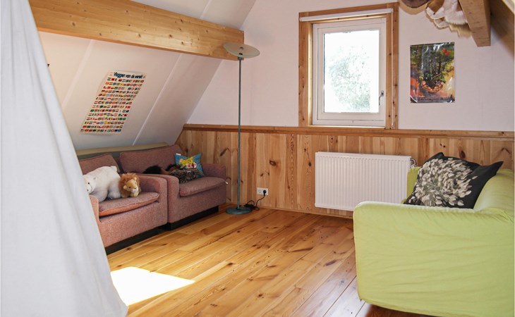 On the second floor there are 2 cozy bedrooms with access to the balcony. A spacious bathroom with separate bath, shower and double sinks. On the second is floor a very spacious and high loft with 2 single beds and set up as a children's playroom. A beautiful room with a magnificent view, even with some sea view!