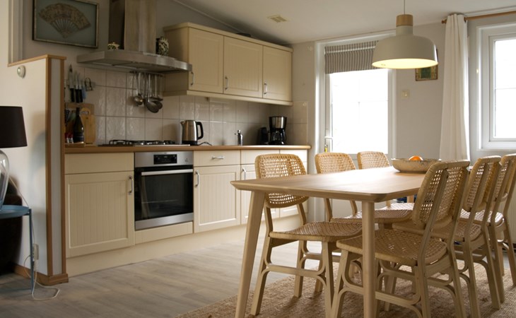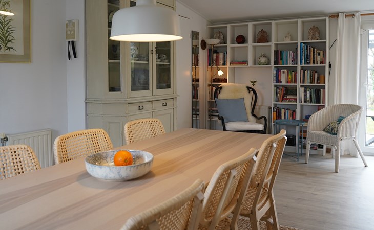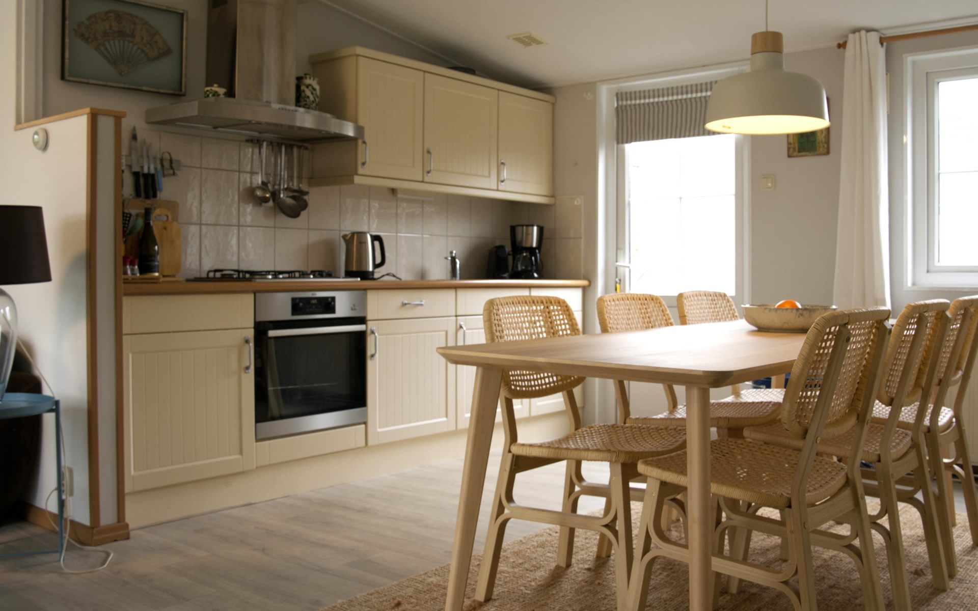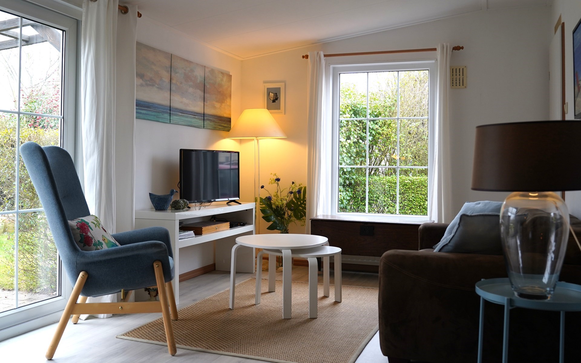 "De Groene Hoek" has a spacious living room with an open kitchen. The living room has a cozy sitting area with a sofa and 2 chairs around the television. The round dining area seats 4 people.