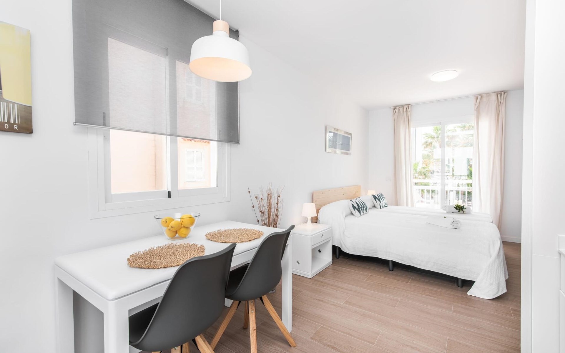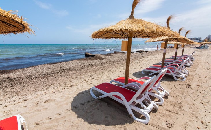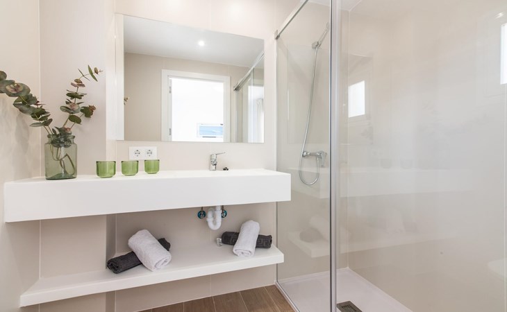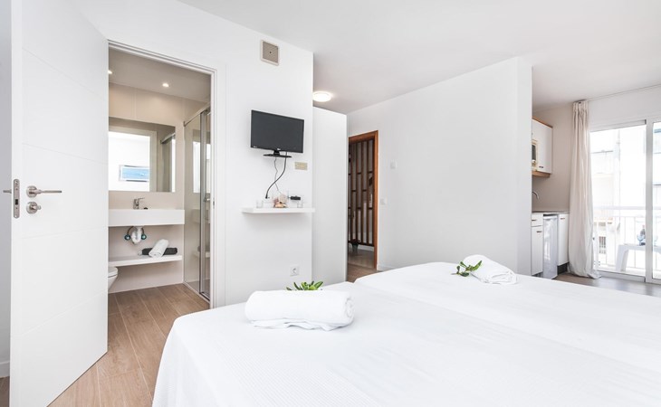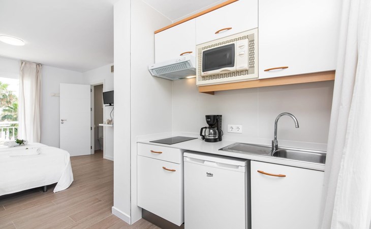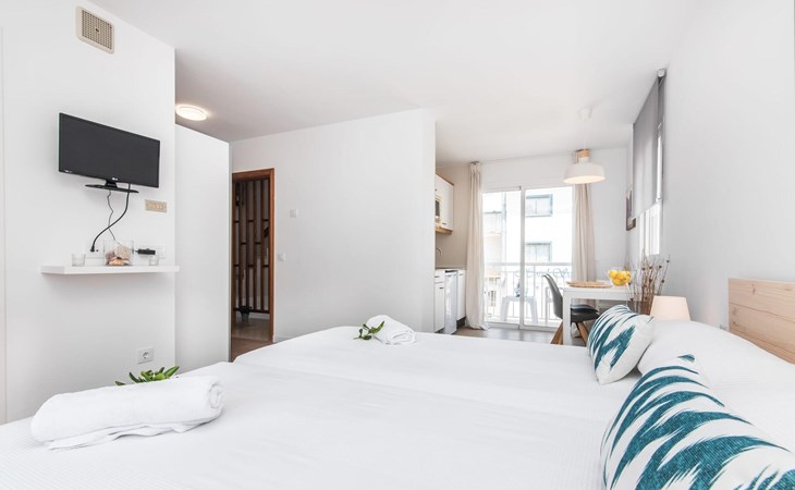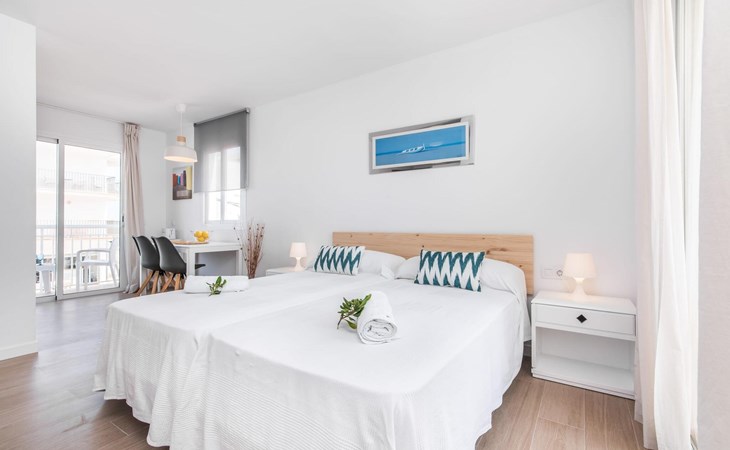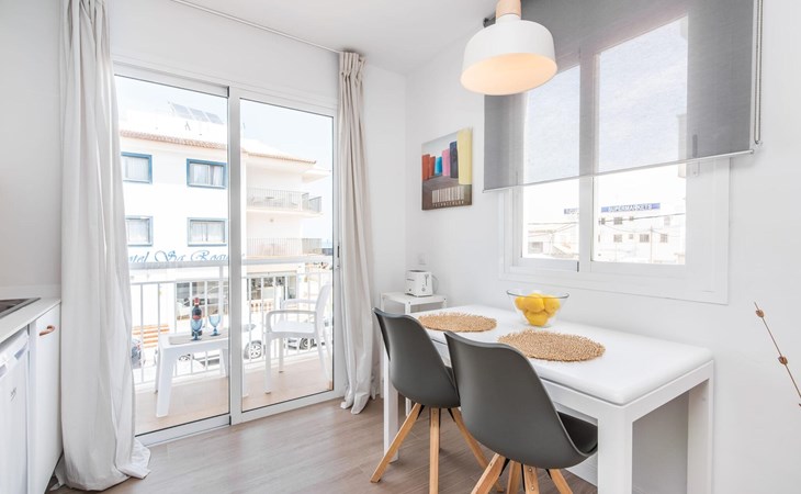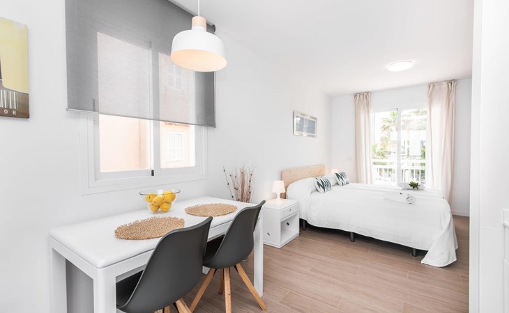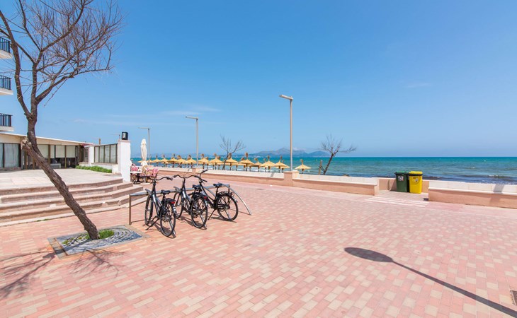 Thanks to an ingenious room concept, the Confluentia Playa 9 holiday apartment offers a cosy living area with plenty of natural light. It is open-plan and consists of a neat sleeping and dining area equipped with German and English satellite TV and an integrated kitchen with direct access to the balcony. This is a great place to spend time together indoors and ideal for self-catering. Lots of white and some colourful accents create a fresh, summery flair. The presence of heating and air conditioning ensures perfect indoor temperatures at all times. A chic, modern bathroom with a walk-in shower rounds off the inviting living comfort of this holiday apartment for two in Mallorca. The modern Confluentia Playa 9 holiday apartment is located near the centre of Can Picafort and directly on the north coast of Mallorca. In this beautiful village you will find restaurants, bars, discos and a variety of shopping facilities. The sandy beach is within walking distance and the bay of Alcúdia is just a few metres away. The area around Can Picafort is also ideal for cycling.