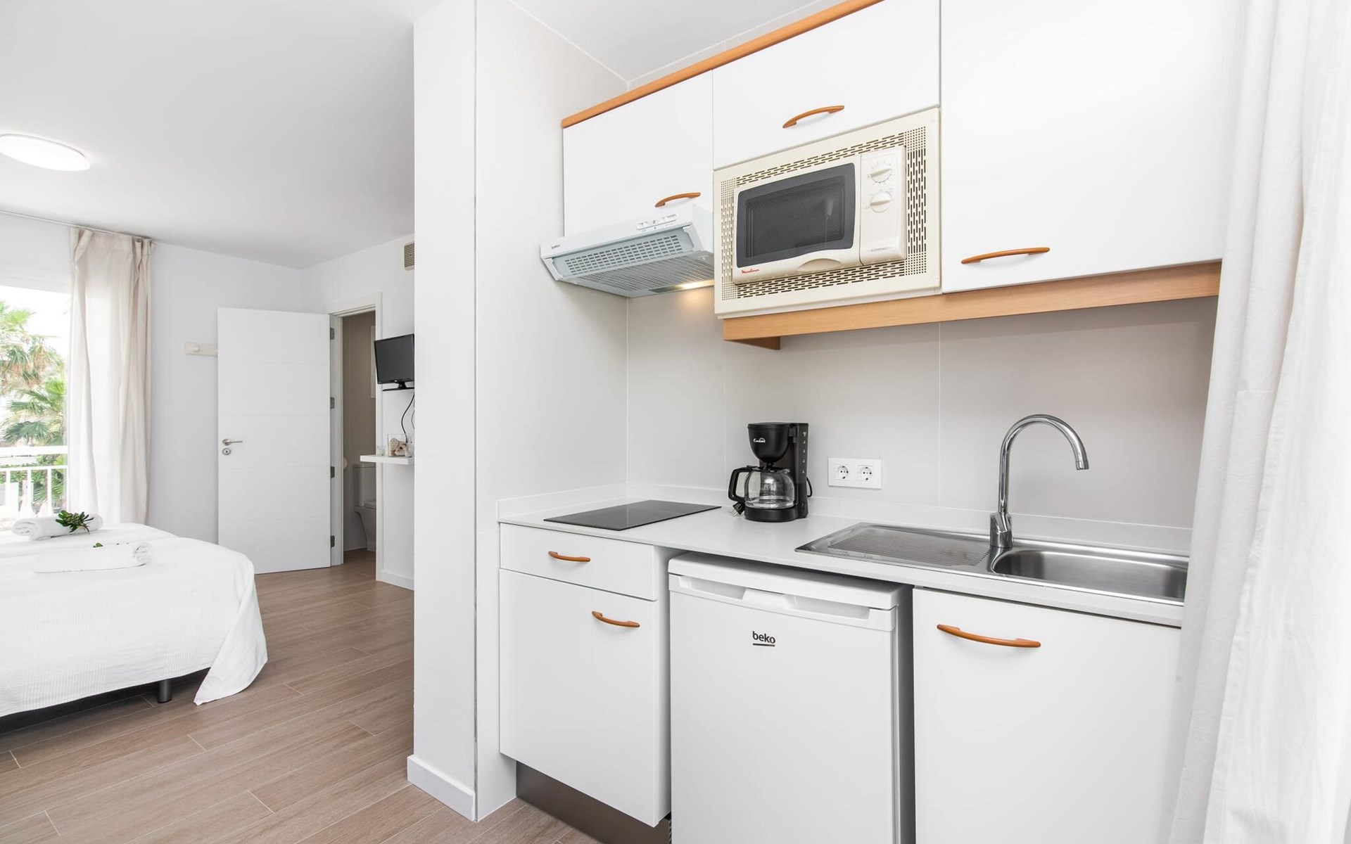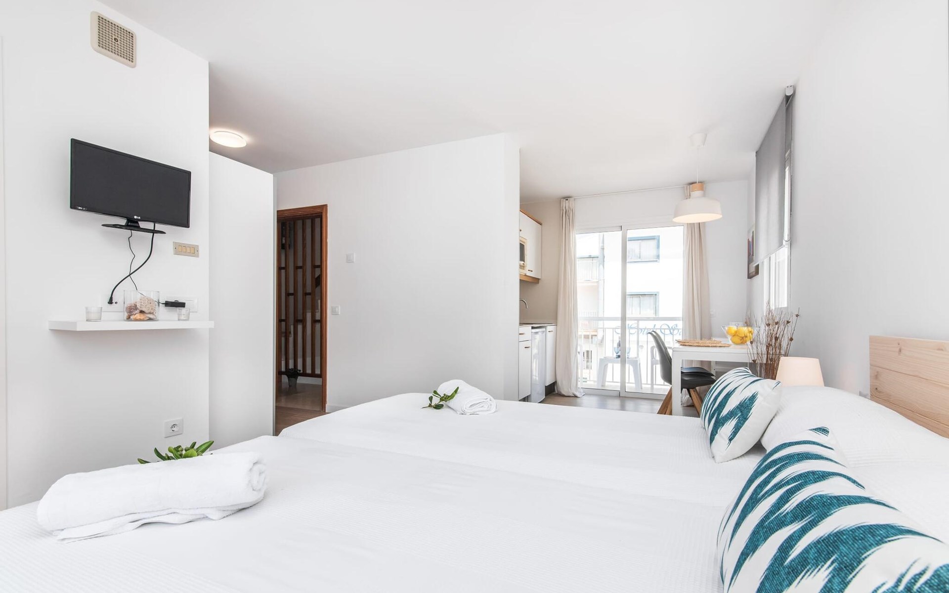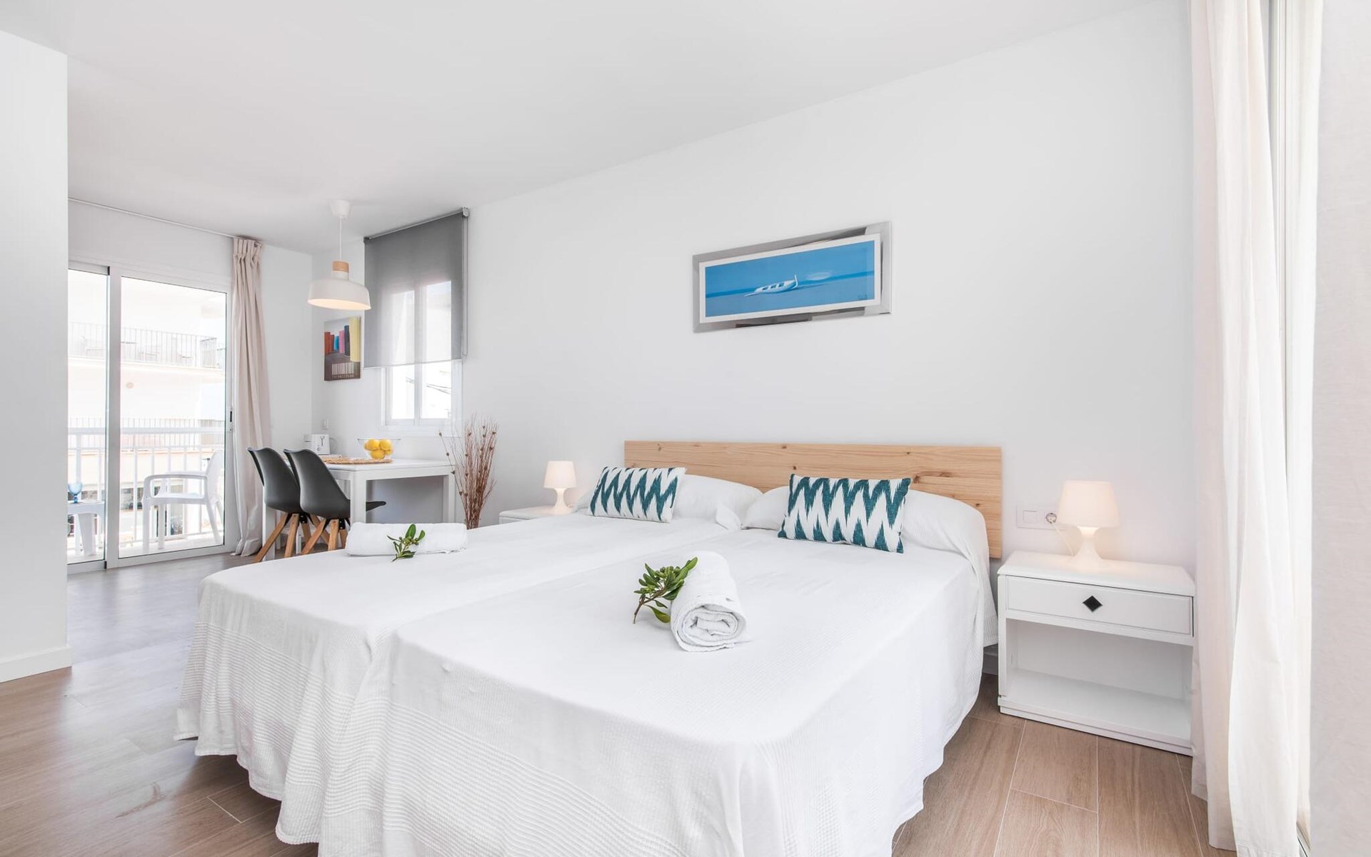 Thanks to an ingenious room concept, the Confluentia Playa 9 holiday apartment offers a cosy living area with plenty of natural light. It is open-plan and consists of a neat sleeping and dining area equipped with German and English satellite TV and an integrated kitchen with direct access to the balcony. This is a great place to spend time together indoors and ideal for self-catering. Lots of white and some colourful accents create a fresh, summery flair. The presence of heating and air conditioning ensures perfect indoor temperatures at all times. A chic, modern bathroom with a walk-in shower rounds off the inviting living comfort of this holiday apartment for two in Mallorca. The modern Confluentia Playa 9 holiday apartment is located near the centre of Can Picafort and directly on the north coast of Mallorca. In this beautiful village you will find restaurants, bars, discos and a variety of shopping facilities. The sandy beach is within walking distance and the bay of Alcúdia is just a few metres away. The area around Can Picafort is also ideal for cycling.